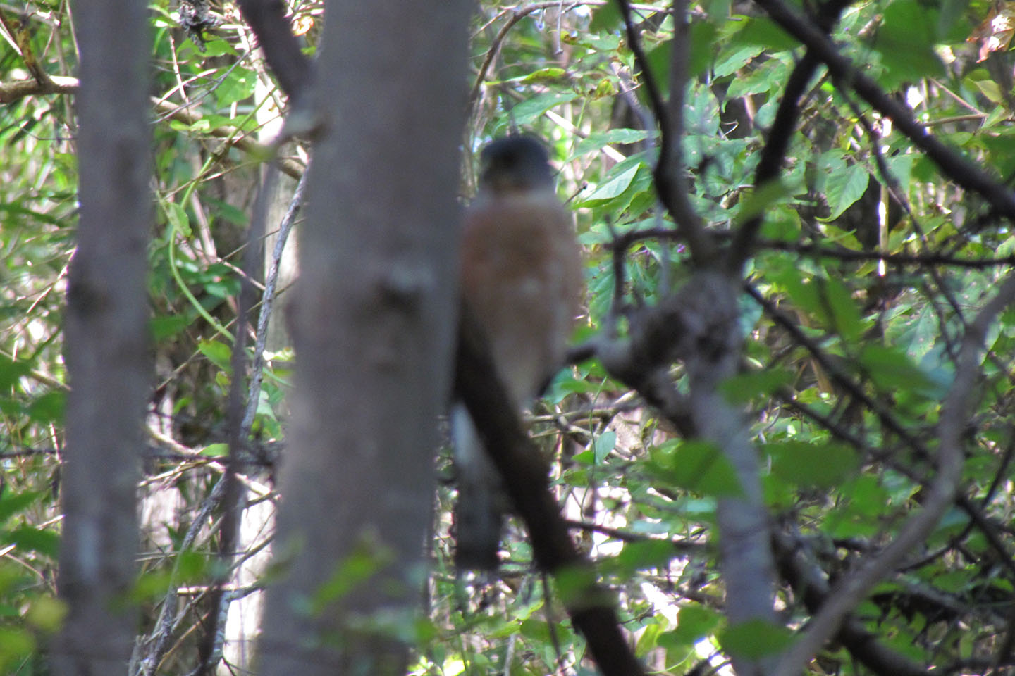 チョウゲンボウは、♂♀幼鳥いずれも背や翼は茶褐色で、写真のように後ろから見て全部が青黒っぽく見えることはありませんし、胸や腹に縦斑があります。開けた場所の鳥ですので、写真のように混んだ枝の間にとまることは、滅多にありません。他の場所で撮られたチョウゲンボウの写真と比べてみて下さい。