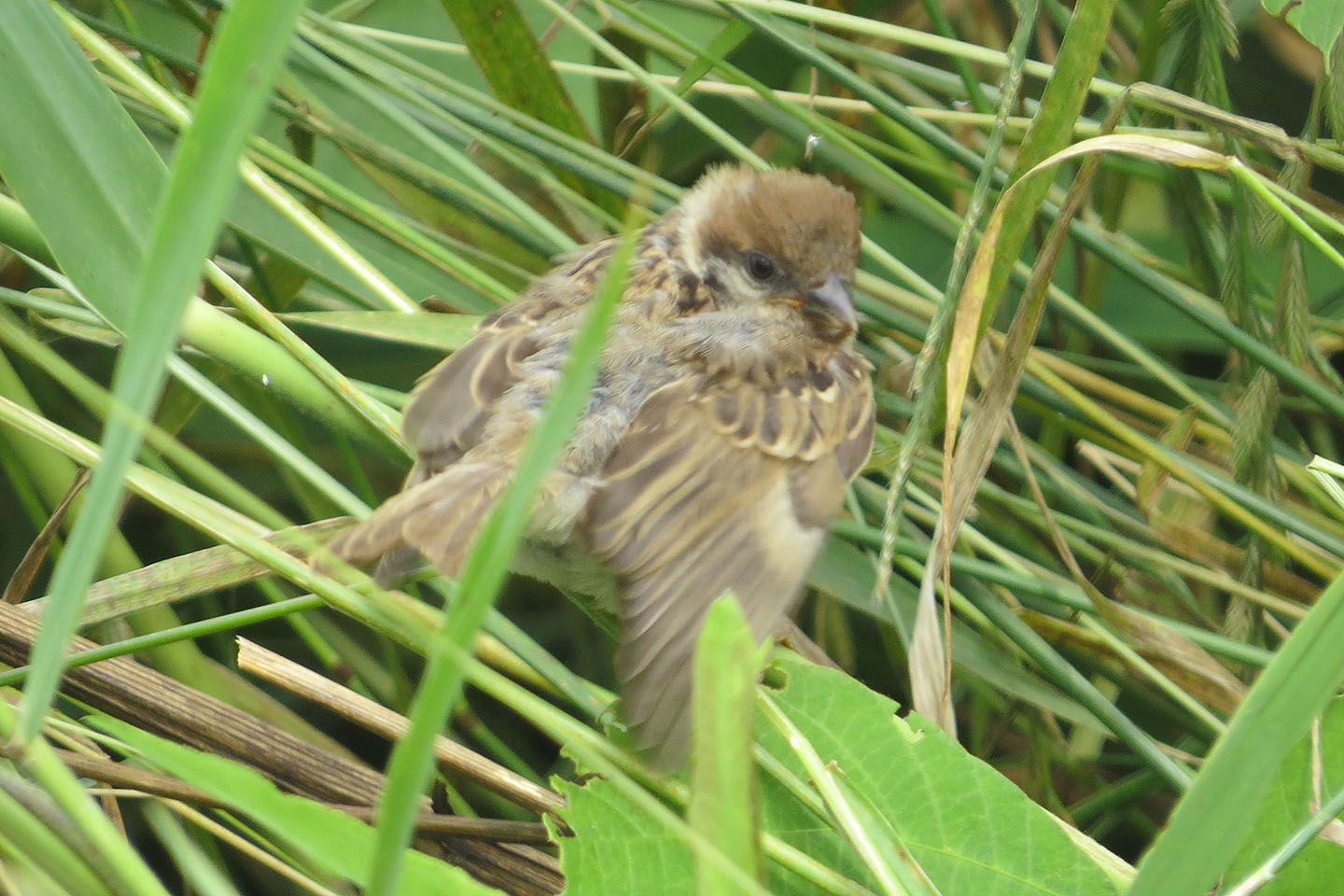 スズメの若鳥が、親鳥と一緒にいましたが、まだまだもたついていました。谷本川の横の草地です。