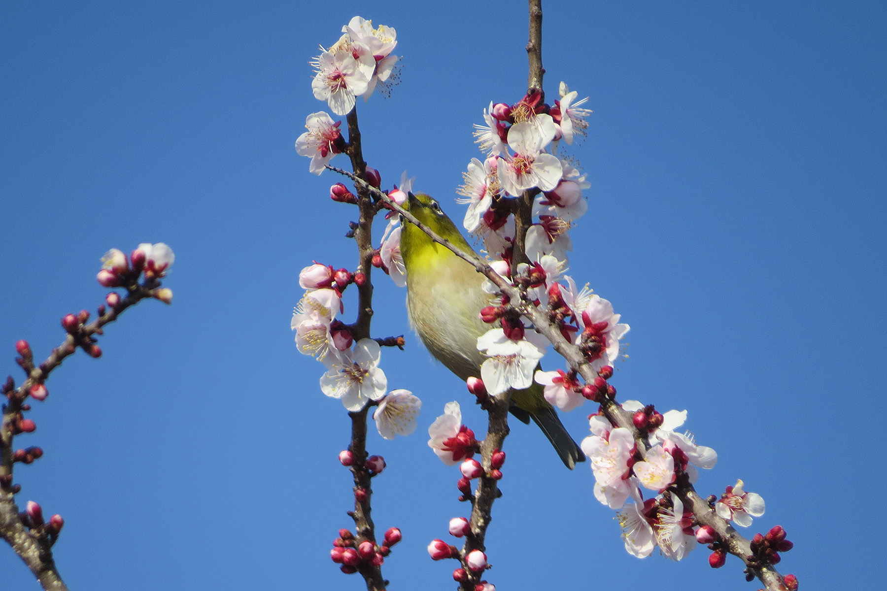 青空バックに満開の梅の白とメジロの落ち着いた緑。綺麗ですね。しかし、よく間違えられる「梅に鶯(ウグイス)」は、縁起が良い並びものの例えだそうです。野鳥が好きな方ならウグイスが梅で「ホーホケキョ」と囀ってくれるシーンは正に憧れであって、滅多に見られないというか、普通はあり得ないわけです。