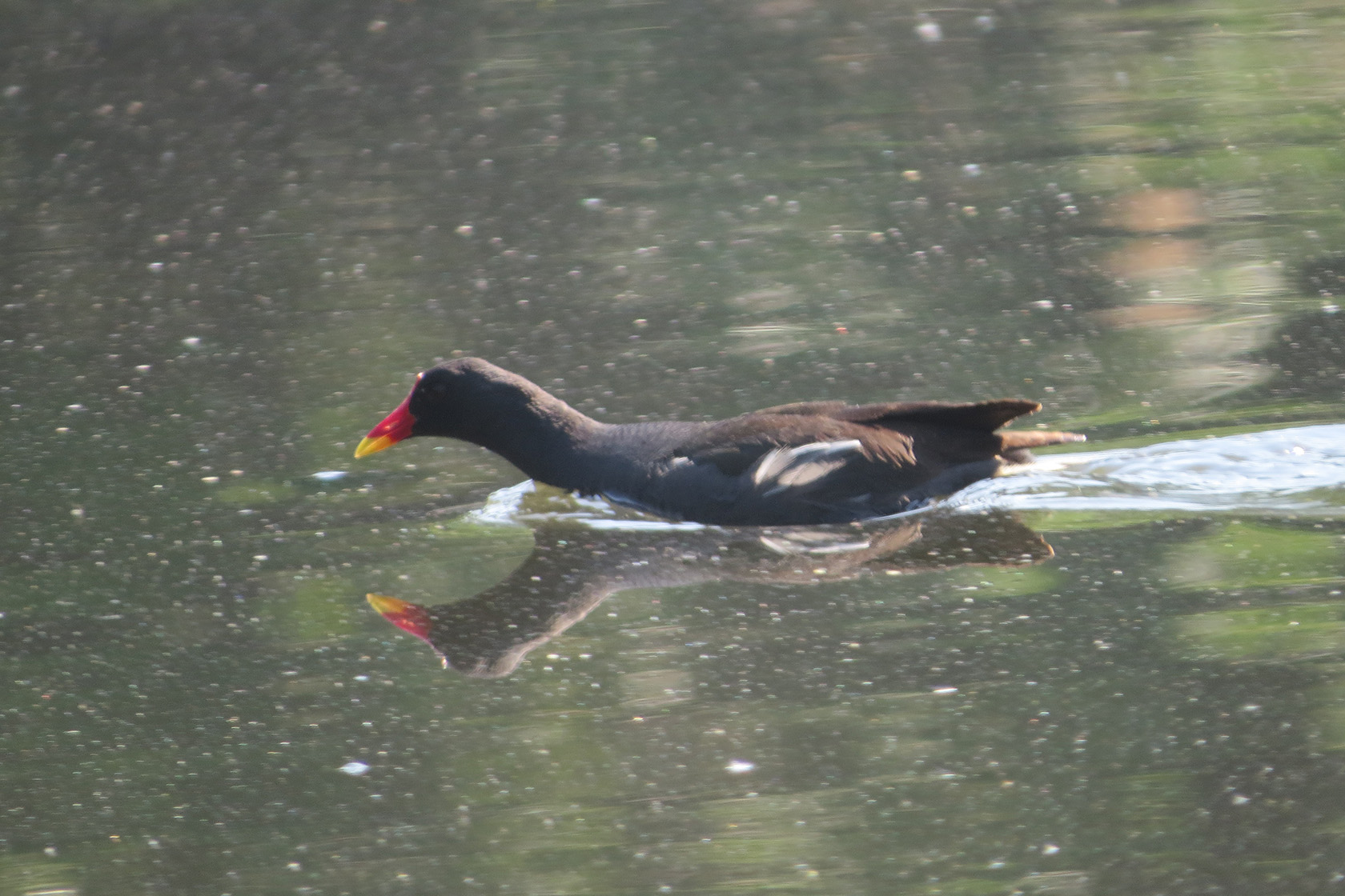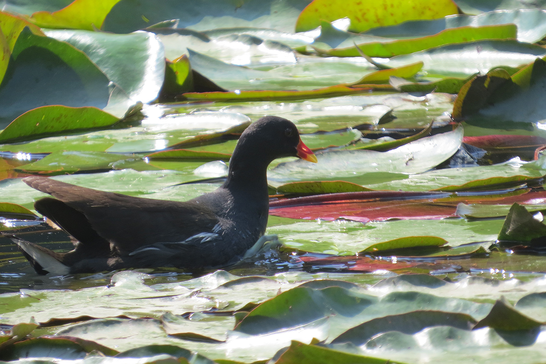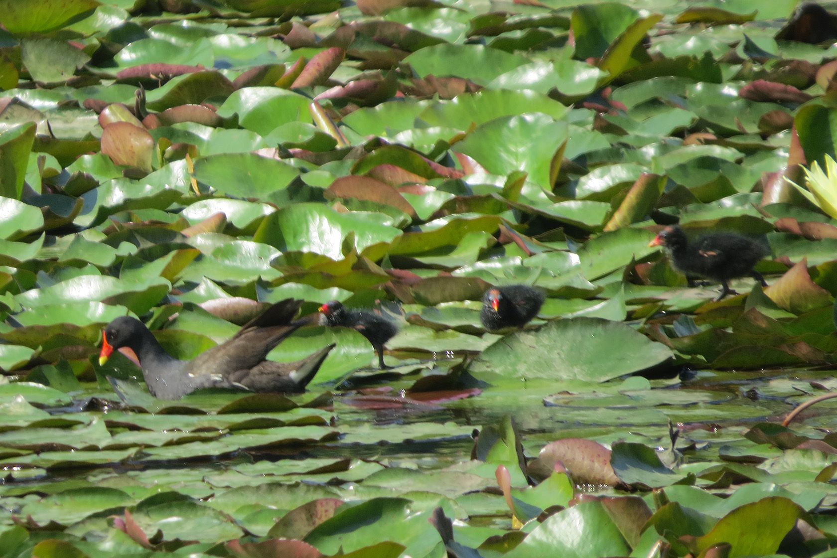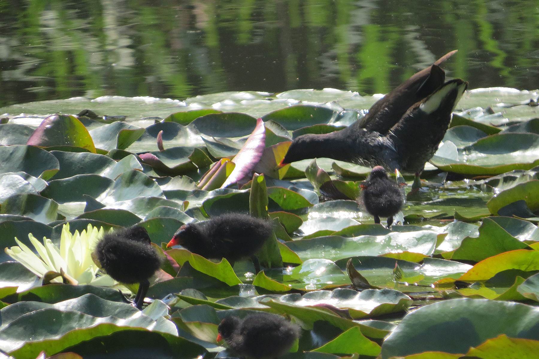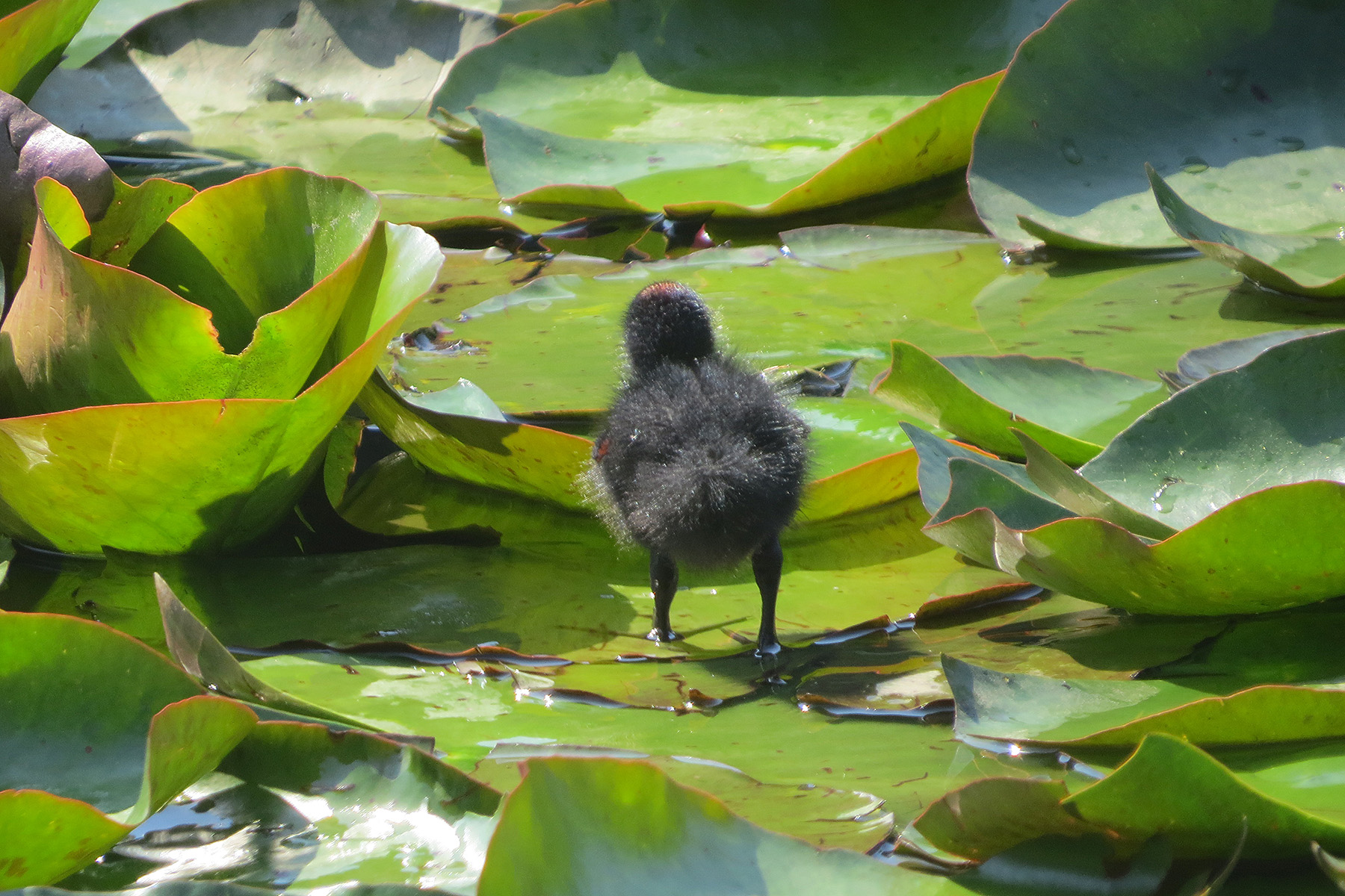 遠くから見たら、こんな感じでした。睡蓮の浮島エリアに何やら小さくて黒い蠢いているのが!バン雛が元気よく動き回っているではないですか!