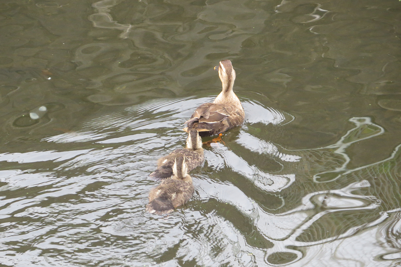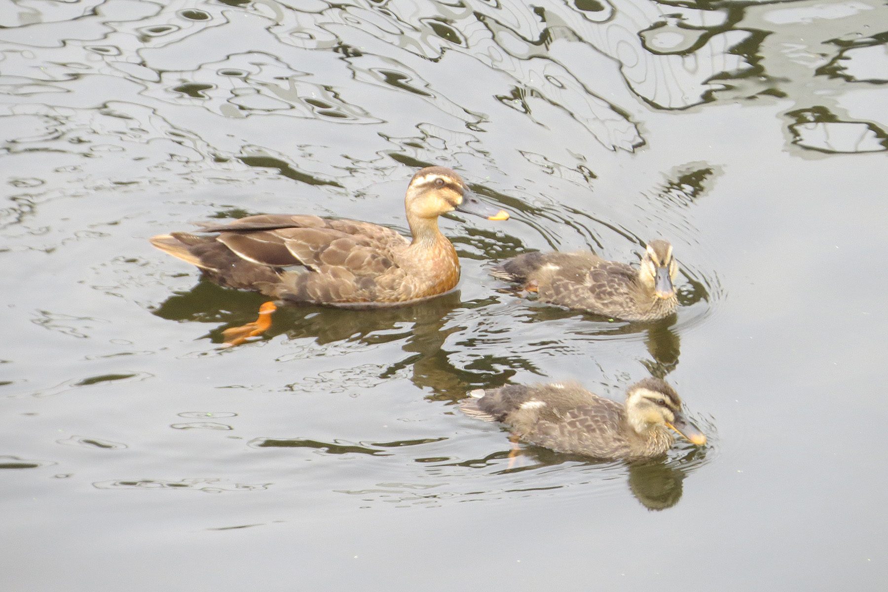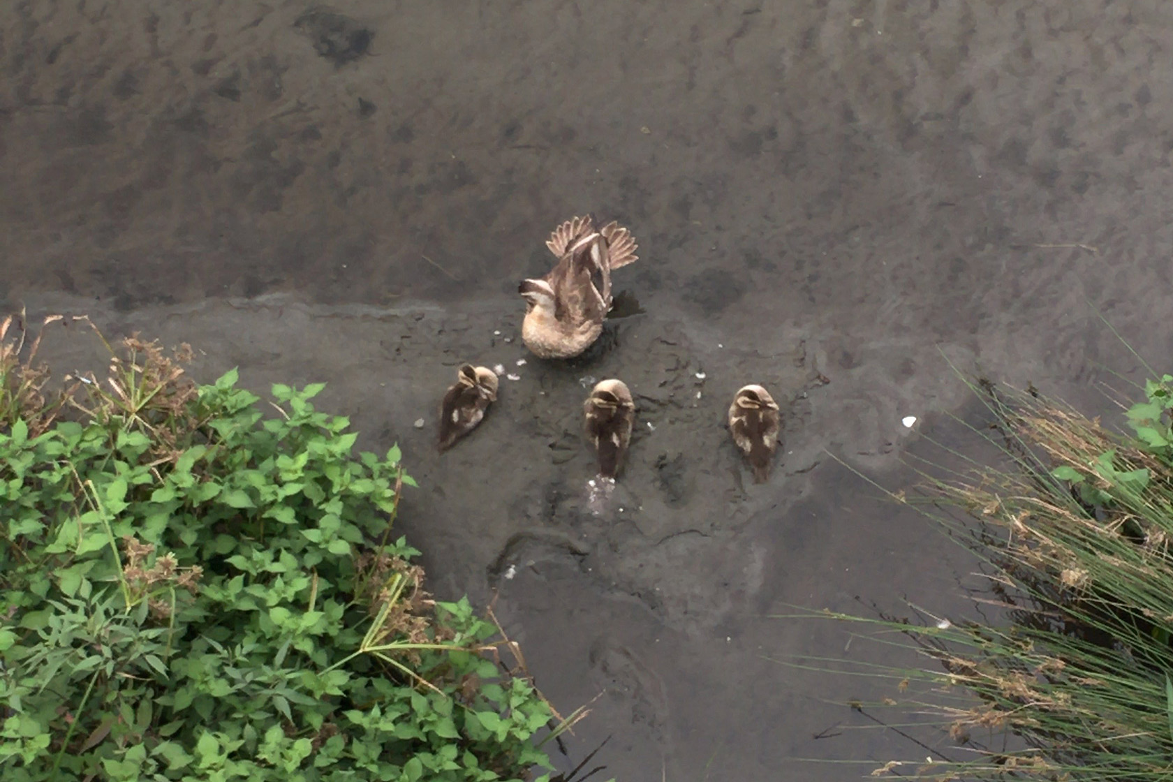 恩田川のやや上流でみた、親鳥1羽と幼鳥3羽。いいポジションでいい感じだったのですが、スマホしか持っておらず。。。