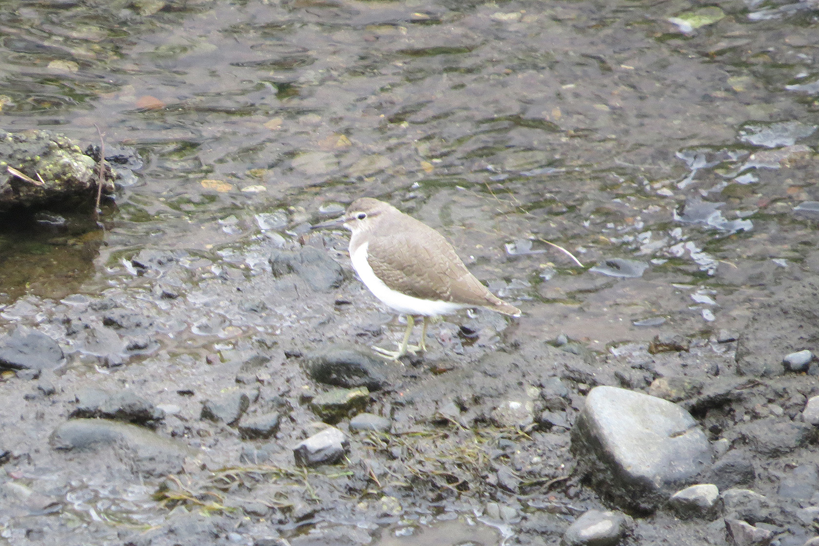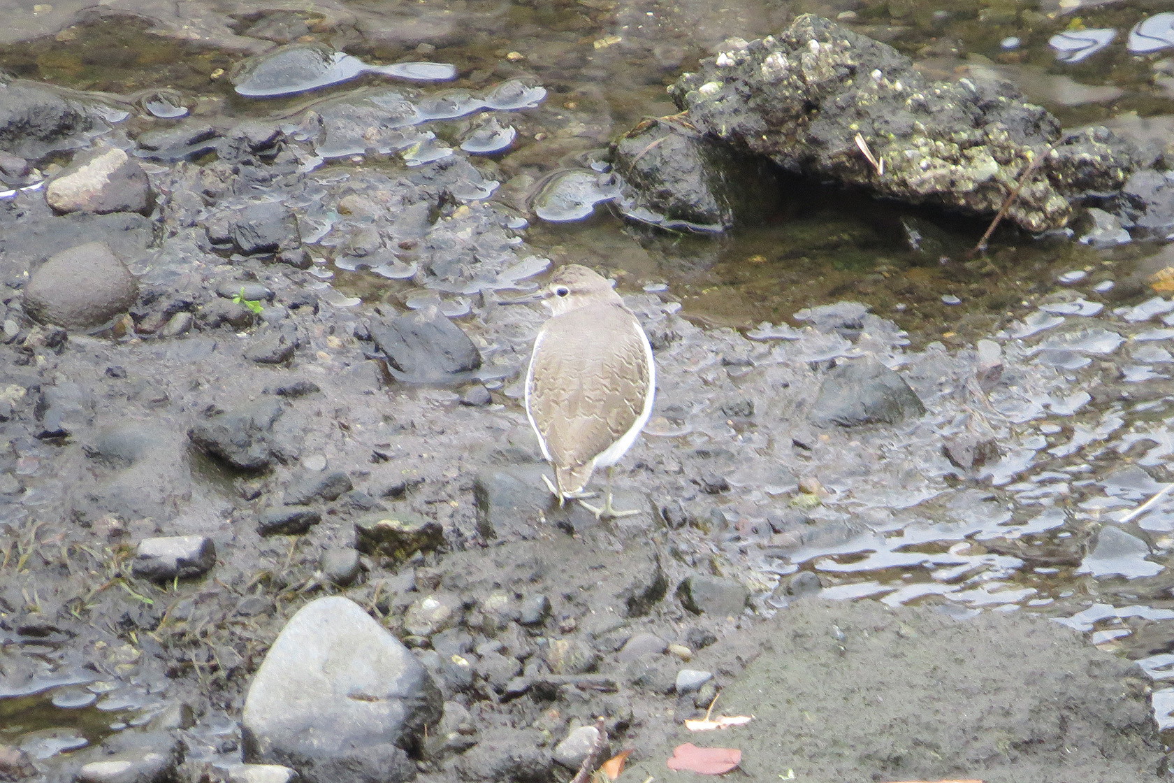 こちらは別個体。ちょっと縮こまって、珍しくあまり動いていません。首をすぼめているとチドリ系っぽくも見えますね。ここいらへんのイソシギは群れることはありません。だいたいいつも1羽です。