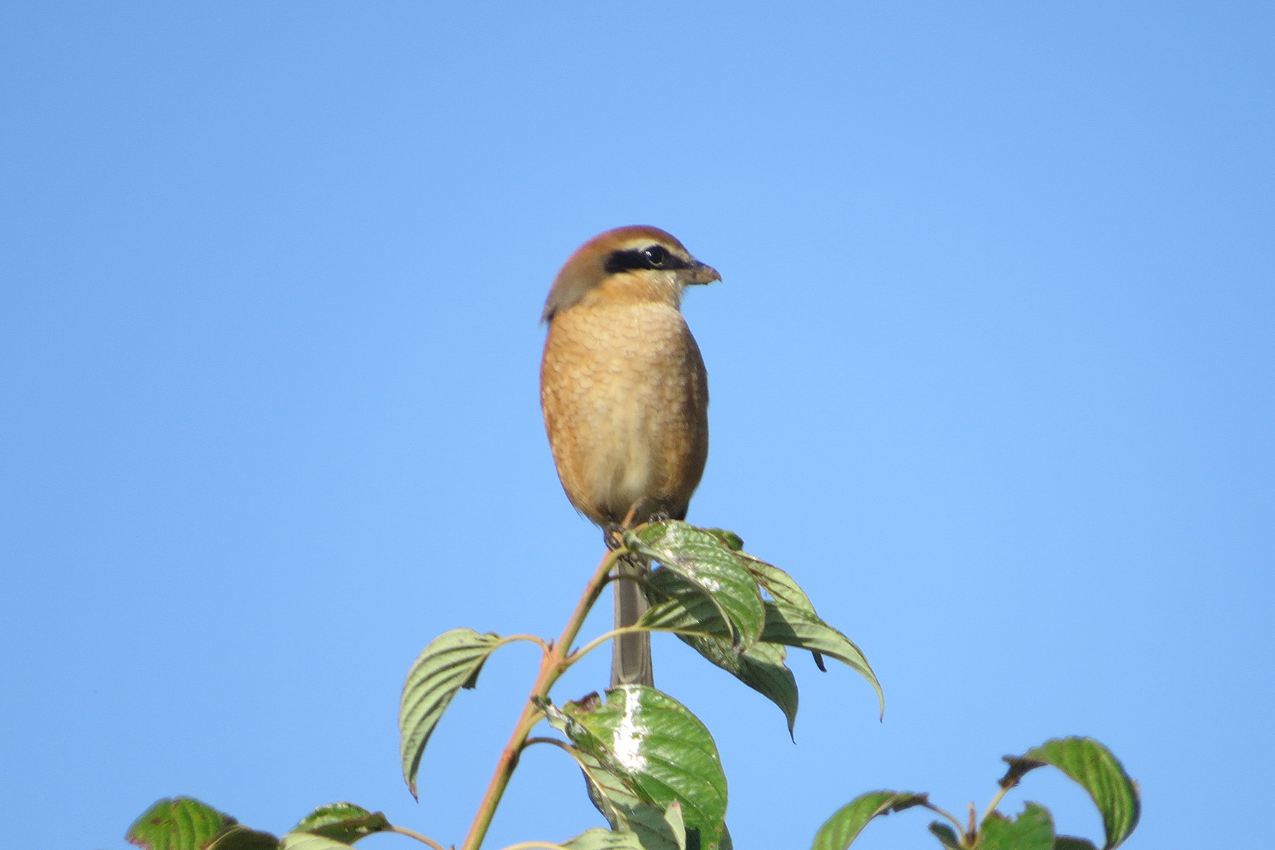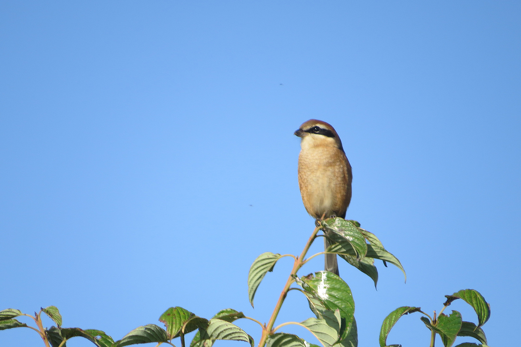 こちらは濃いめのパンキッシュなアイラインがはっきり入っているので雄です。高鳴きは9月の下旬くらいから始まるのが通年のイメージです。だいたい解説にはそれくらいから始まり、「モズの高啼き七十五日」と言う言葉があり、75日後に霜が降りだすそうです。9月の中旬だとすると11月末には75日後ですが、その時くらいまでに田んぼも稲刈りを終わらせようと言う目安にもなっているそうです。