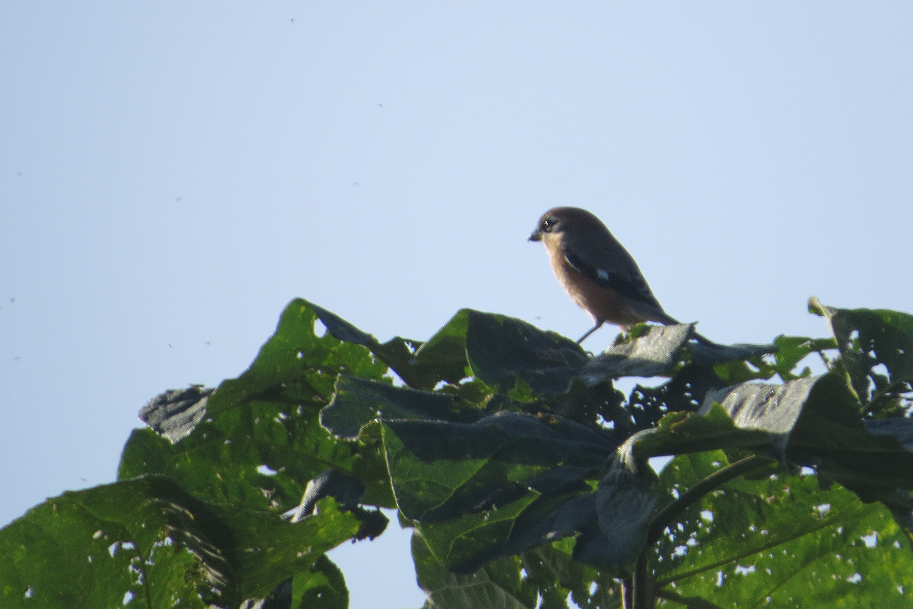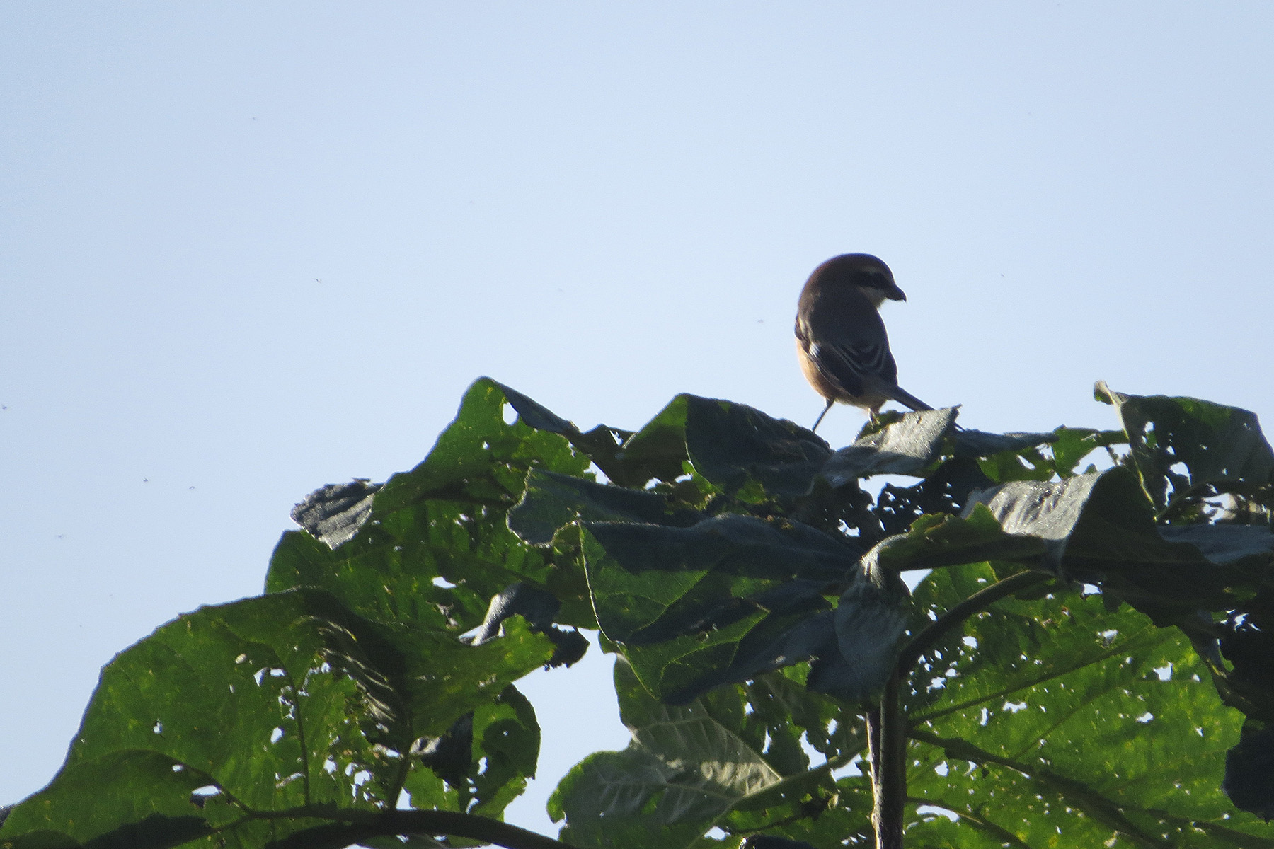こちらは別の個体ですが、やはり雄です。そしてだいたい枝の先で高鳴き。そう、早贄を毎シーズン探しているのですが、なかなか見つからないのです。