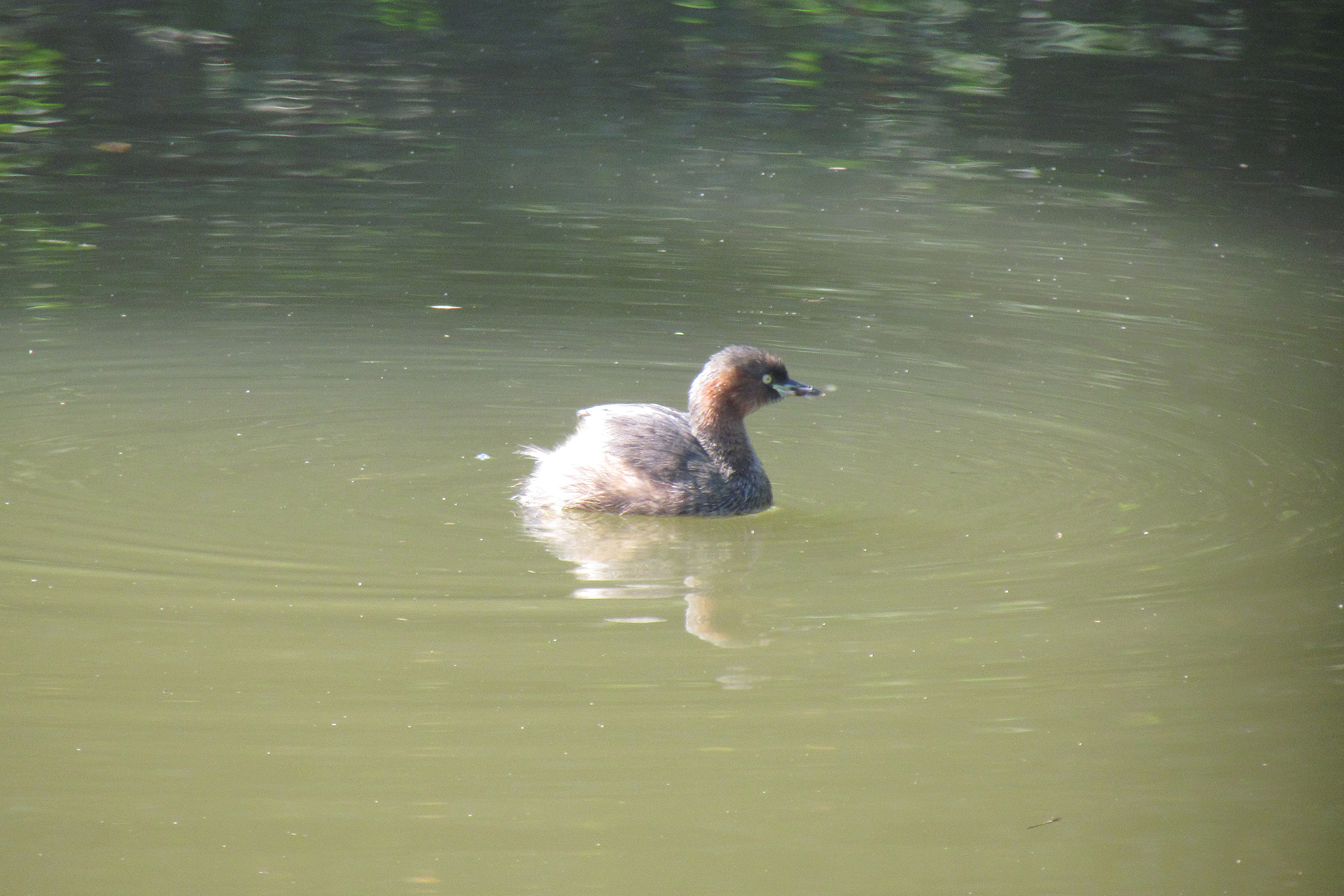 もう秋、カイツブリの遅めに生まれた幼鳥でしょうか? 寺家ふるさと村の新池です。お尻ですみません。