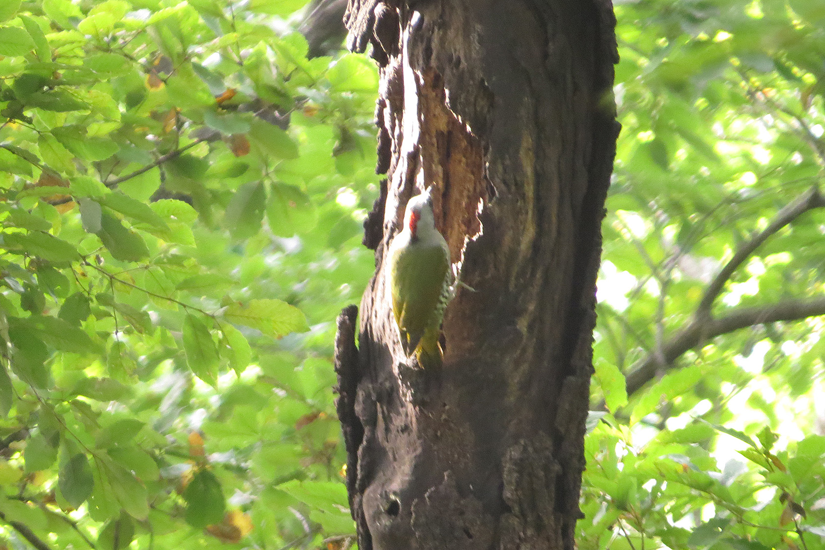 枯れ木を好むと言われていますが、餌となる虫を摂りやすいのでしょうか? 森を眺めていても明らかに枯れ木と、部分的に枯れている木もあります。特に冬は葉が落ちてしまって枯れ木をパッと見分けるのは難しいのですが、枯れ木を狙って探すとアオゲラを発見しやすいのは間違いないようです。