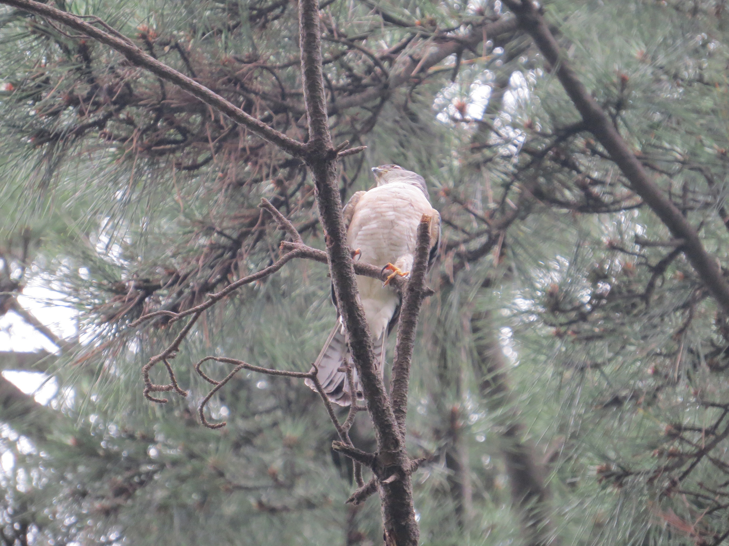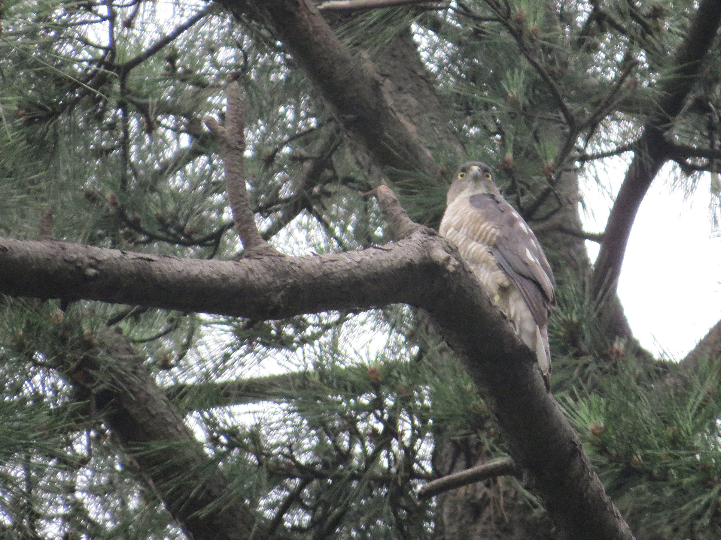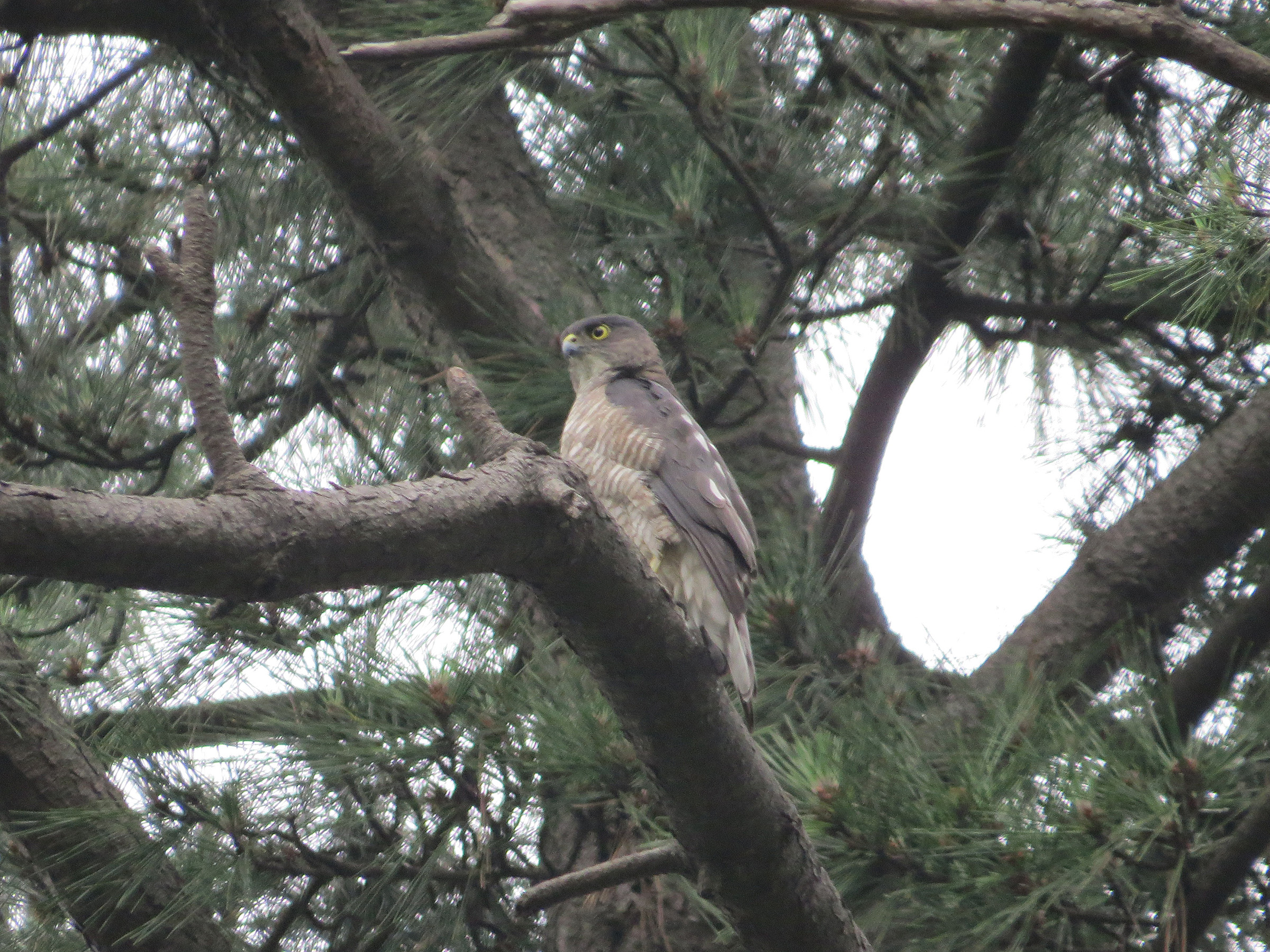 そしてこちらは雌です。ツミは最小の猛禽です。ハトやヒヨドリくらいの大きさしかないのですが、写真だけで見ると、姿形は全く猛禽なので、小さく見えないんですよね。