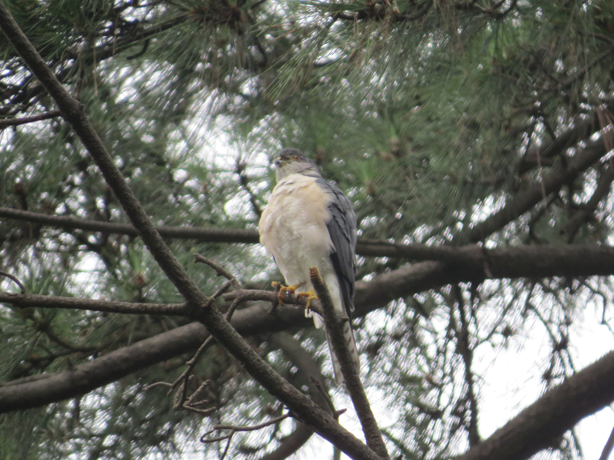 ツミが真上に来ました!のでこんなショットですが、これはこれで良いかなと。真下は飛んでいる時くらいしか撮れないので。見えにくいですが、虹彩が赤っぽいので雄です。枝を咥えいてる?ようにも見えますが。