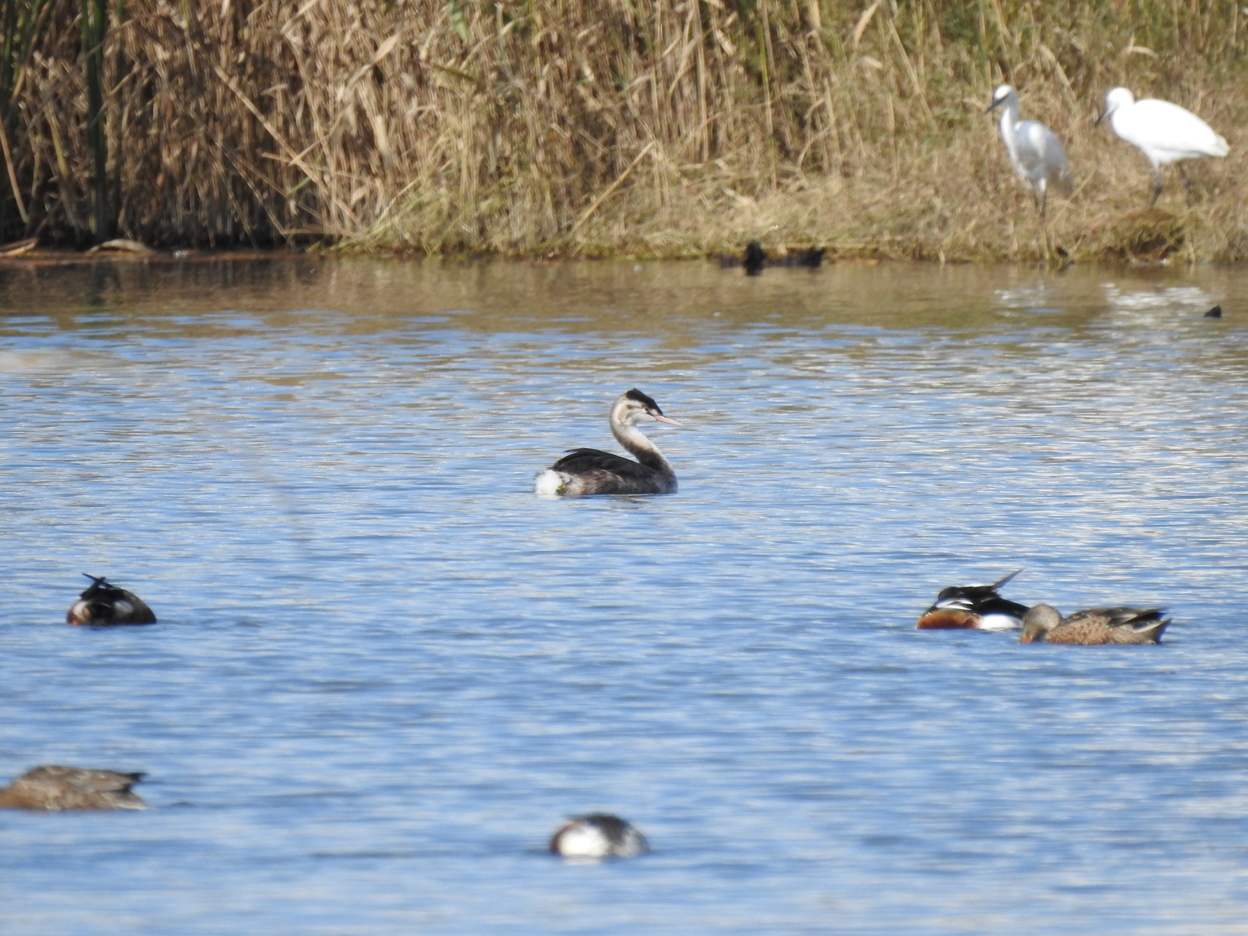 潜りました。カイツブリのように勢いをつけて潜るのではなく、体が大きい分、カワウのような感じでスッと潜ります。日本で見られるカイツブリの仲間は、カイツブリ、ミミカイツブリ、ハジロカイツブリ、アカエリカイツブリ、そしてこのカンムリカイツブリの5種類だそうです。