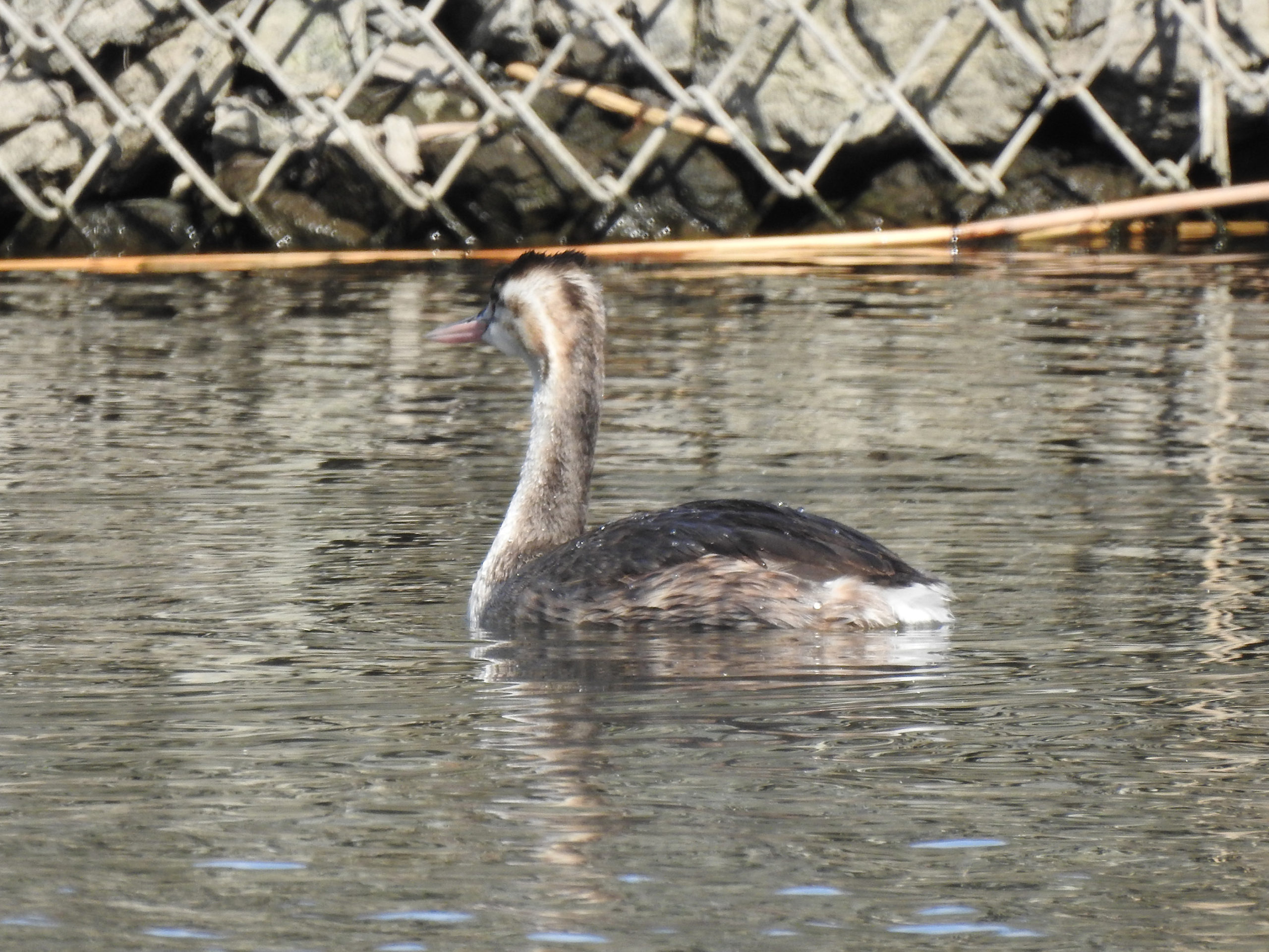 後ろ姿。ほぼ、毎年来ていると思われるこのカンムリカイツブリですが、このまま大池、鶴見川周辺で越冬するのでしょうか?