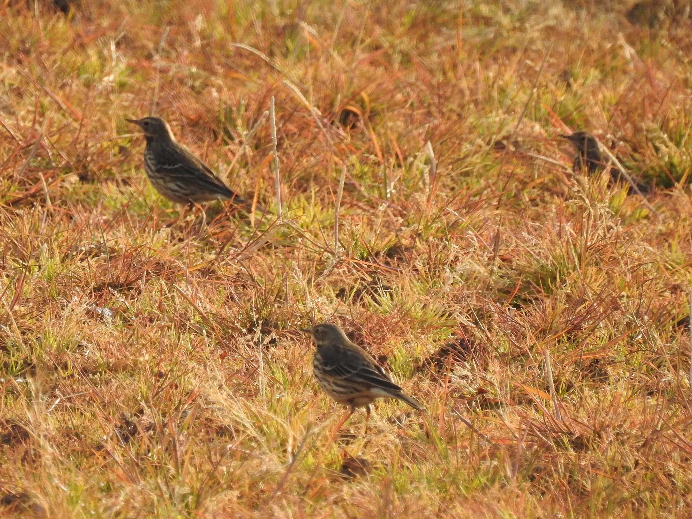 タヒバリが数羽で冬の田んぼにて採餌しておりました。おや?写真の上の方に飛行物体???