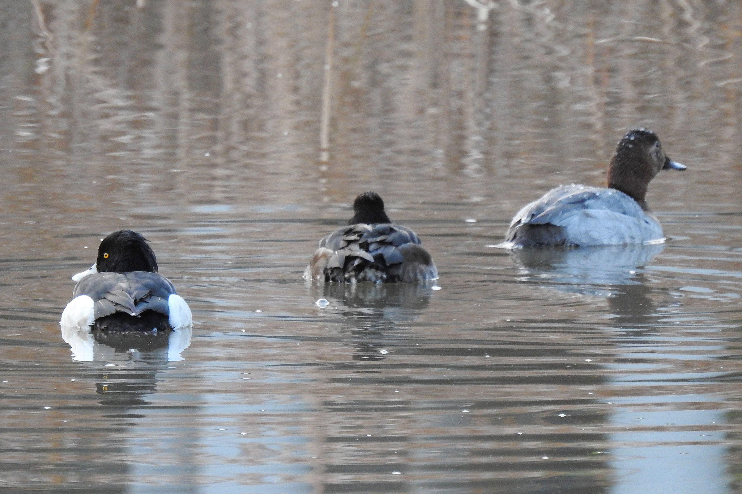 左から、キンクロハジロ雄、雌、ホシハジロ雌です。ホシハジロの頭と翼に水滴が。よく弾きます。