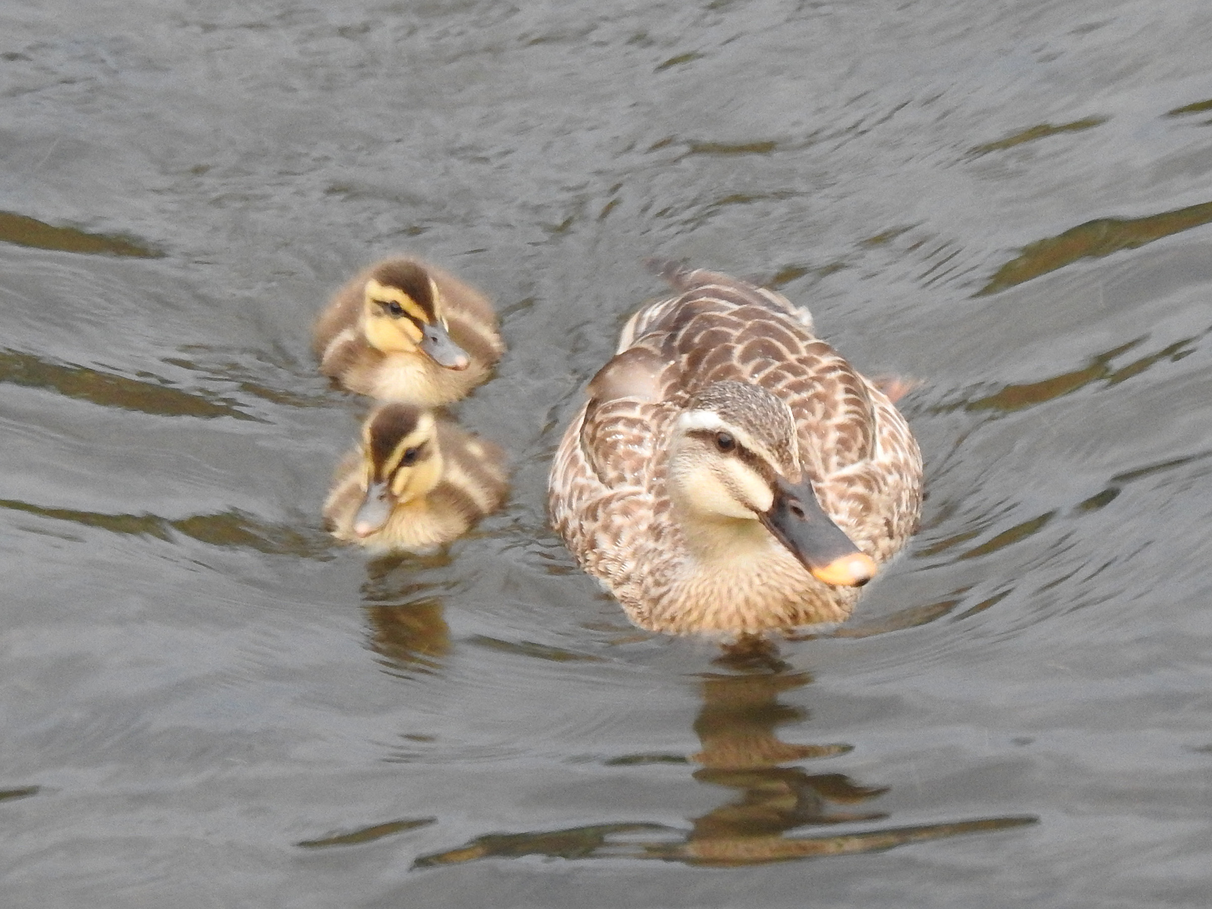 こちらの親子は雛は少し小さめですが、既に2羽。カルガモの嘴は黒で先が黄色です。雛もそうですね。また、カルガモは雌が子育てしますが、雌は少し淡い感じになるとのこと。