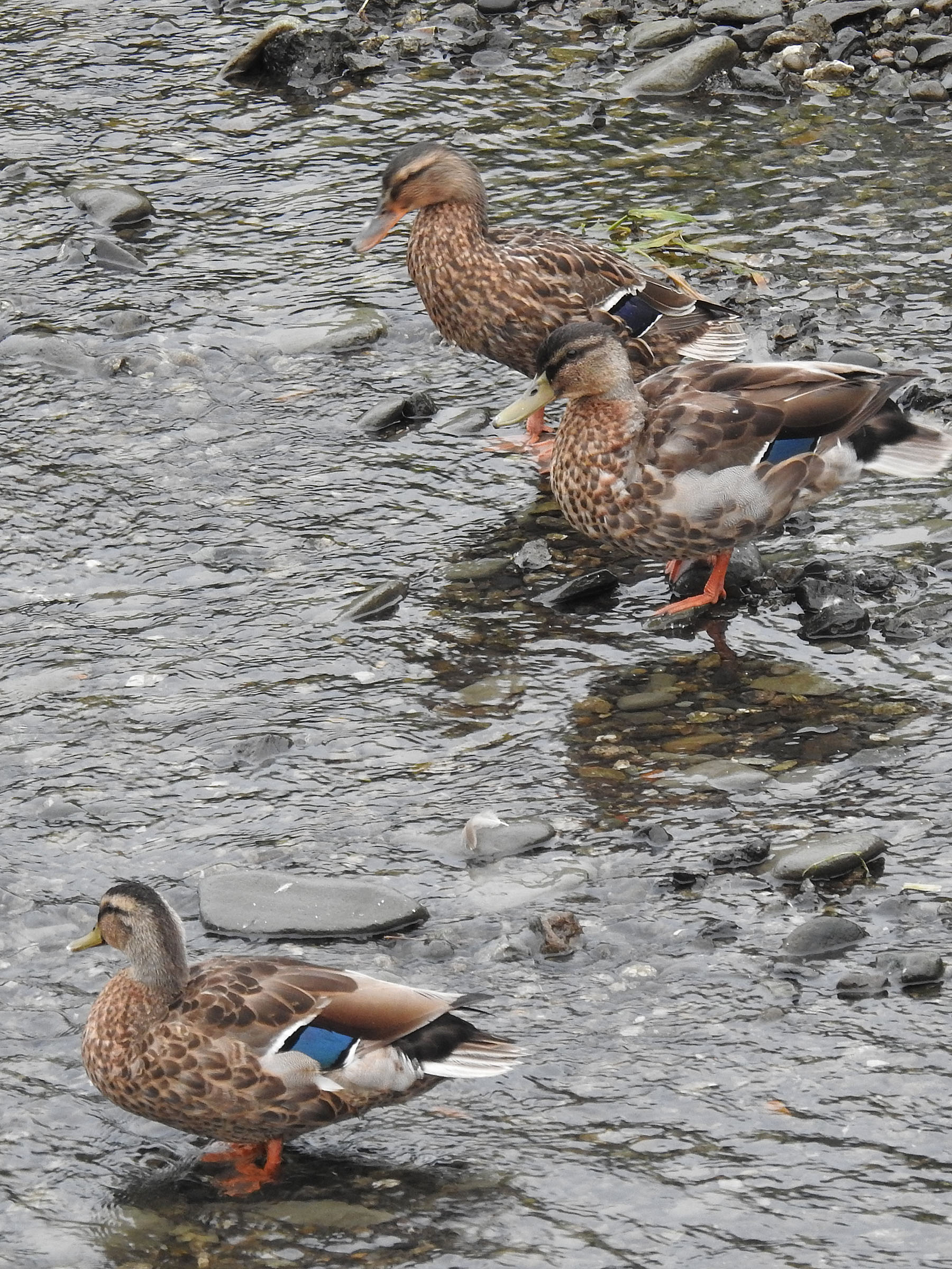 上(奥)はマガモの雌と思われます。そして真ん中と下(手前)は、カルガモのように見えて嘴が黄色です。また喉から胸にかけてカルガモは模様はあまりないのですが、こちらは喉からすぐに模様があります。横の羽も少しマガモの要素が混じっています。下の方にカルガモが出てくるので見比べればすぐに分かります。
