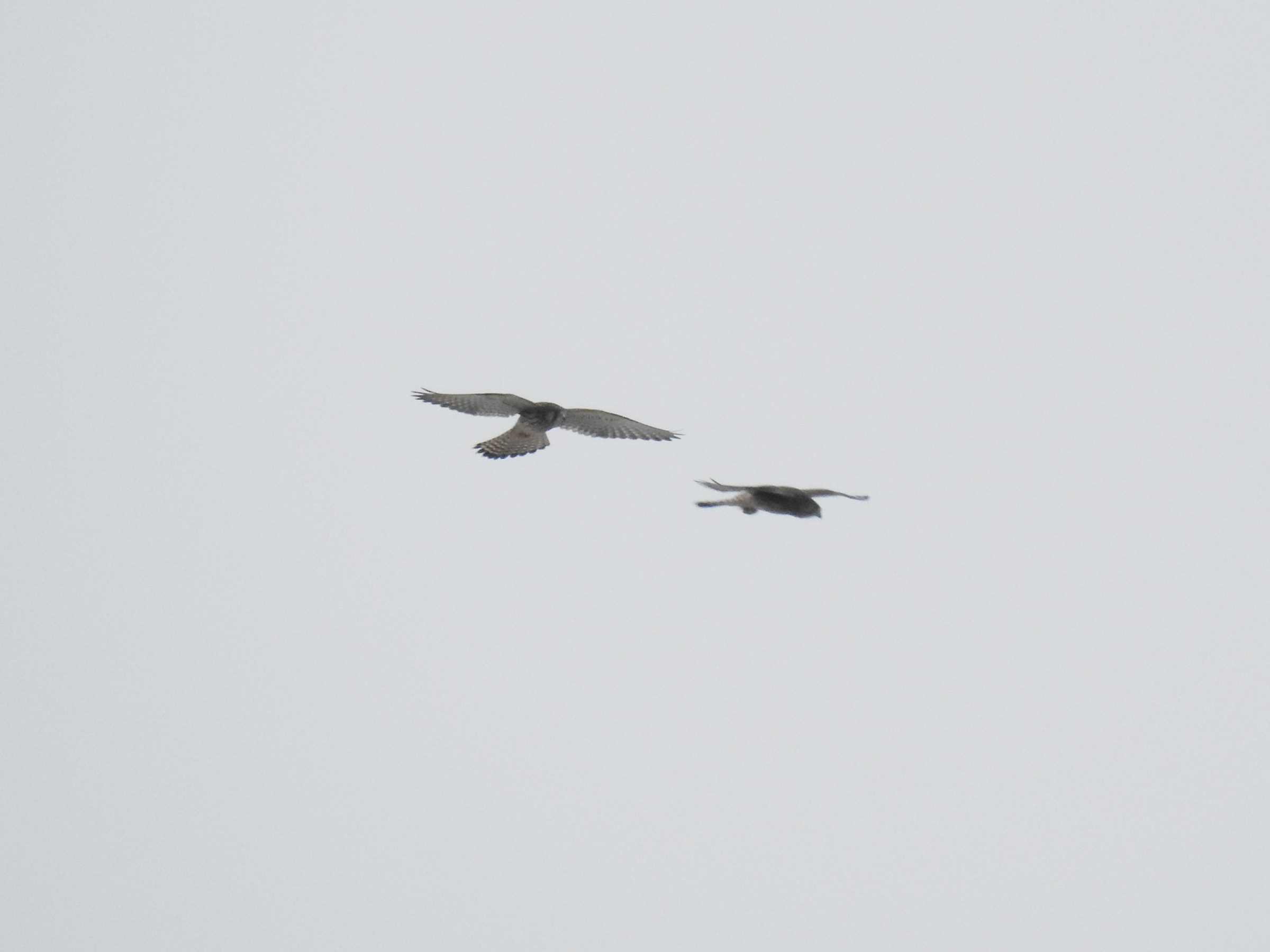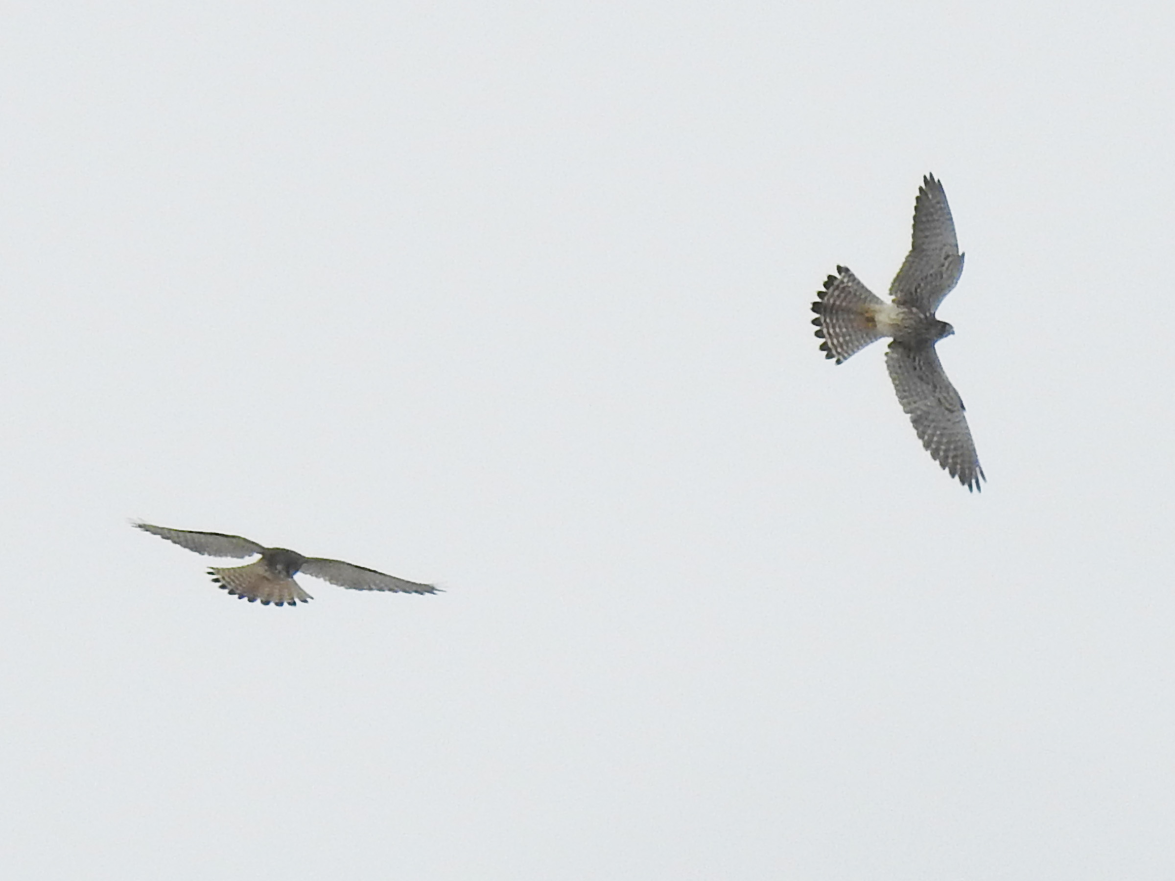 このショットでチョウゲンボウだと分かると思います。尾羽の先の黒帯、お腹の縦斑。右の個体はお羽の上面の茶色っぽい横斑(雌の特徴)も見えます。