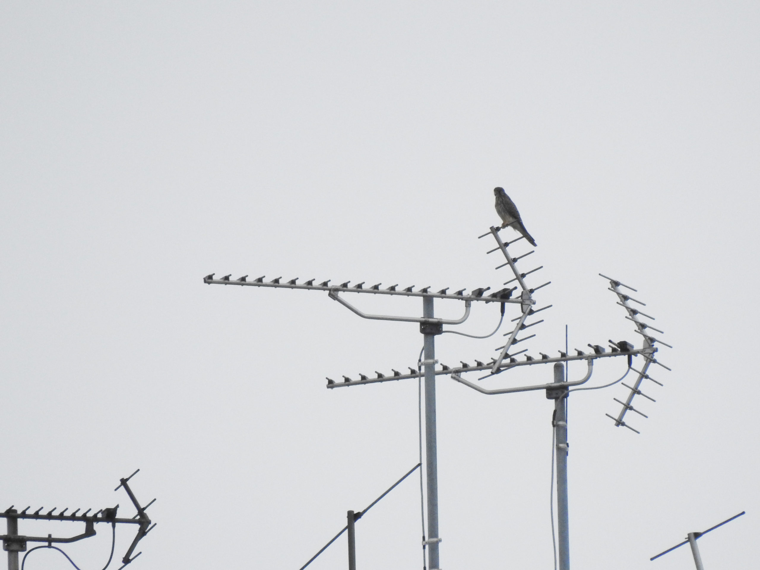カラスから逃れてちょっと離れたアンテナに留まりました。しかし遠い…。