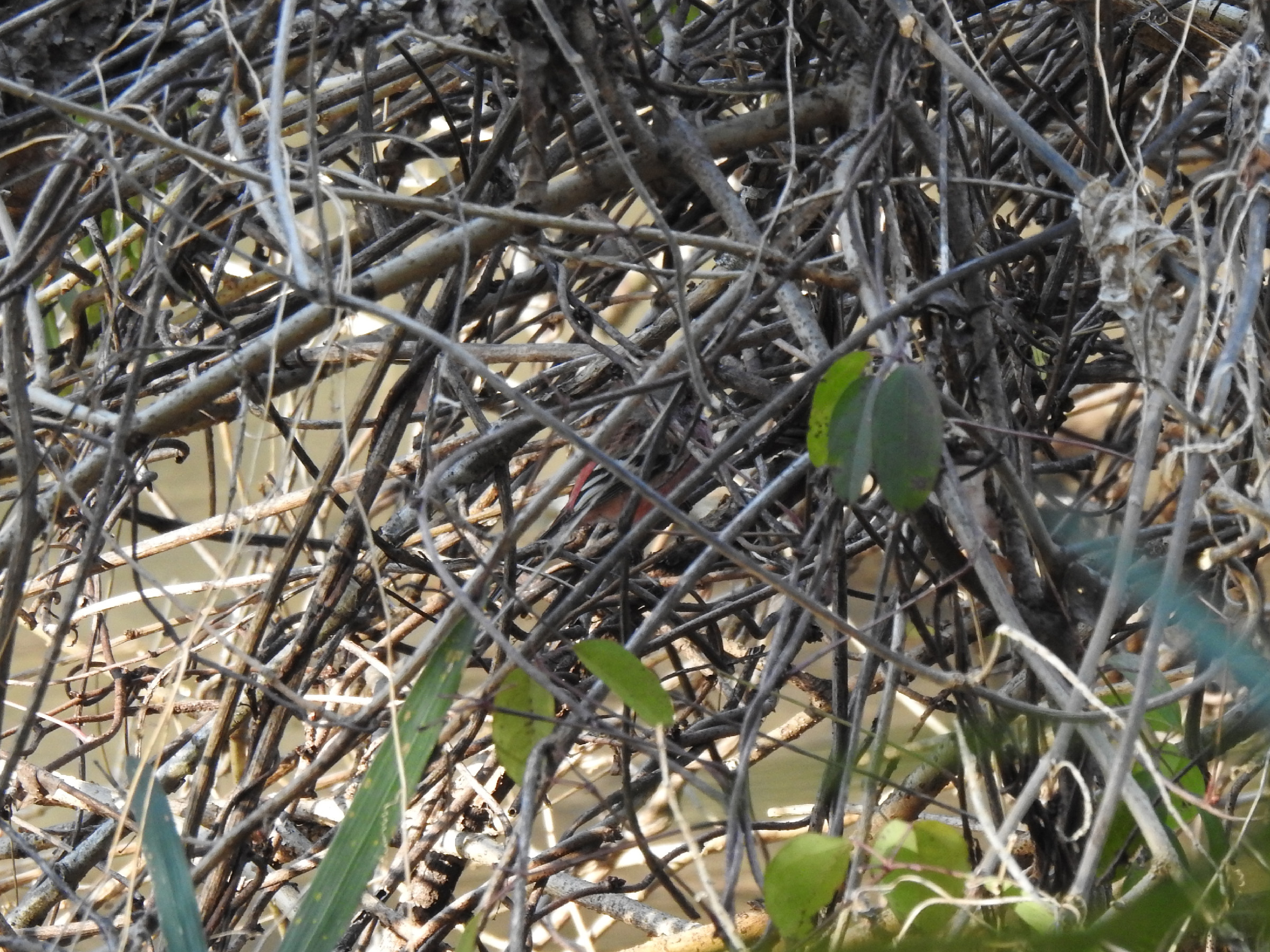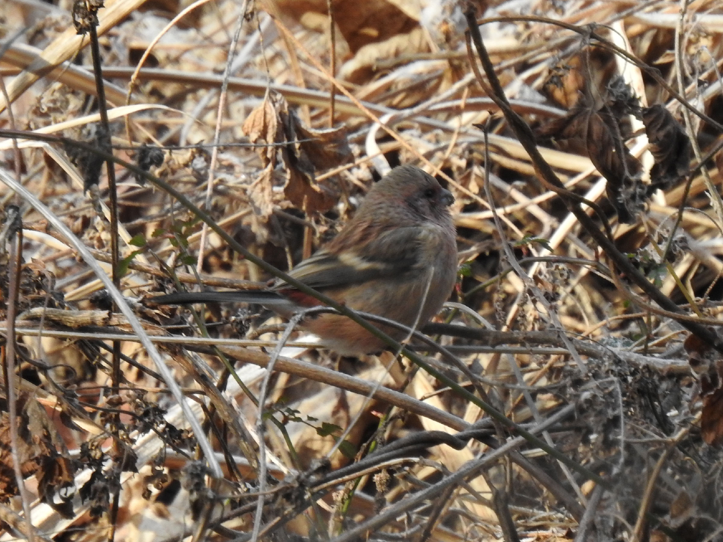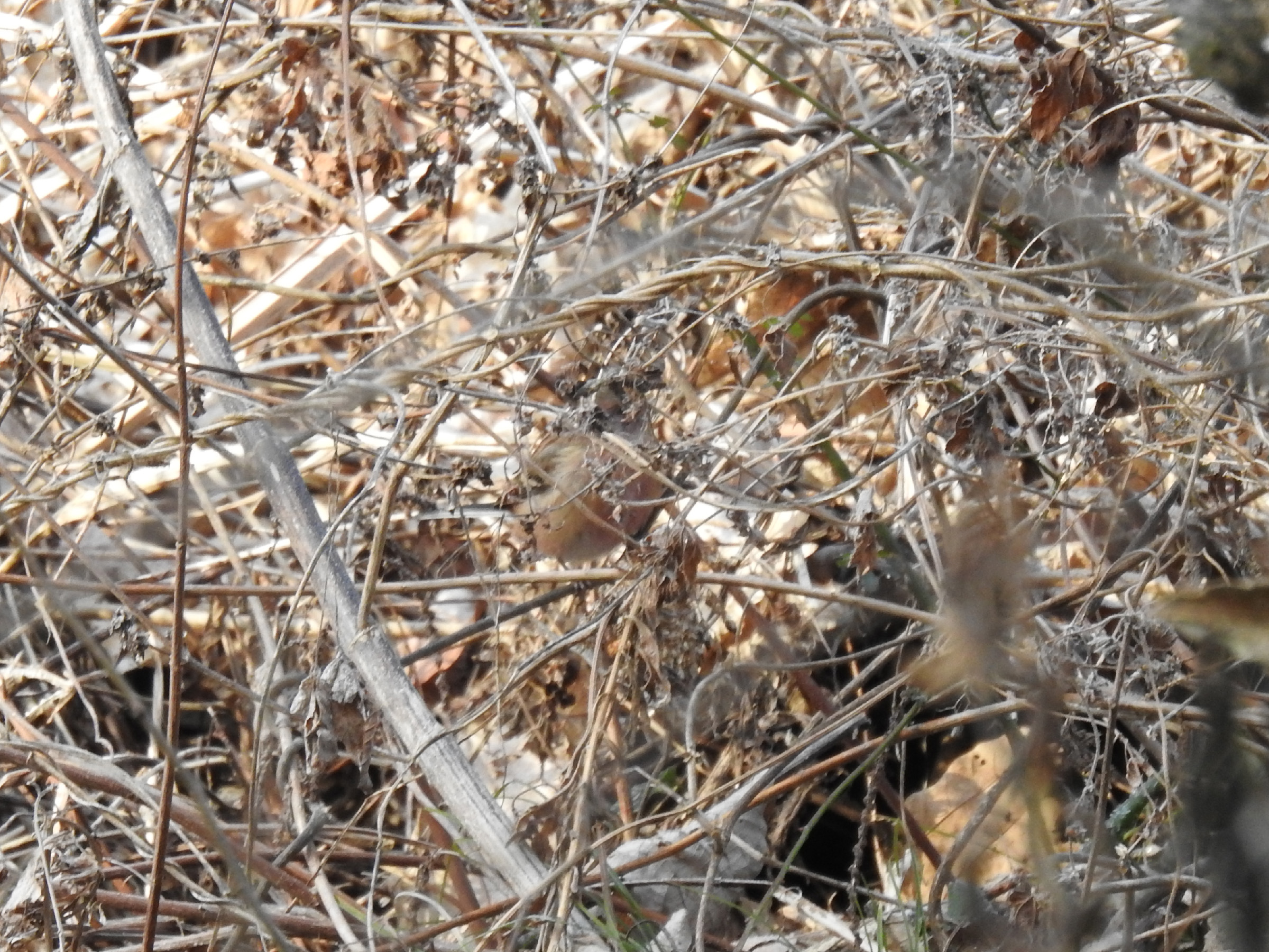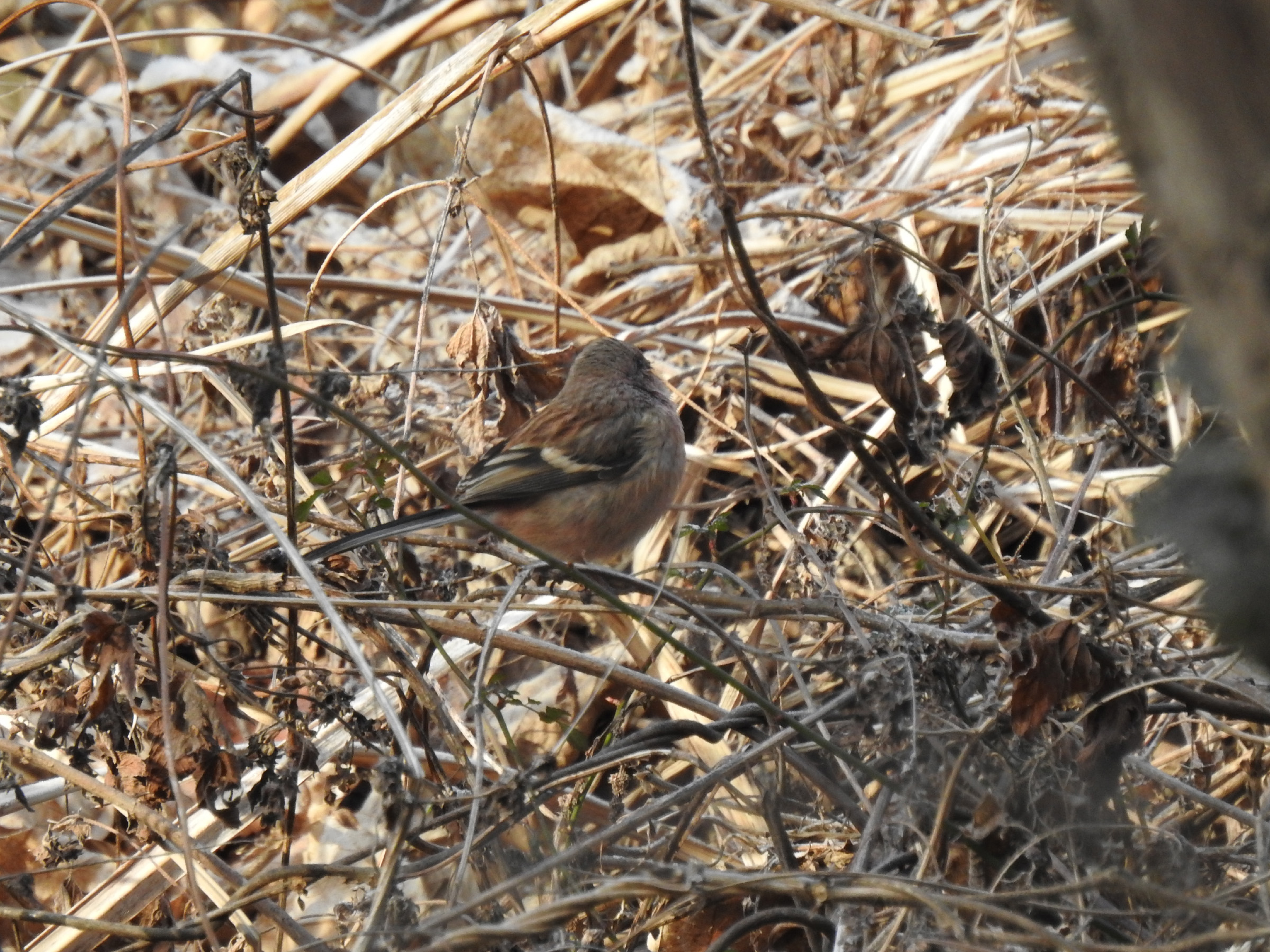 え?どこにいるの?と言った写真です。写真は全て記録程度で草陰から出てきてくれませんでしたが、ベニマシコ雌雄の2羽が確認できました。この写真の個体は雌かと。