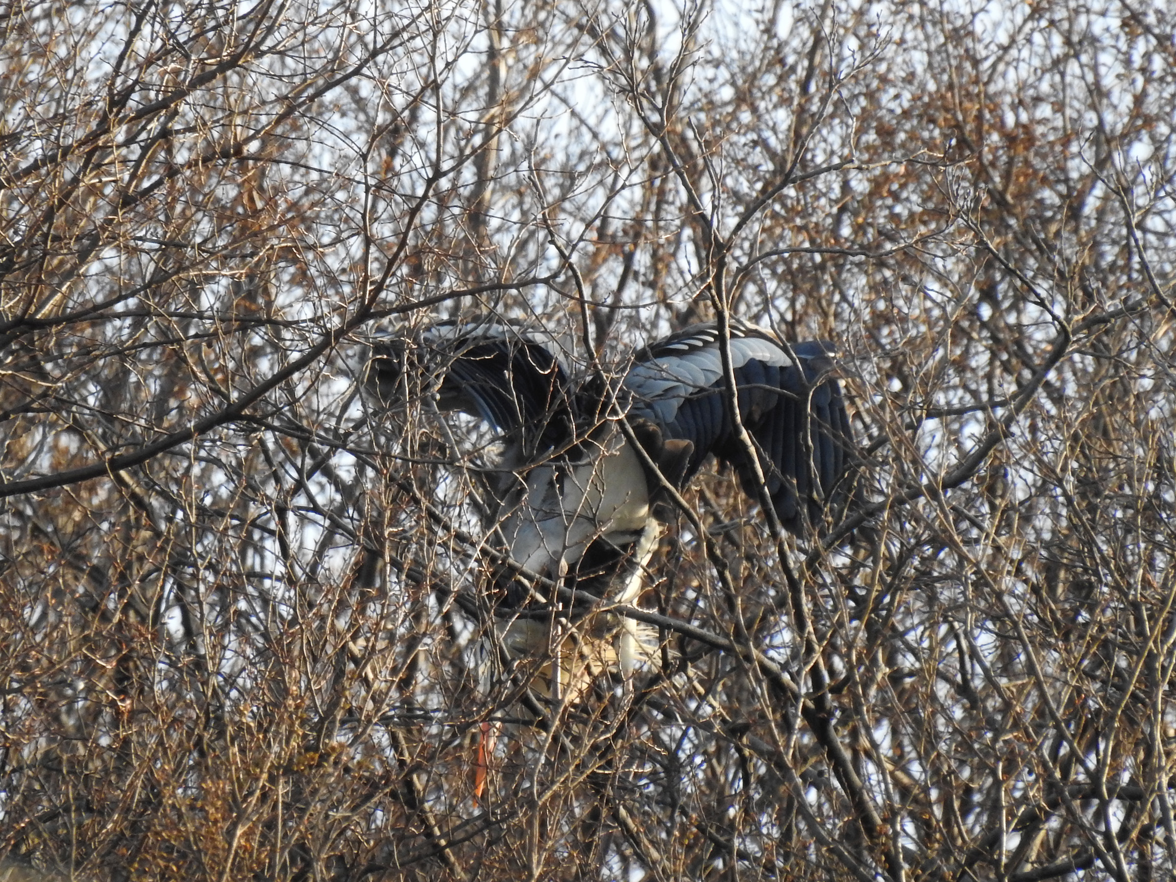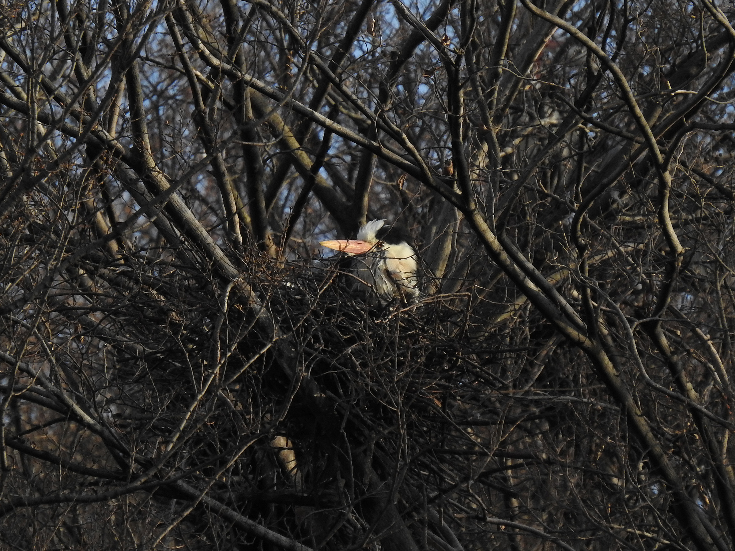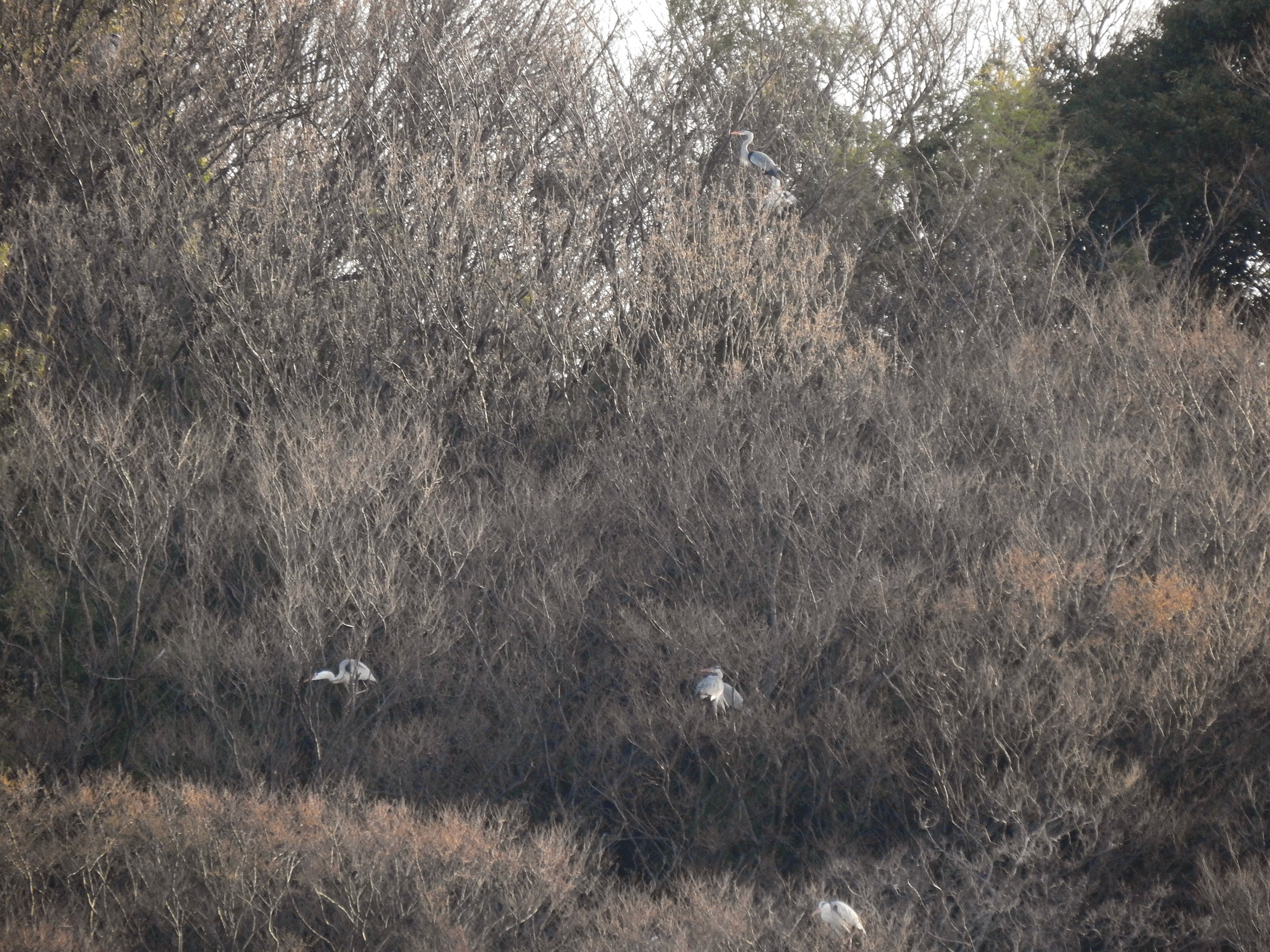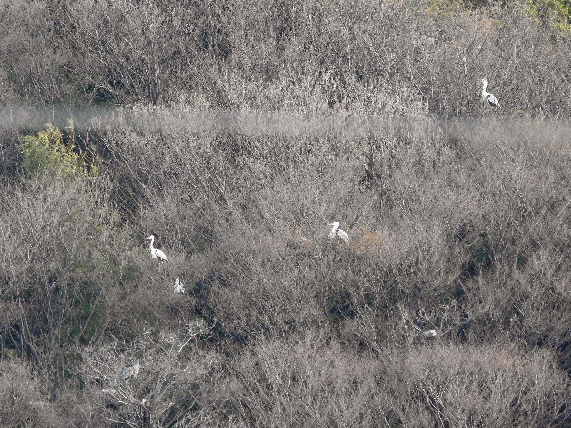 近づいて見るといくつか巣が見えます。大きいので巣も大きい。サギ類のコロニーが近いと鳴き声などがうるさい、糞害がひどいと言った話がフィーチャーされますが、この付近、この規模だとどうなのでしょうか?