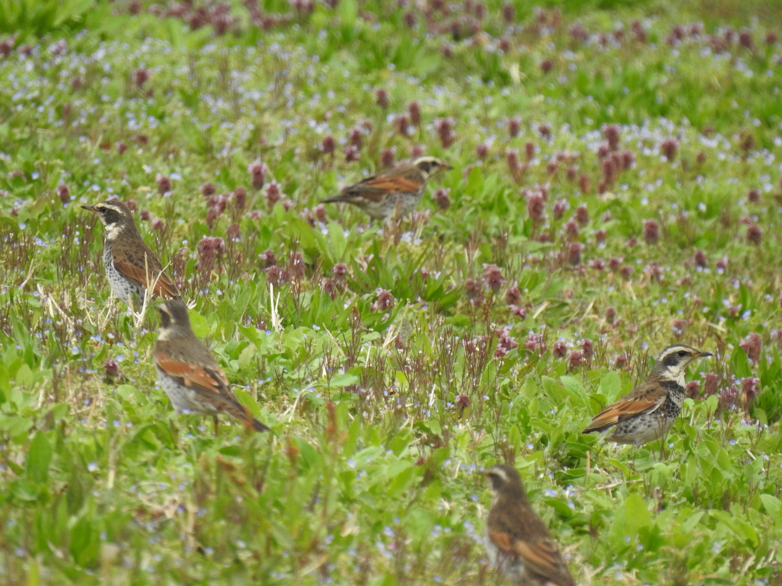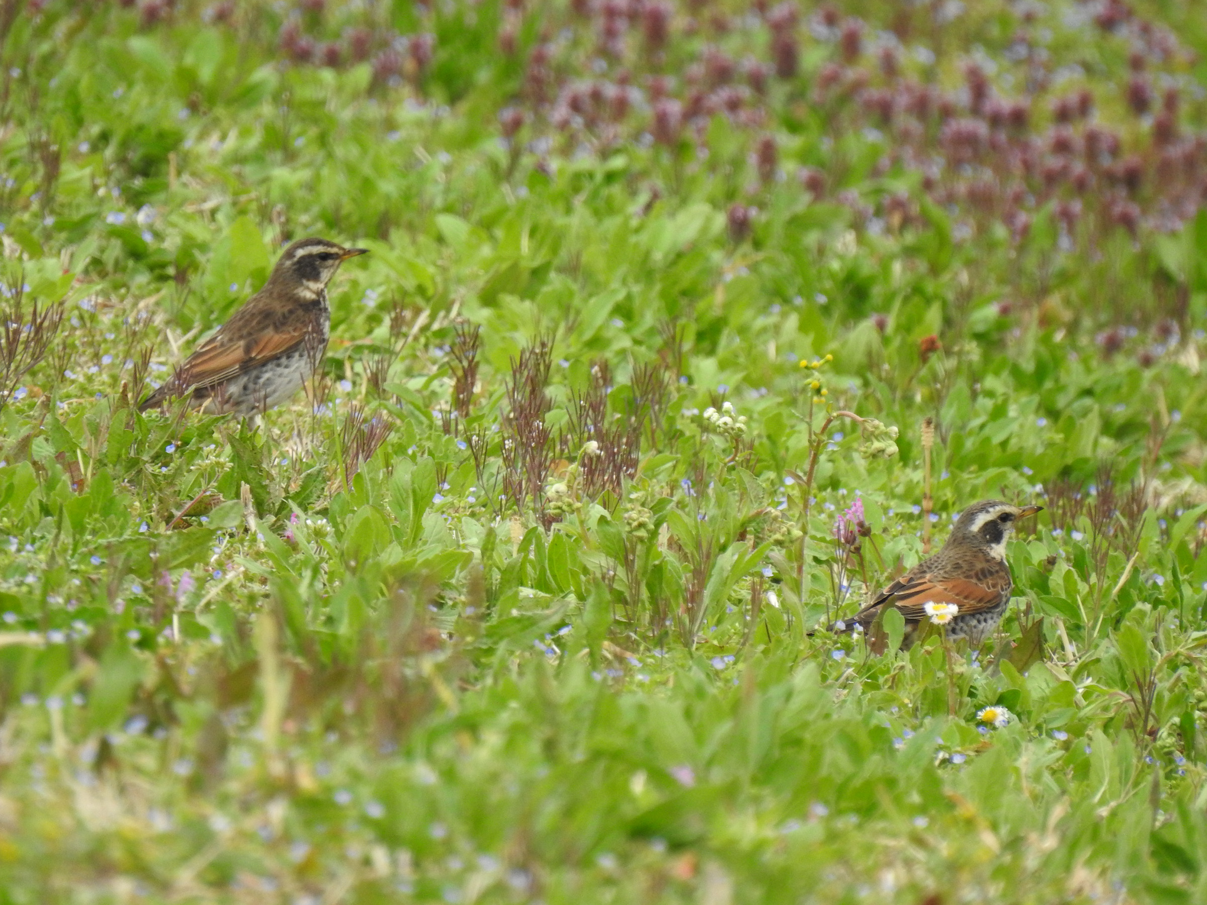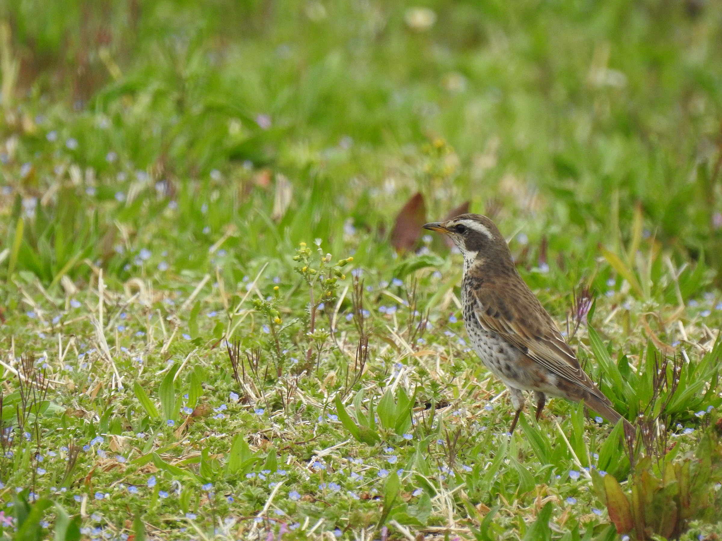 オオイヌノフグリとヒメオドリコソウに囲まれて初春らしい感じ。ツグミは冬鳥ですが、去るのは比較的遅めです。なんとなくカモで言うとコガモもそうですね。