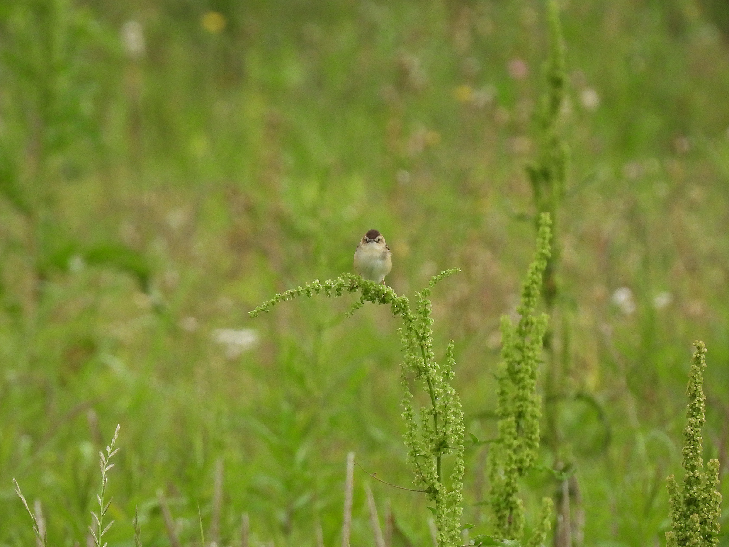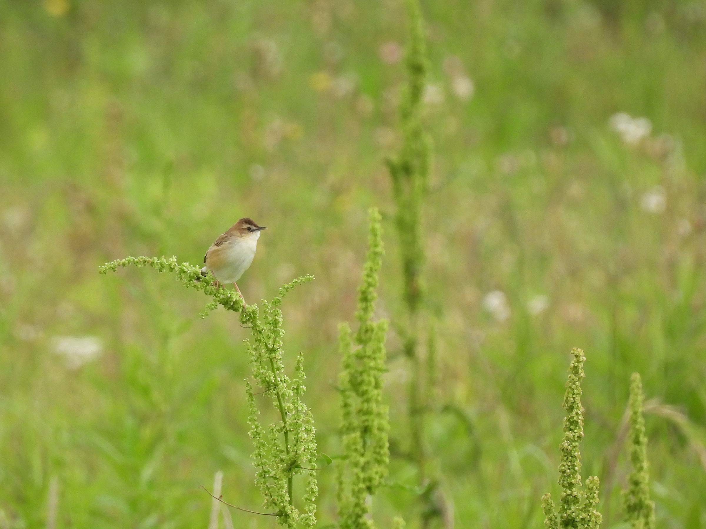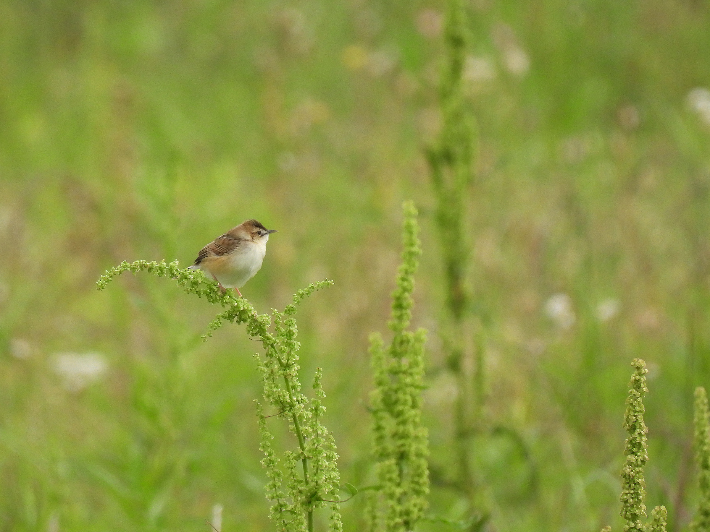 セッカの情報をご提供いただきました。13cmほどの小さな鳥ですが、この時期は鳴きながら飛び回って、写真のように草などの先端に留まることが多いので、見つけやすいです。