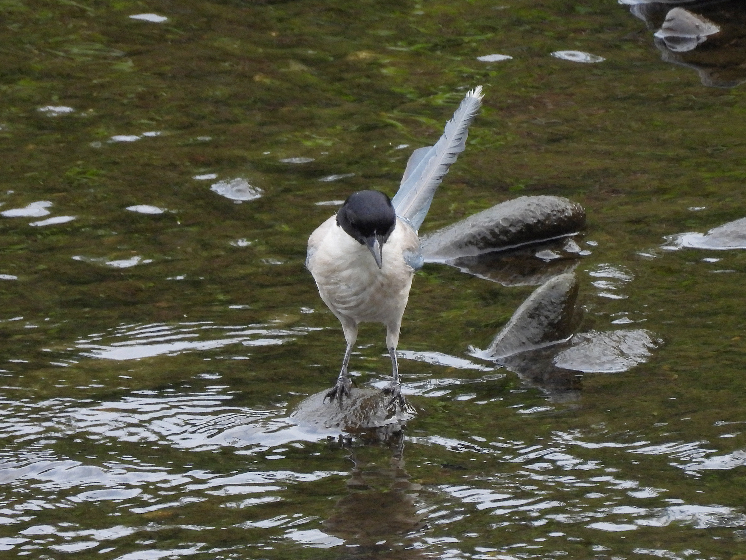 暑い日が続く中、オナガの水浴びを比較的じっくり見ることが出来ましたのでアップいたします。まず、河原に降り立ってから、周りの様子を見回します。