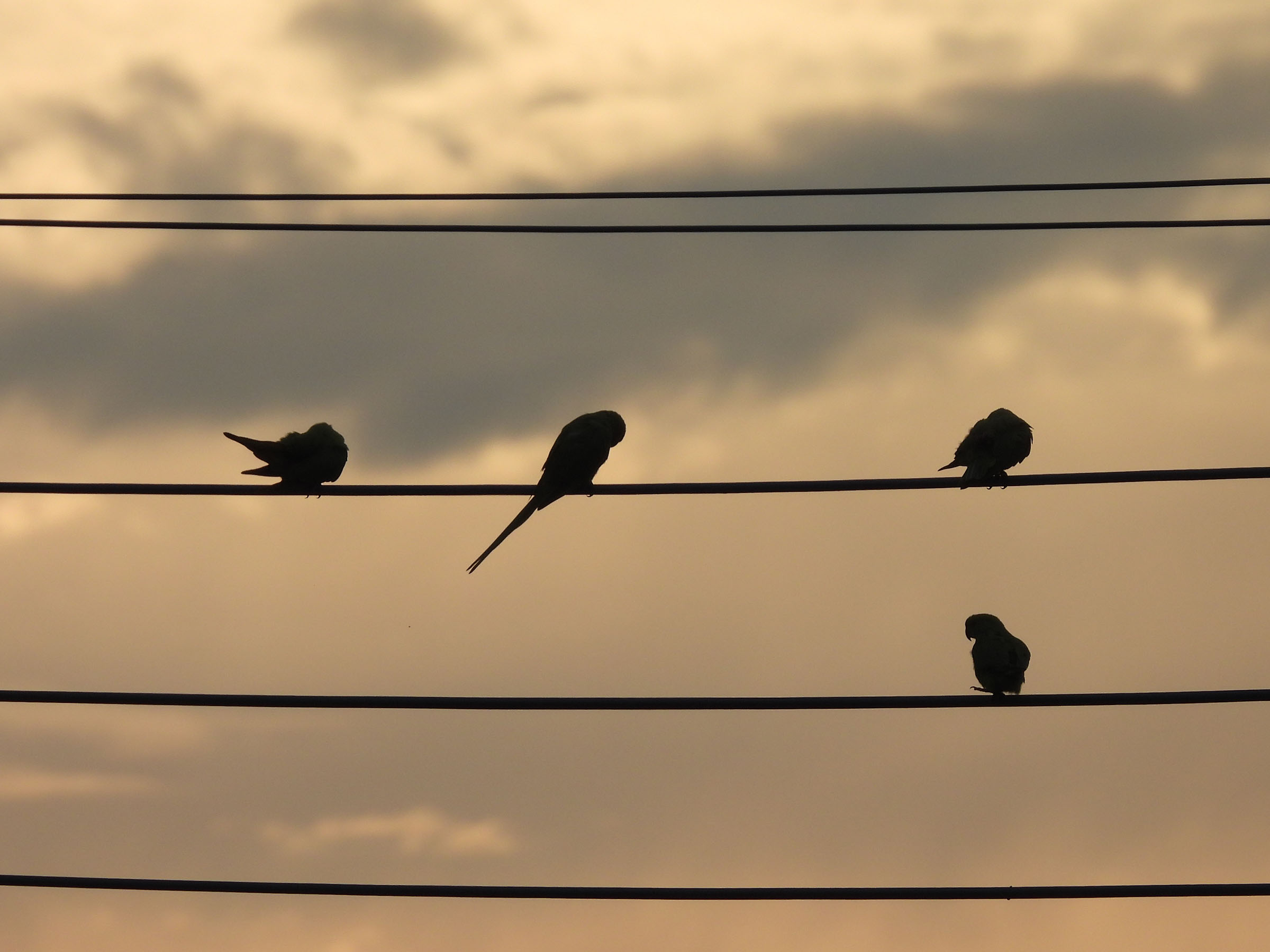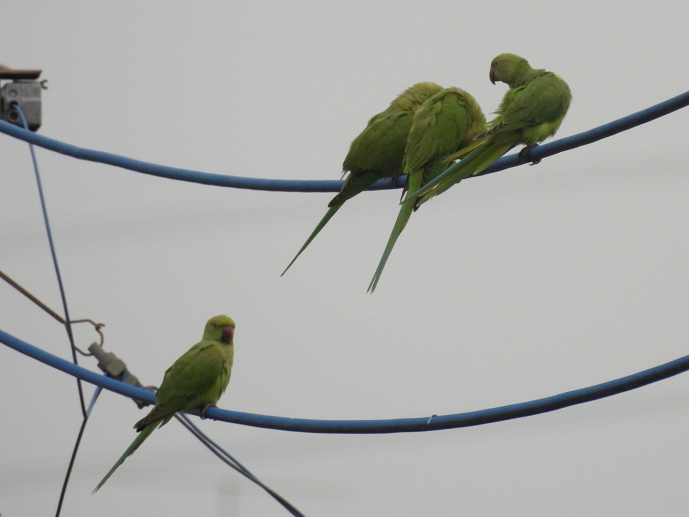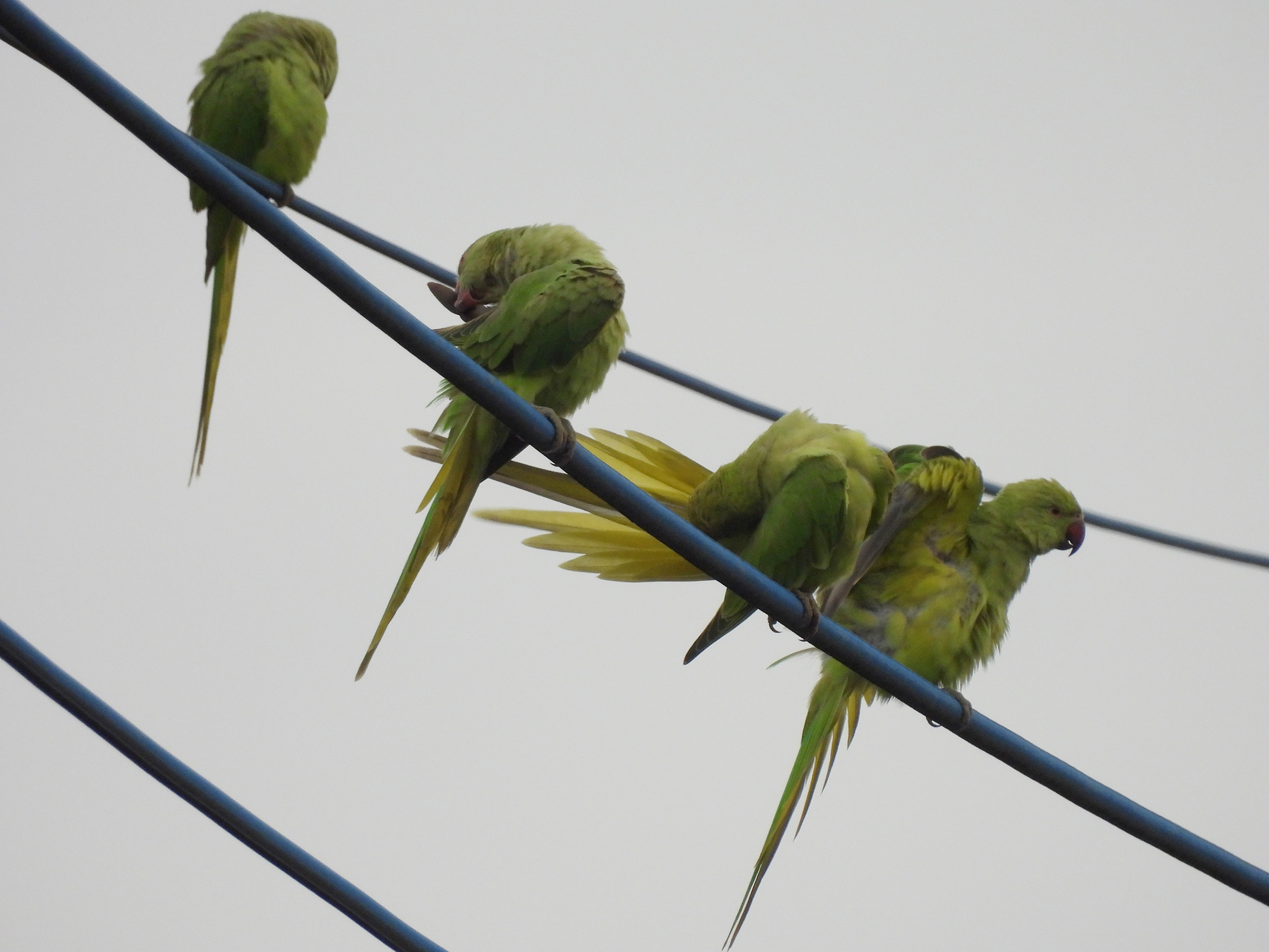 電線にちょっと大きめな鳥が数羽見えました。逆光側から、順光側に回り込むと、ホンセイインコ(亜種ワカケホンセイインコ)でした。