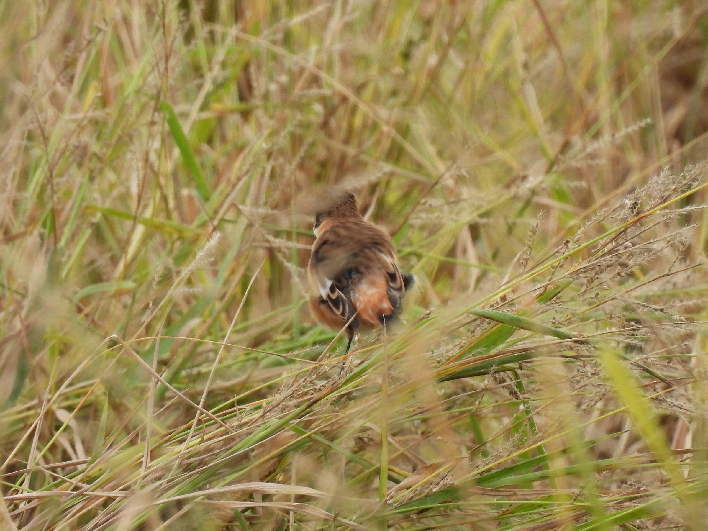 嘴の付け根と目の周りが黒いのがいました。冬羽の雄でしょう。みどりの鳥地区(横浜市北部)では顔の真っ黒なノビタキ雄が囀る姿は憧れです。