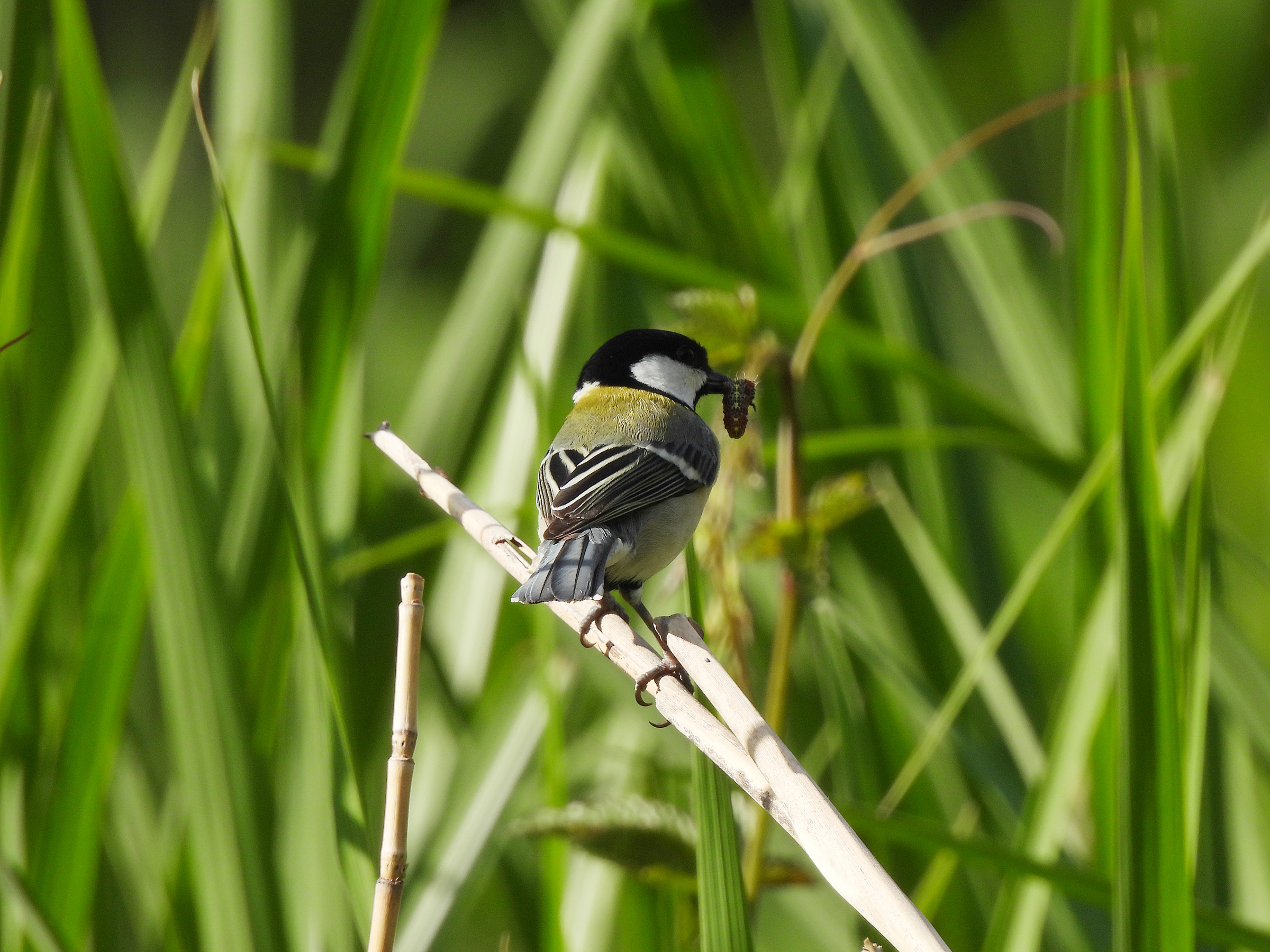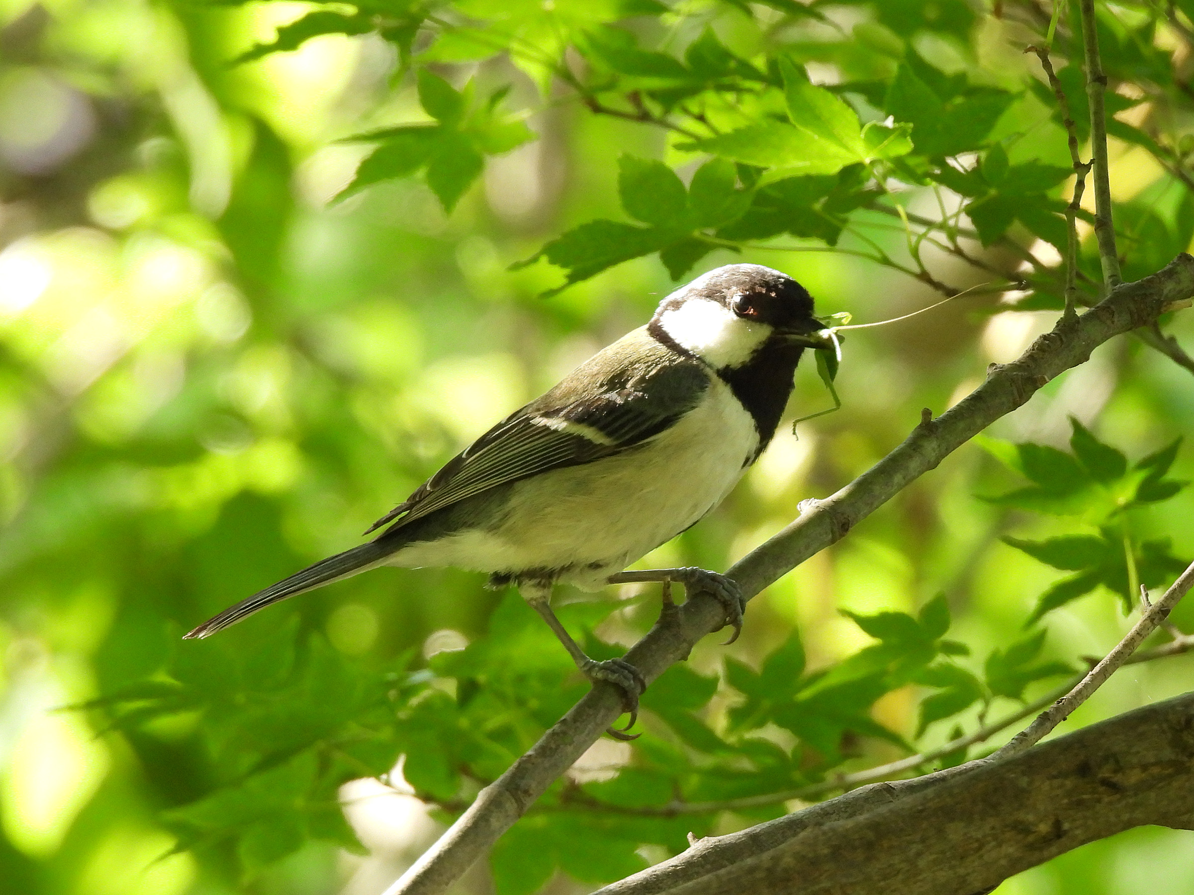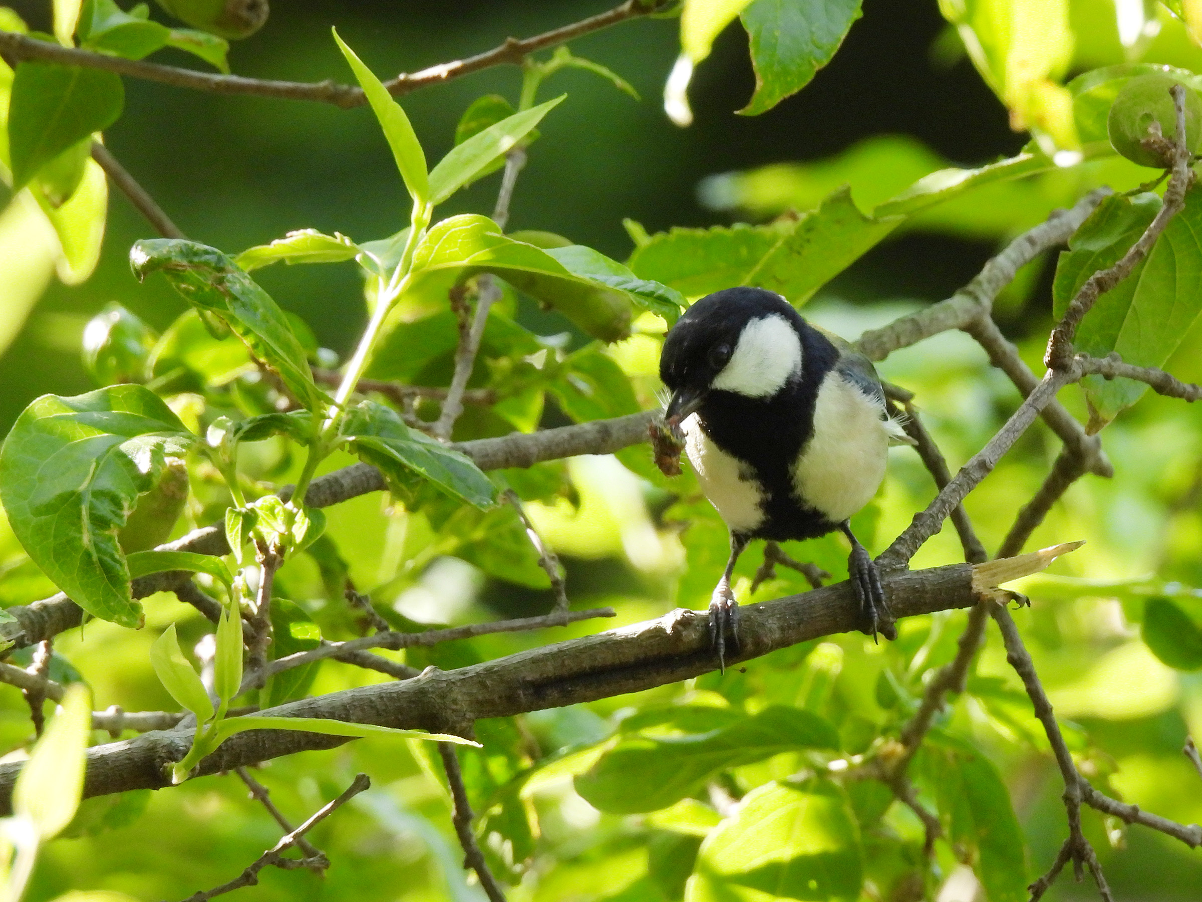 動画の前半、目立つ枝先から、こちらに移ったと思ったら、もう芋虫を咥えていました。すぐ食べないので雛に与える餌でしょうか?