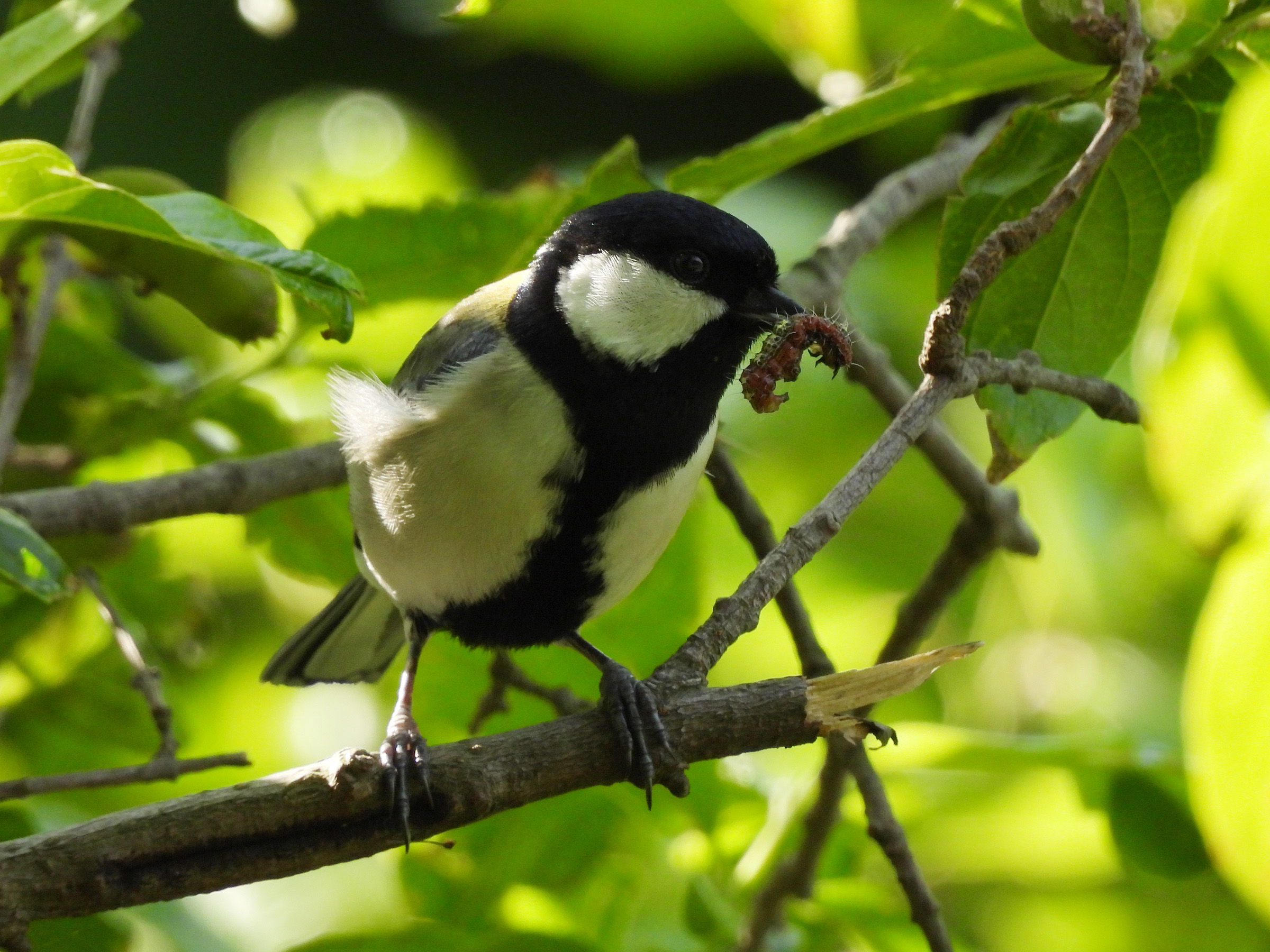 シジュウカラをじっくりアップで観察出来たので動画とともにお届けします。芋虫嫌いな人はご注意ください。