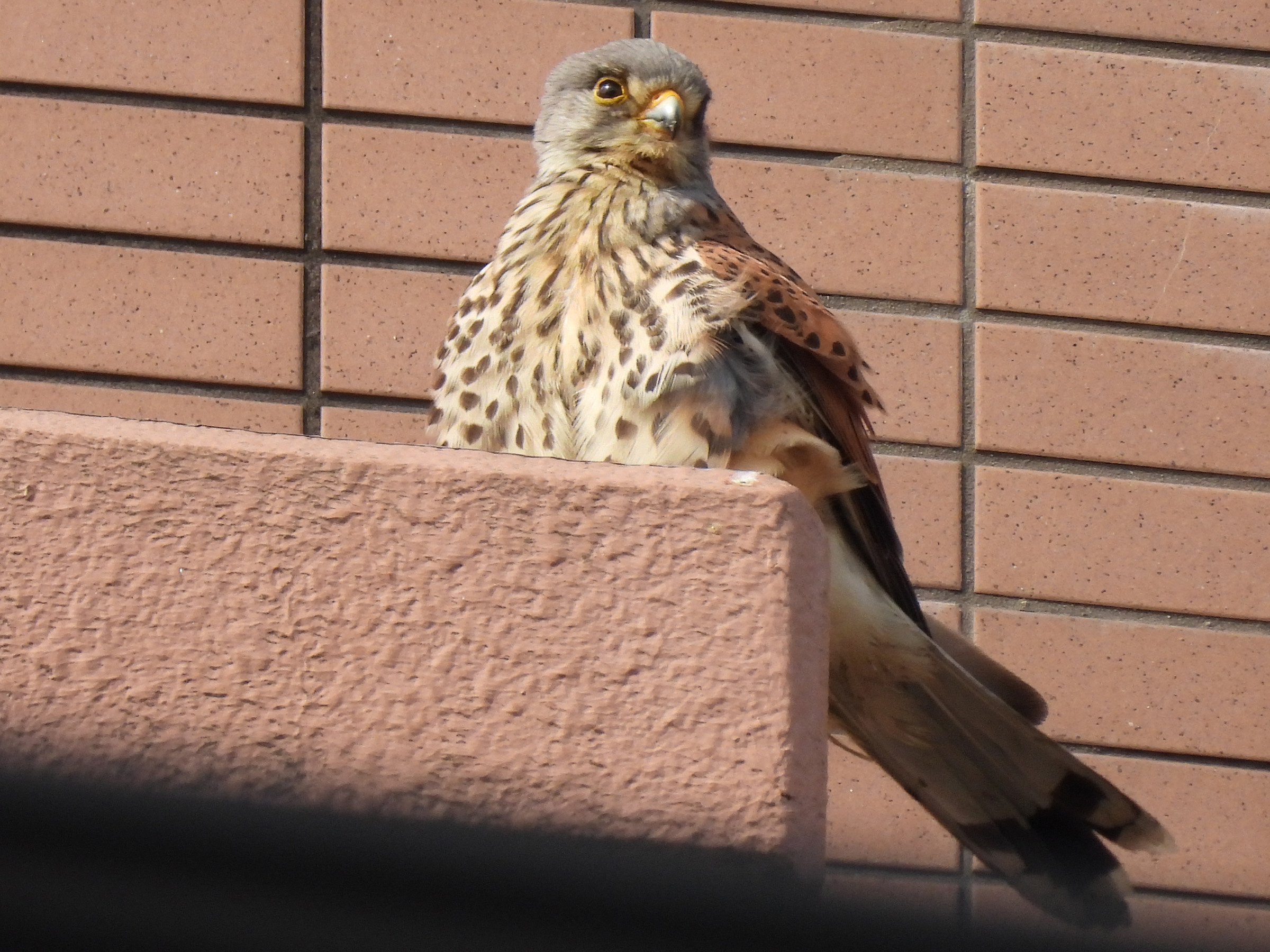 ここで10分以上留まっていました。住んでいる人はまさか自分の家のひさしにハヤブサの仲間が休んでいるとは思わないでしょう。