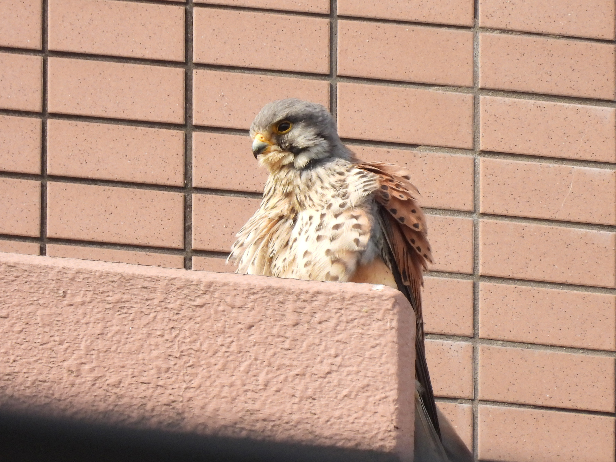 チョウゲンボウ雄。この日は風も強く街中とはいえ、近くに田畑も森もあるので、たまたまこんな庇(ひさし)に留まったのかな?と、思ったのですが、糞の跡がありますね…。実は野鳥たちのお気に入りのスポット?