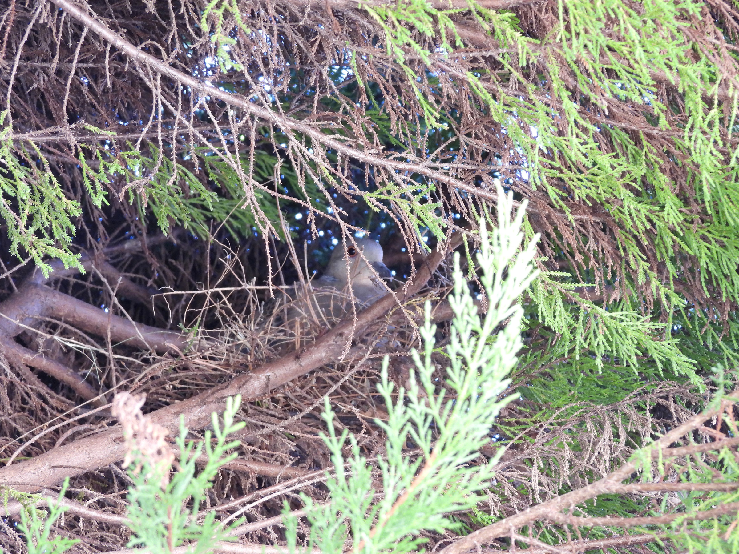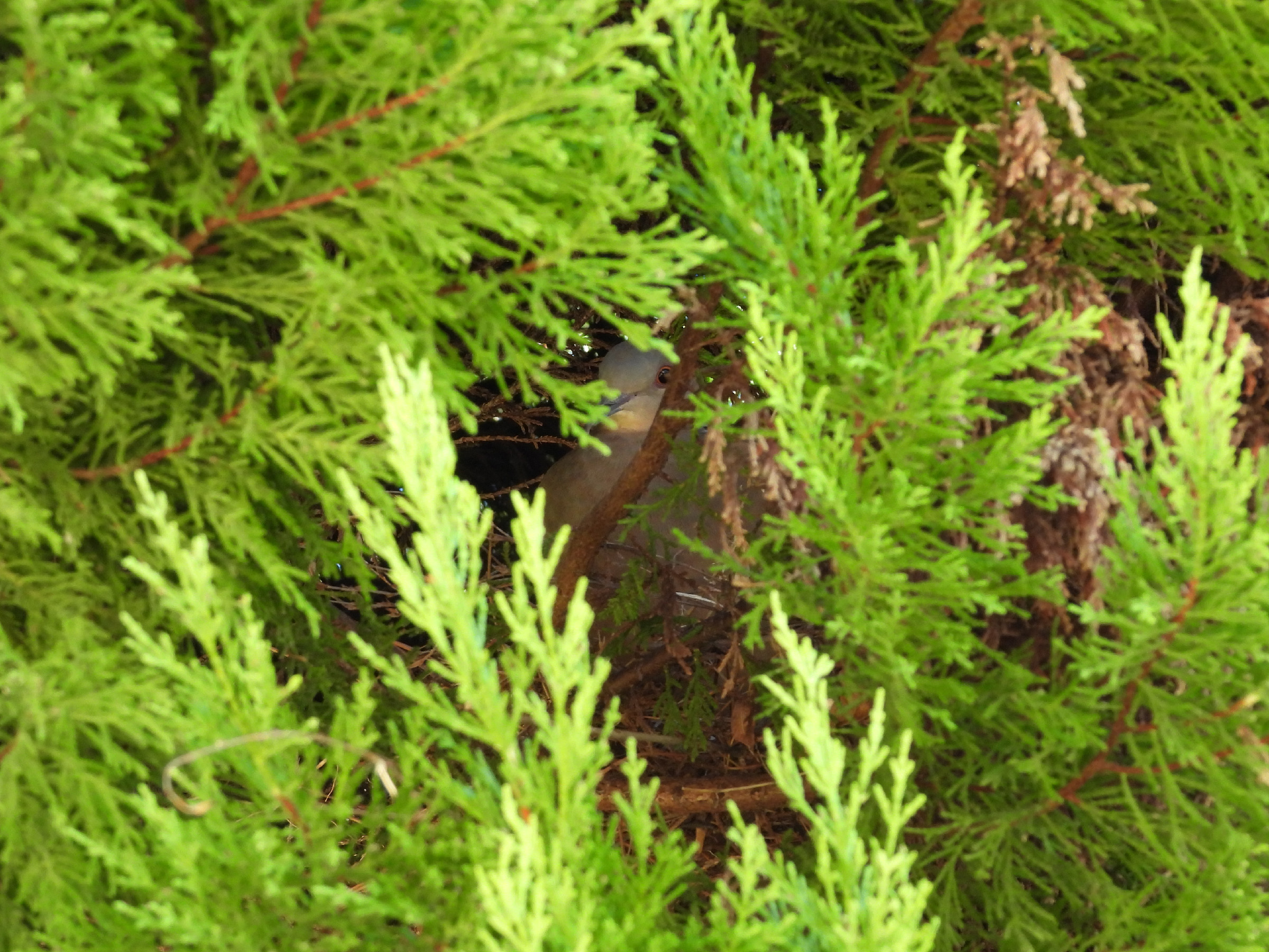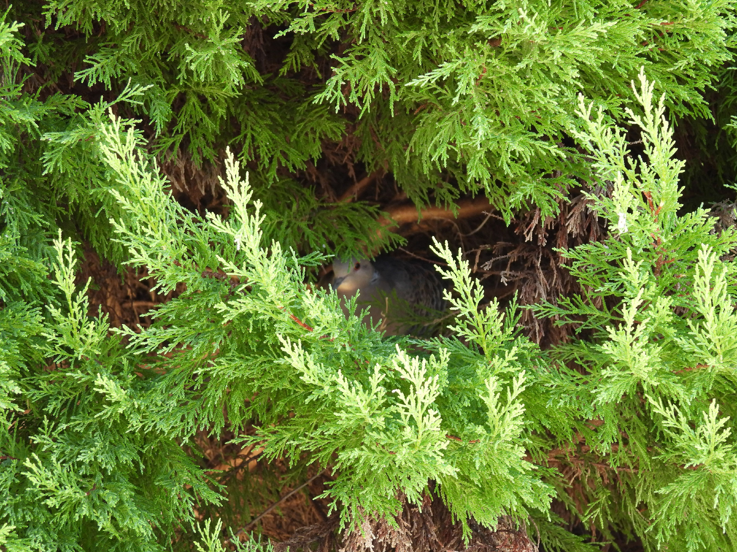 【手がかり1】キジバトが小枝を咥えてこの木の中に入っていくのを見ました。よくよく観察したら営巣しているようです。