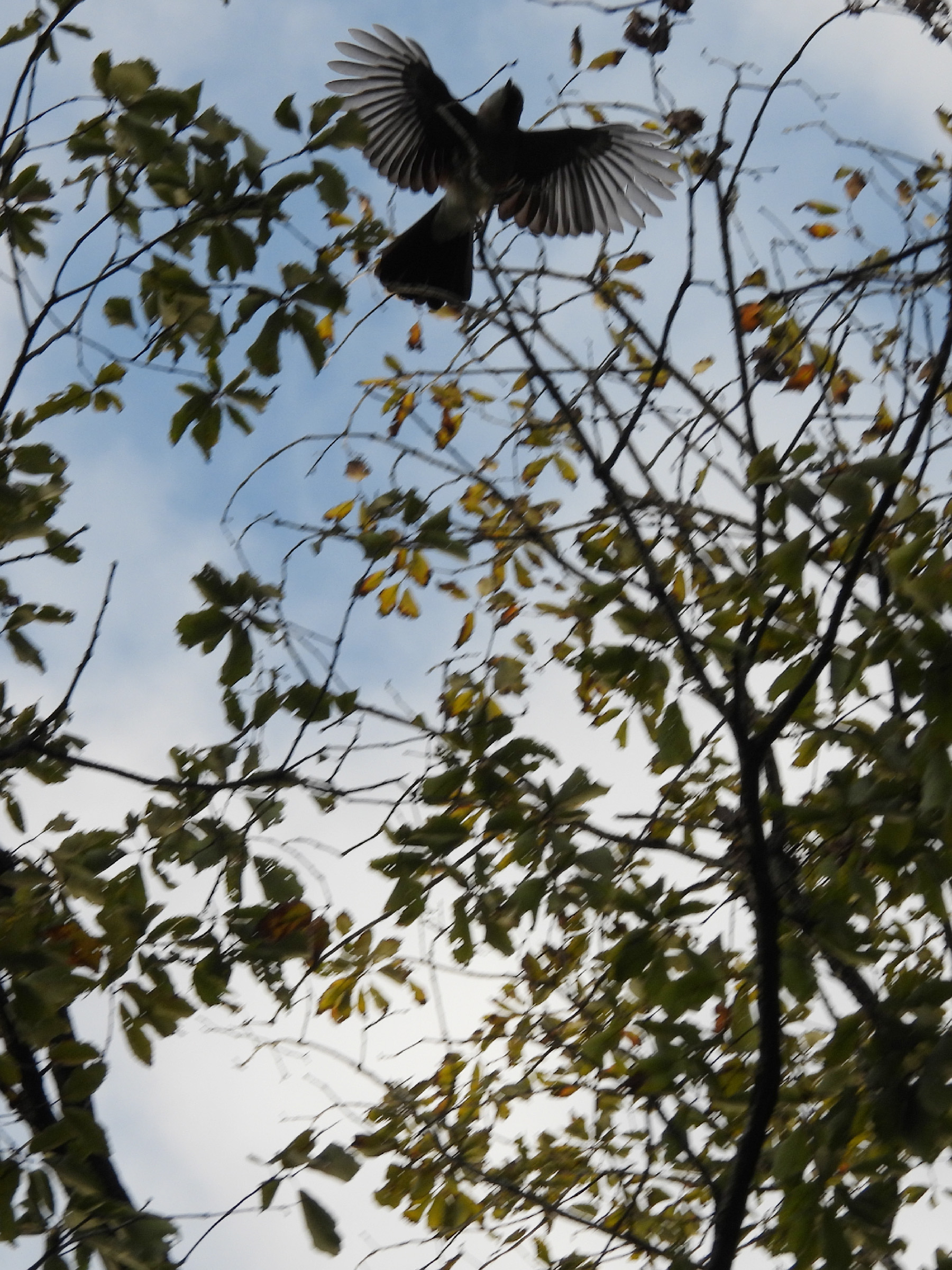 まあ、こんな写真ですが、羽ばたきが撮れたので。下尾筒の白が目立ちます。斜めに見える変な模様みたいに見えるのは枝です。