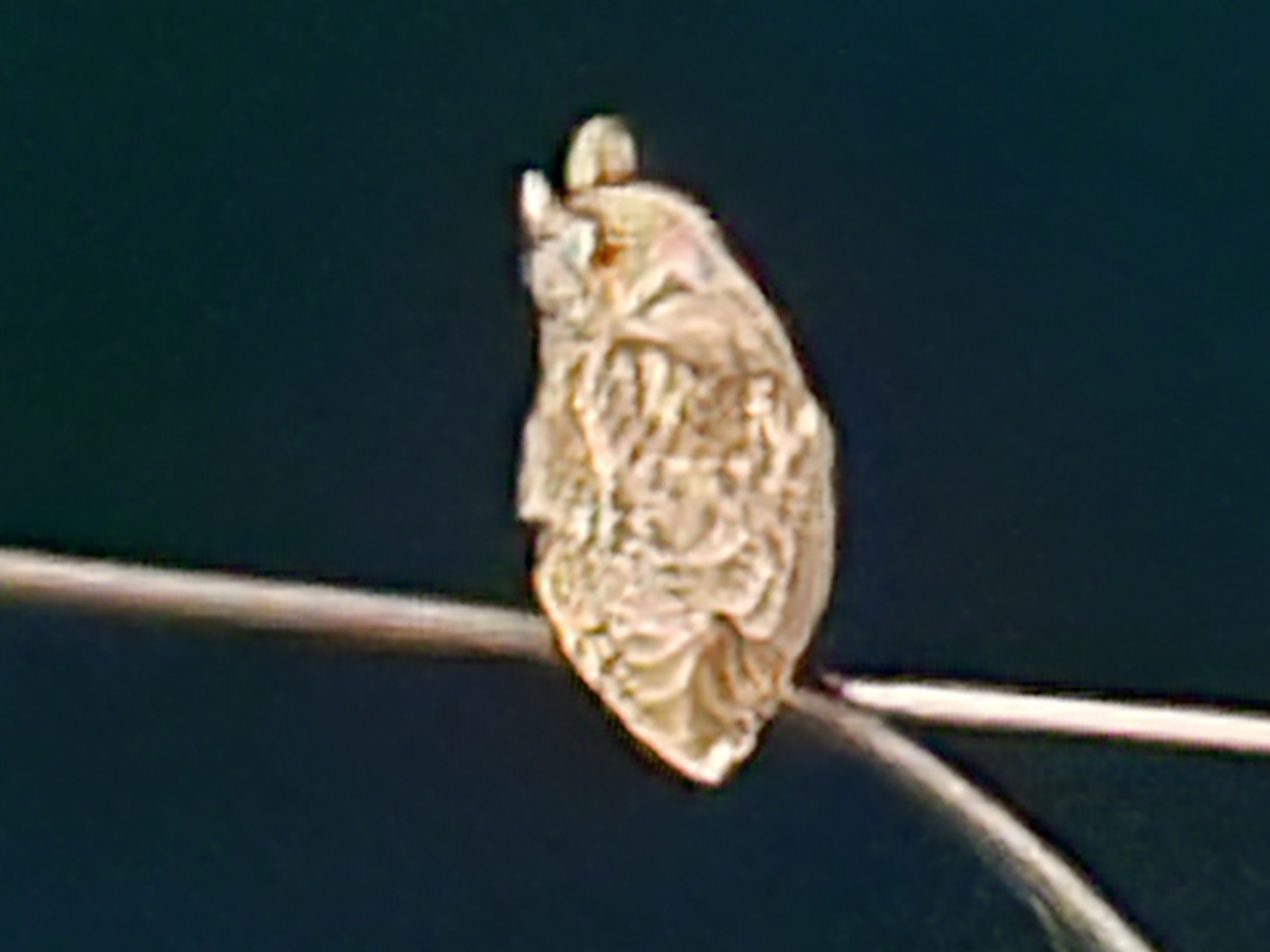 拡大してもあまり情報量は増えないのですが、まずは、虹彩が赤く見えます。これはもちろん反射の影響もありますが、トラフズクの虹彩はオレンジ色ですので近しいかなと。また、トラフズクの後ろ姿は尾羽まで含めて、なんとなく丸っこく(葉っぱのような形)になるのも特徴です。