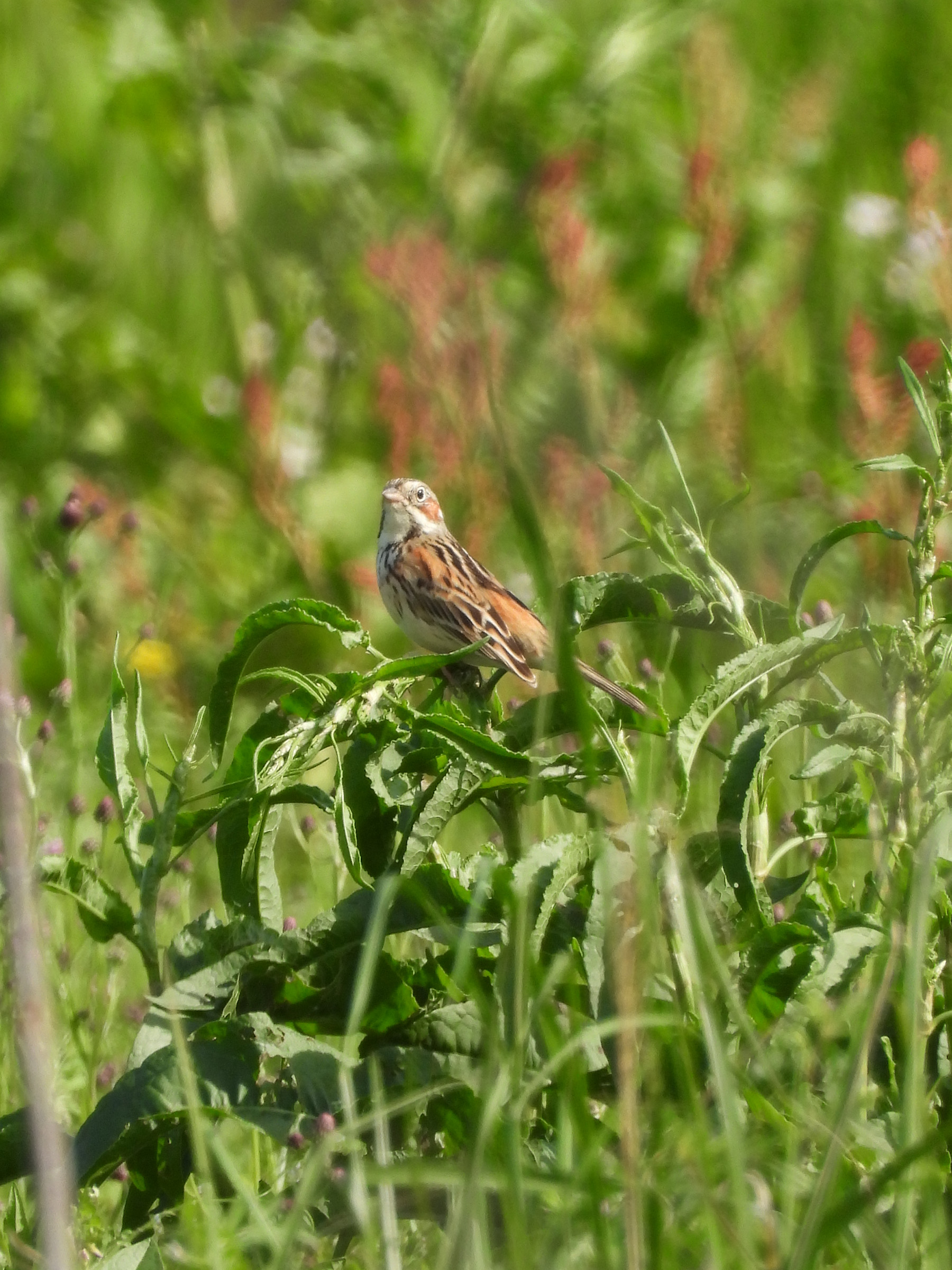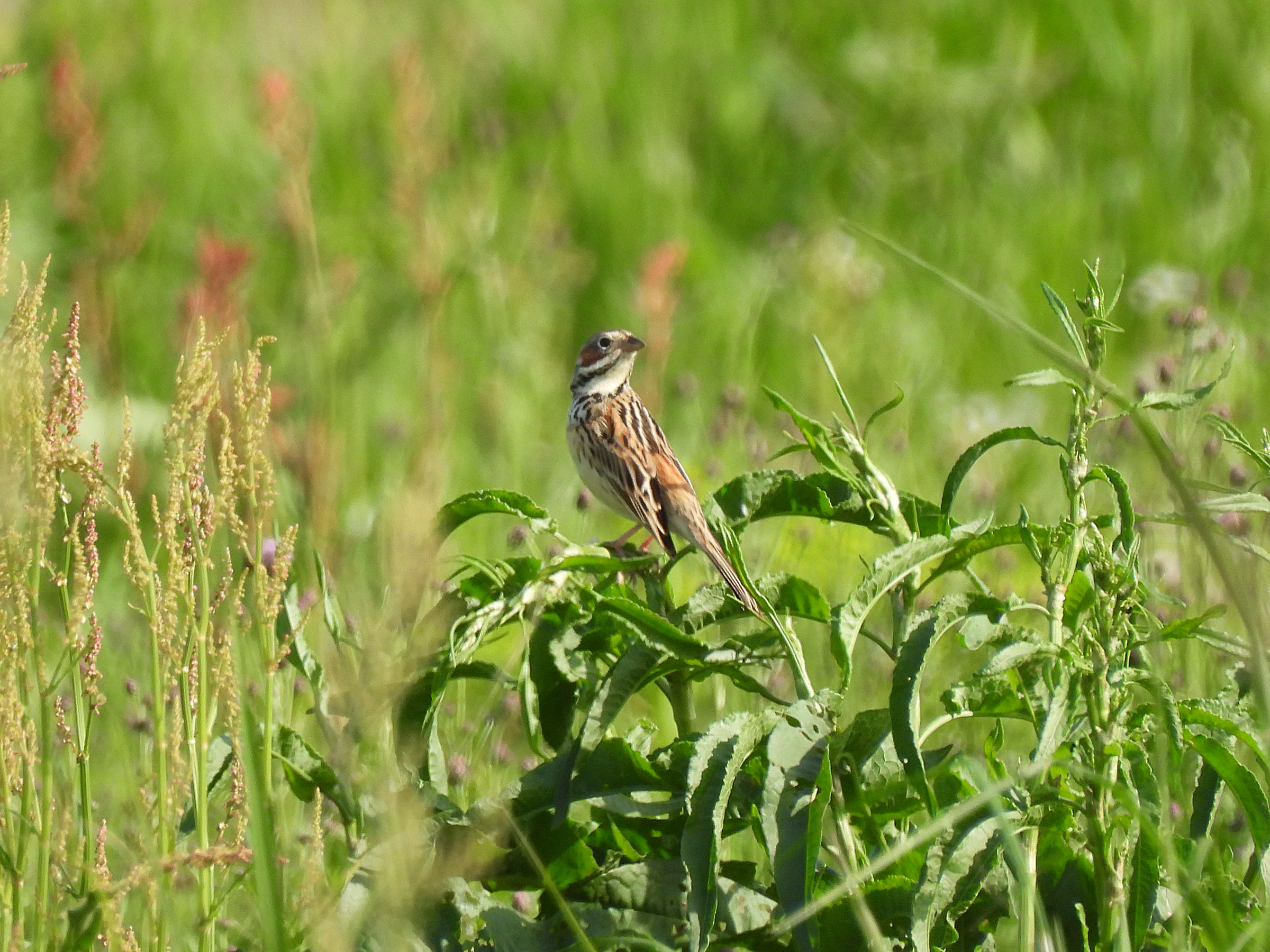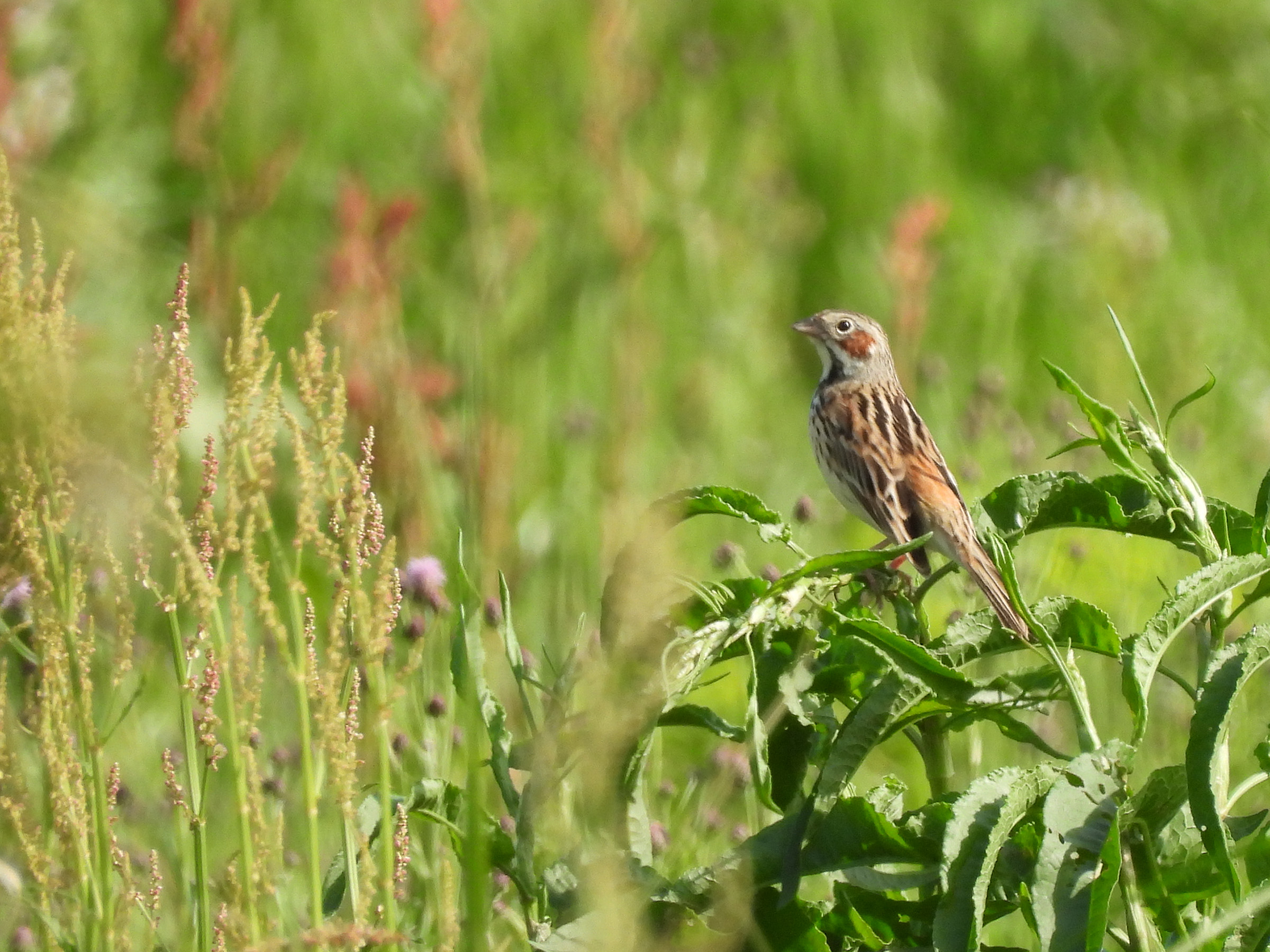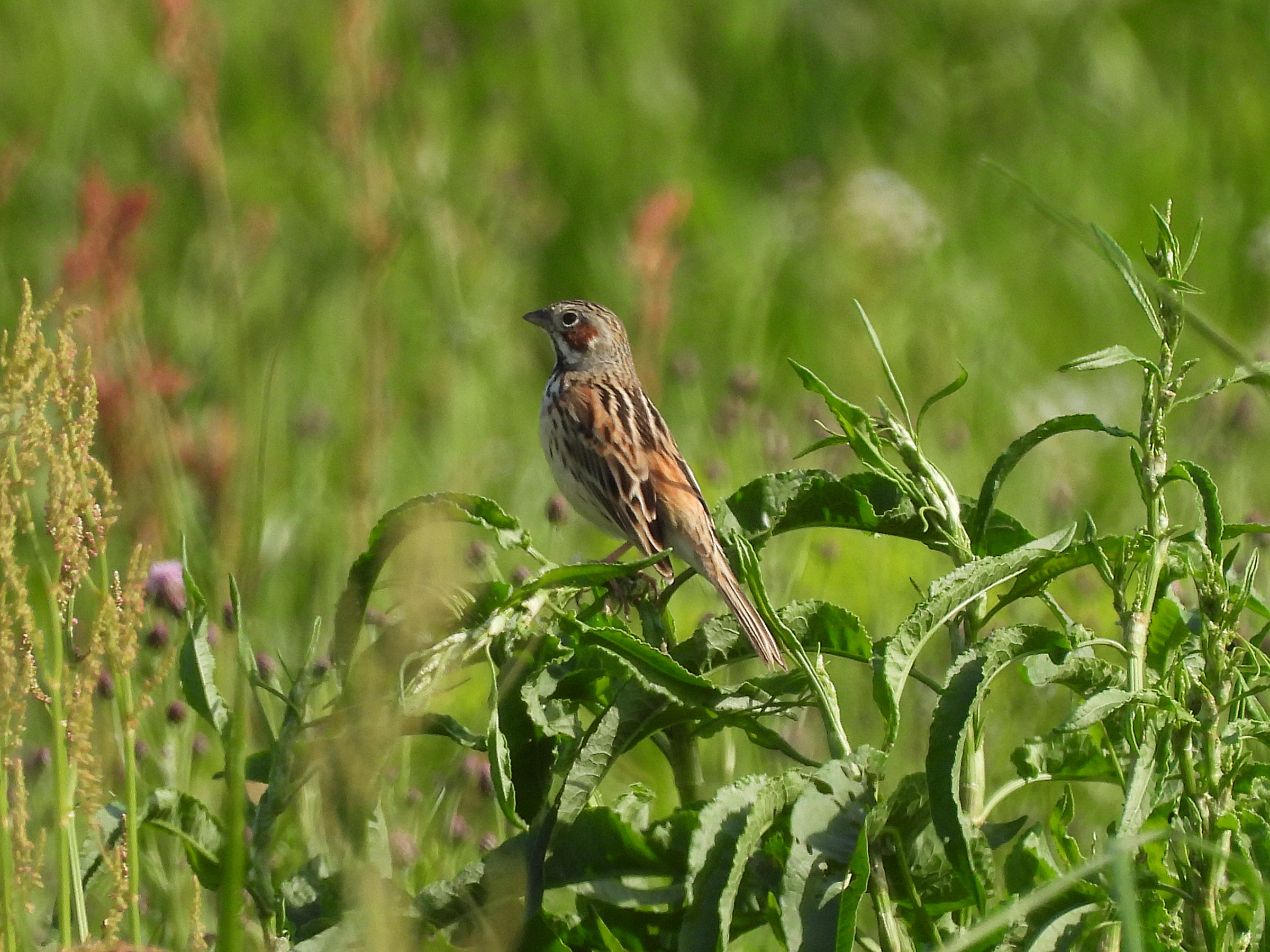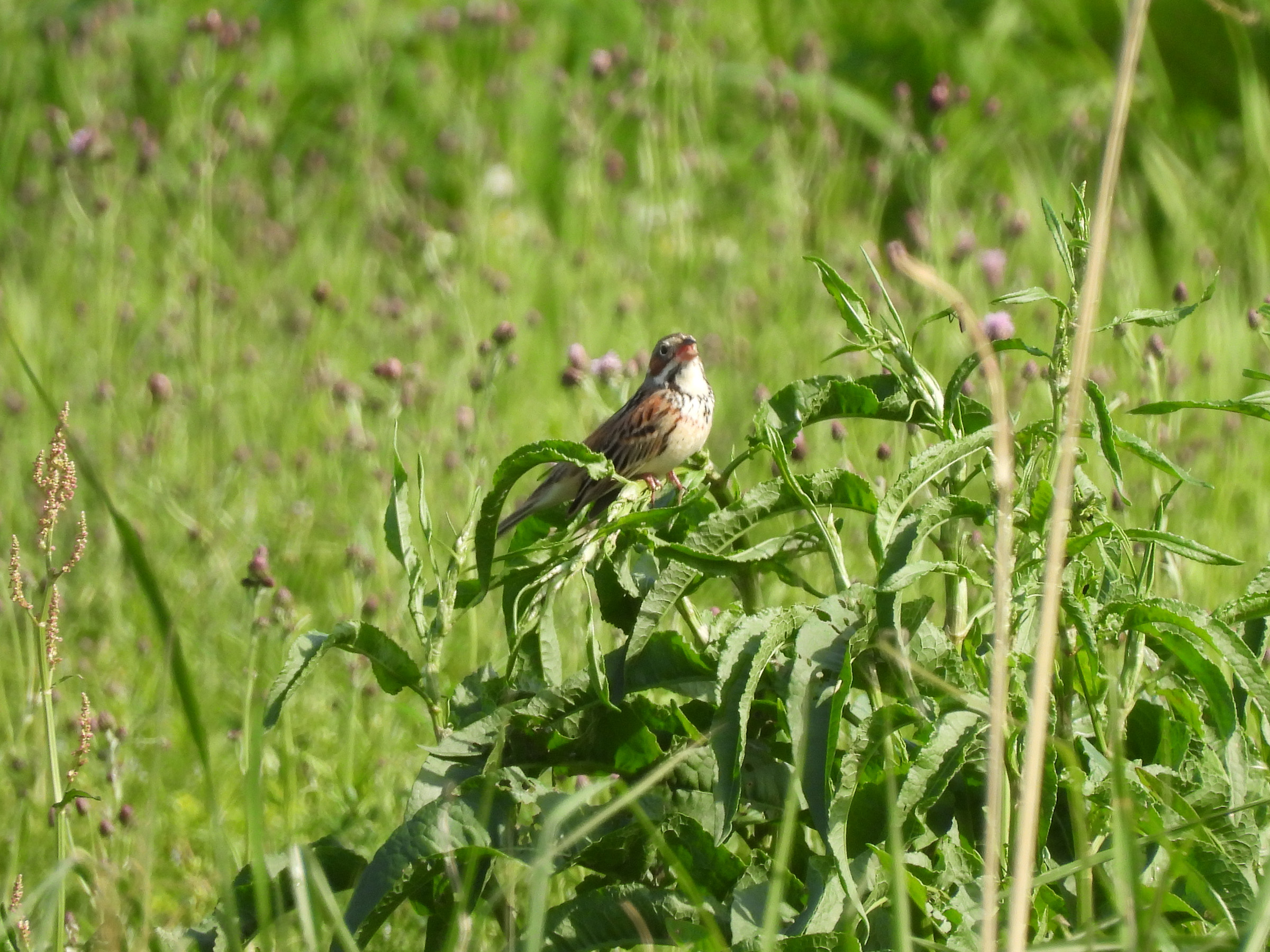 写真からも暖かさが伝わると思います。4月ですが、まだホオアカが居ました。みどりの鳥地区ではいつも枯れ草バックでしたが、緑バックのホオアカになりました。