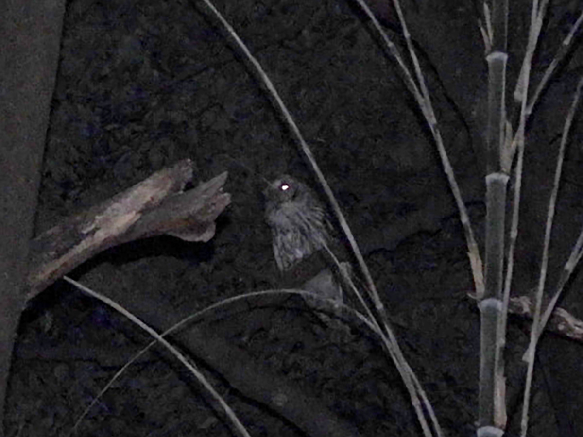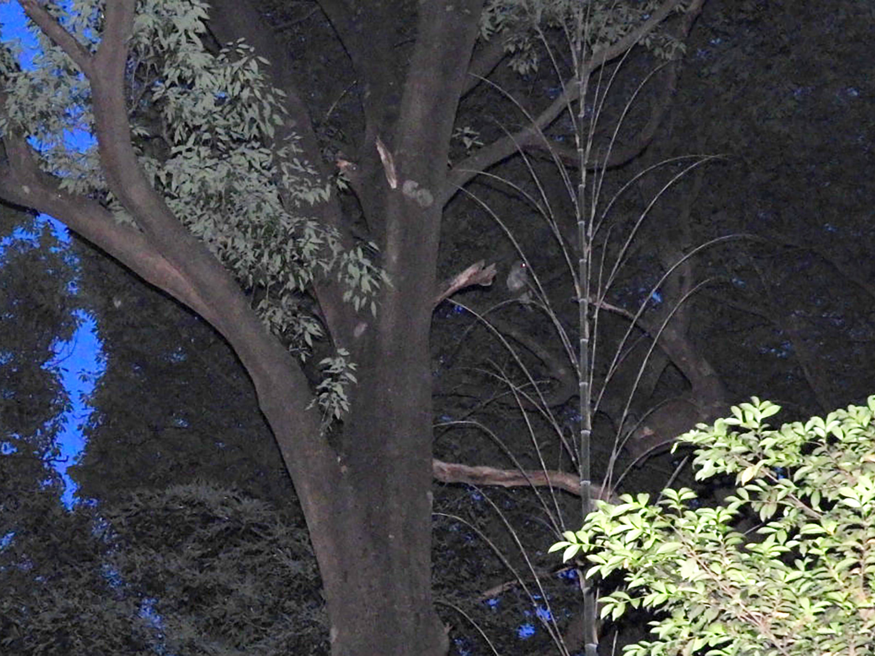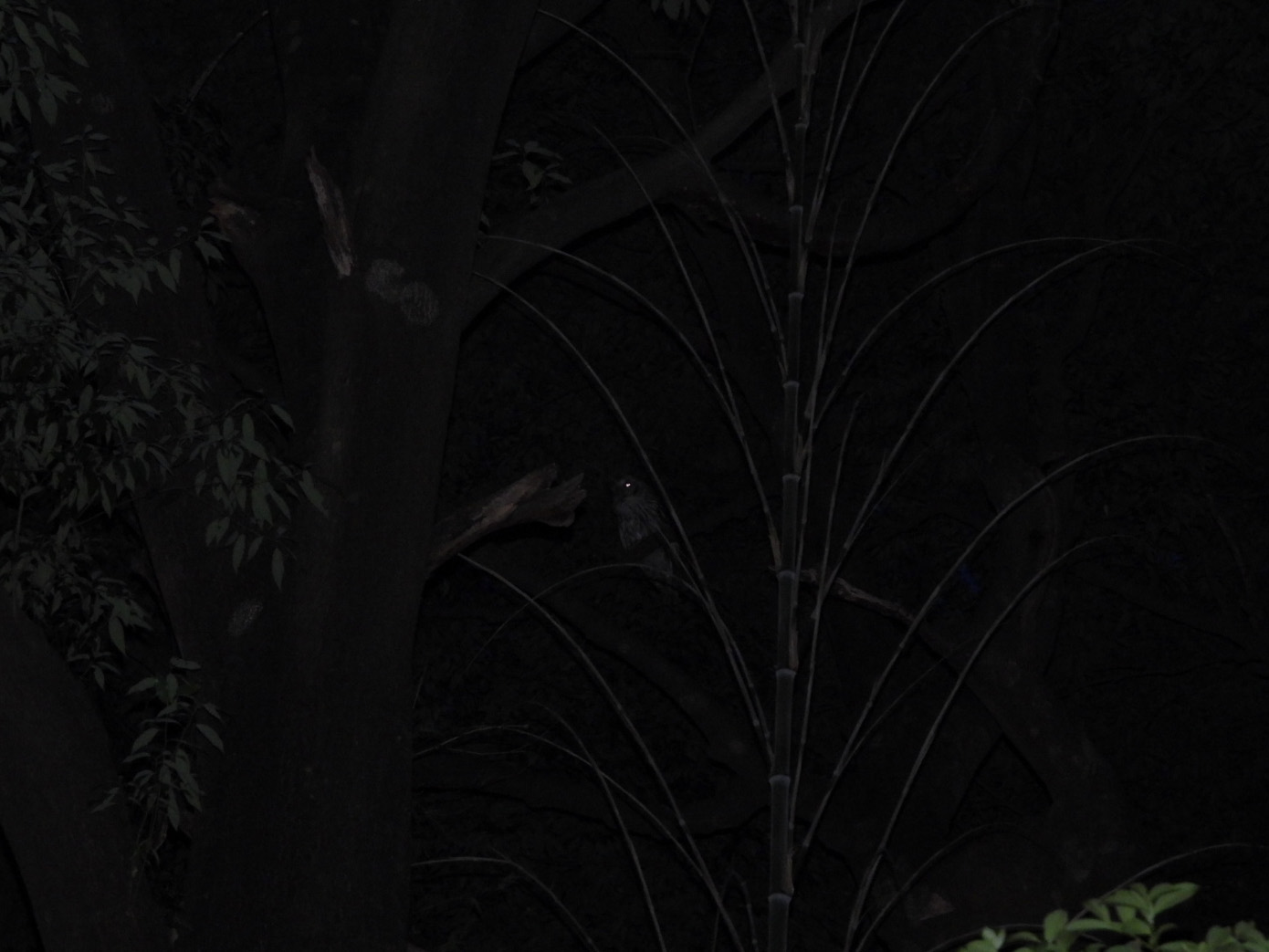 もう1ショット撮れましたが、こちらは目の反射は片目だけ。かなりの近距離です。真っ暗で確実な居場所が見えないため、広めに撮っているからです。これがもうちょっと明るければ、画面いっぱいにフクロウが撮れたでしょう。まあ、それは贅沢。