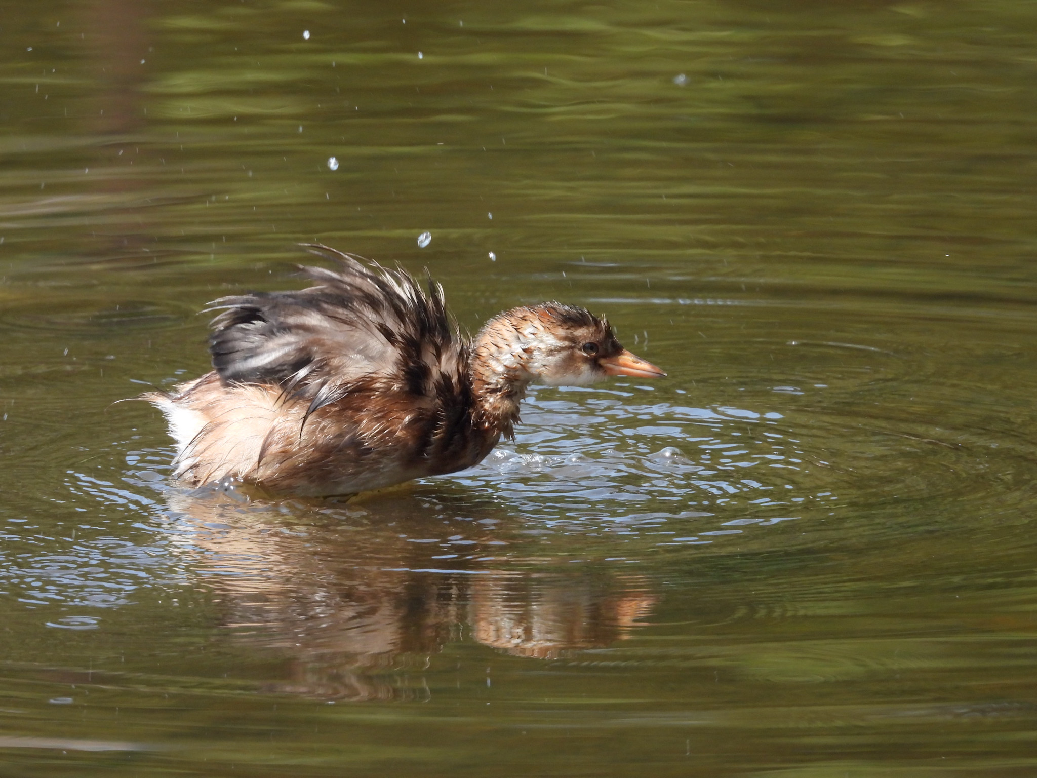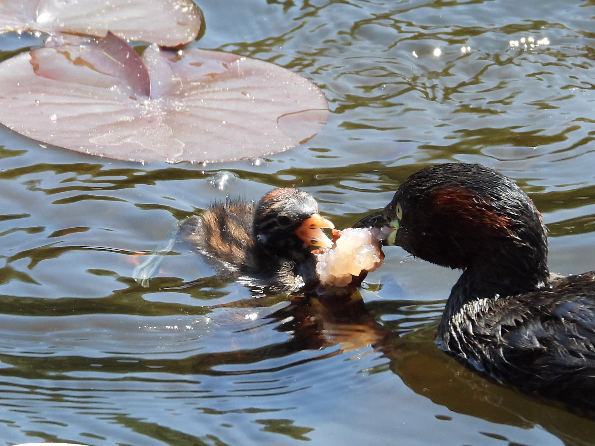 カイツブリの様子を見に行ったところ、かなり成長した雛もいれば、いまだに親鳥の背中に乗っている雛もいるようでした。親鳥の持ってくる餌が大きすぎて吐き出してしまう様子も伺えました。