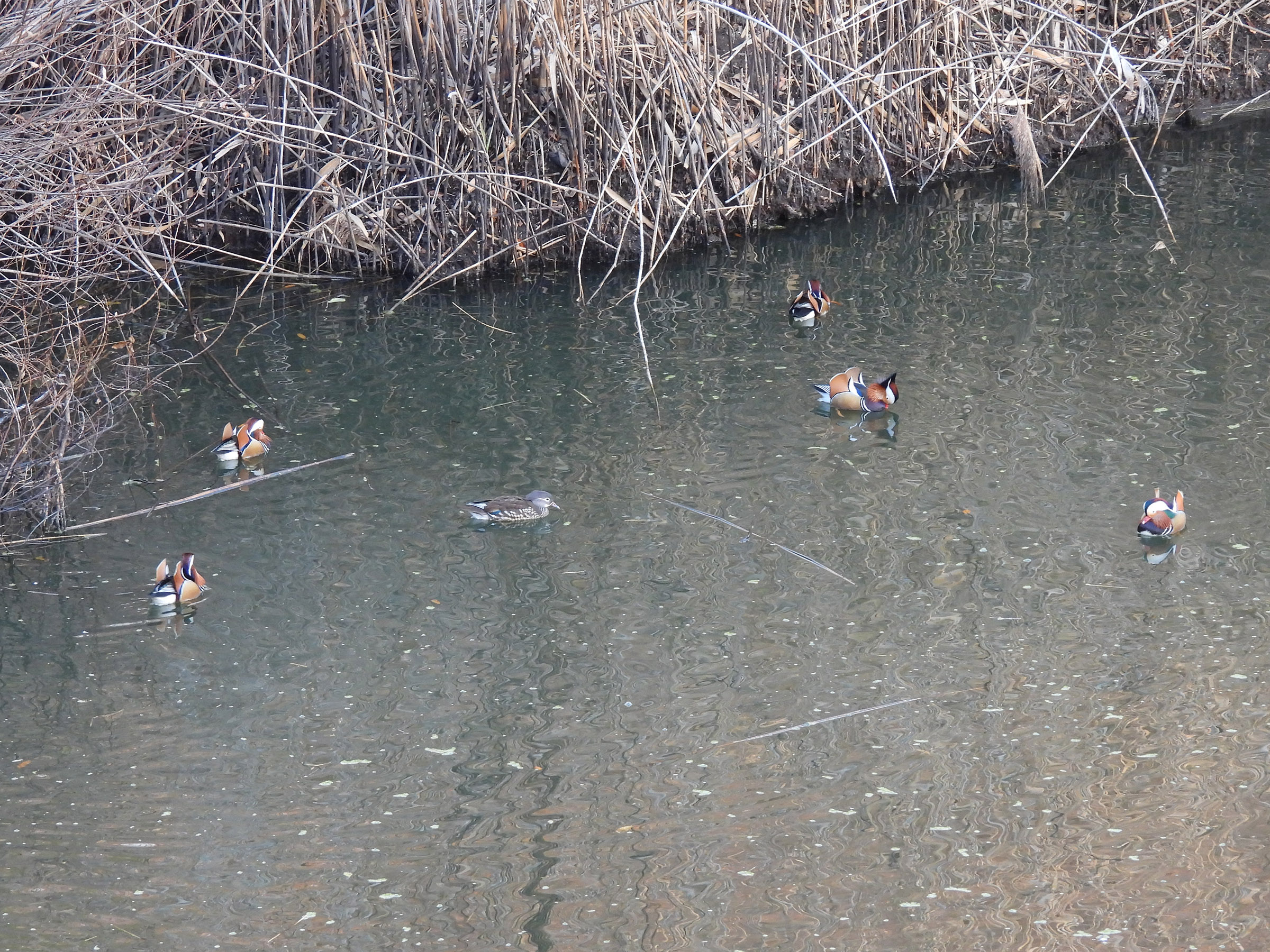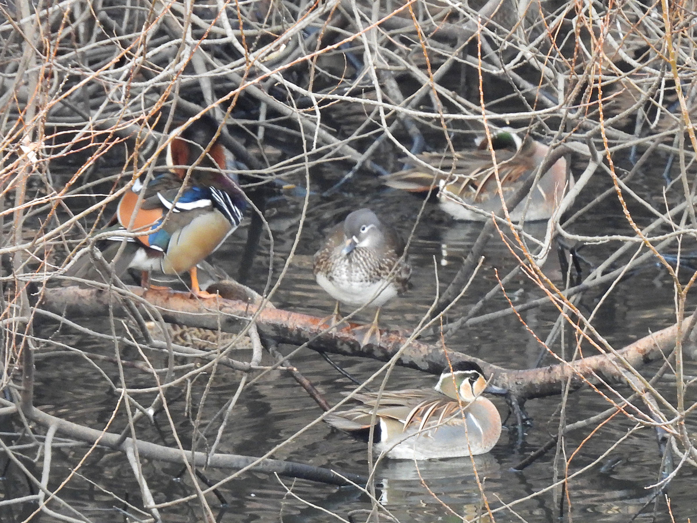 枝でわしゃわしゃですが、3羽確認できます。そしてここはオシドリで有名な奈良山公園の雨水調整池です。
