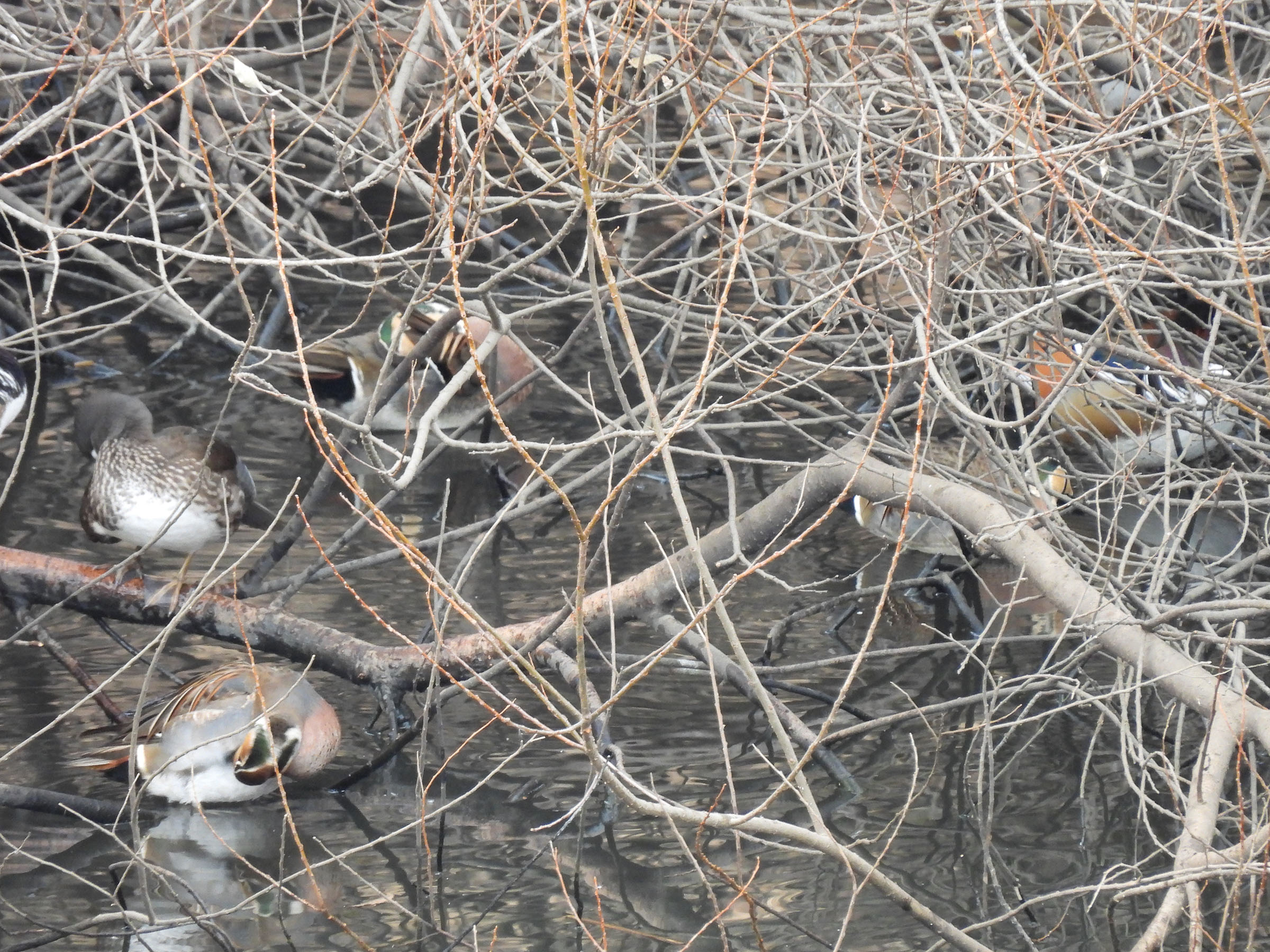 トモエガモが3羽確認できました。未確認雌も含めると4羽です。ところによっては数万羽が渡来するトモエガモですが、みどりの鳥地区では会えると嬉しい比較的レアなカモ類です。写真は枝被りまくりですがエントリーします。