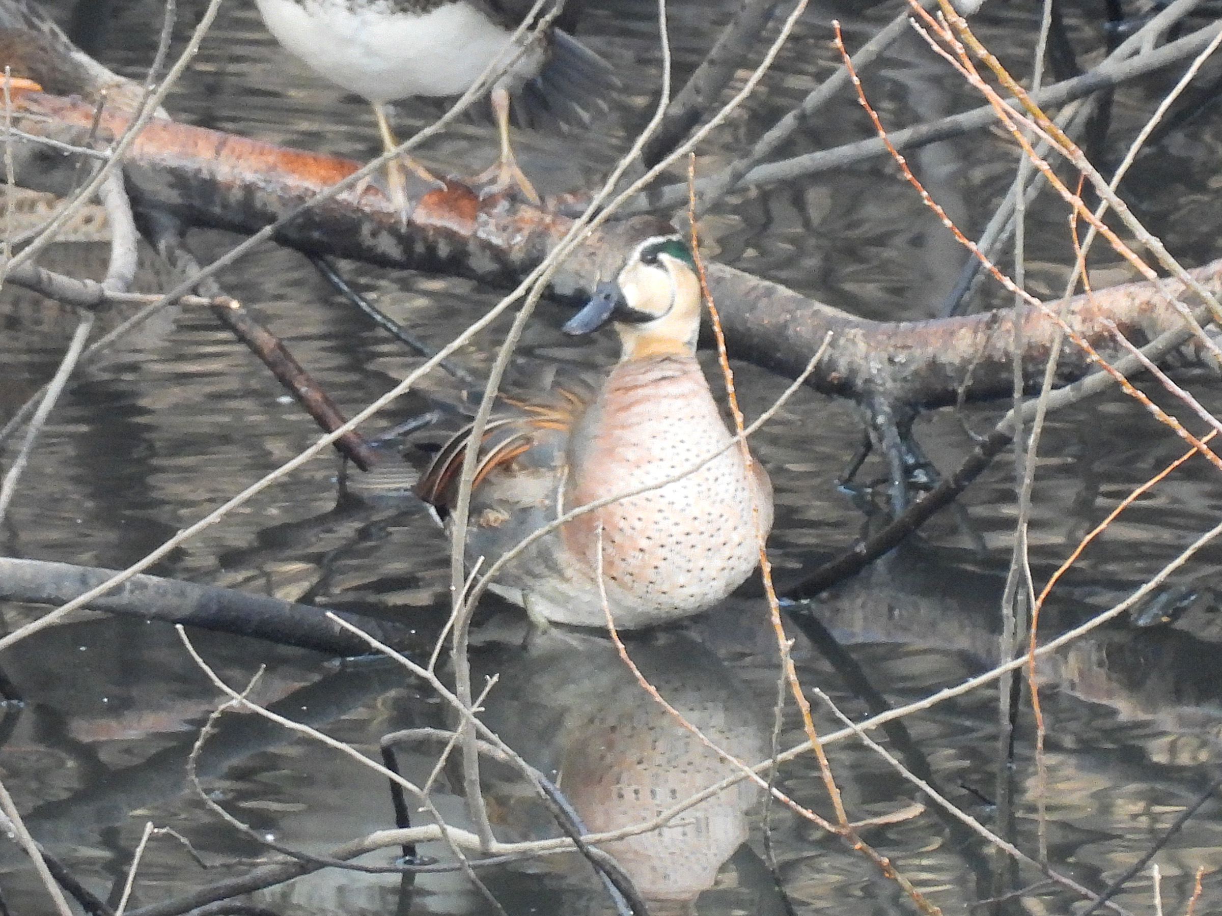 オシドリより一回り小さいトモエガモ。羽繕いしていて、枝陰の中から出てきそうで出てきません。