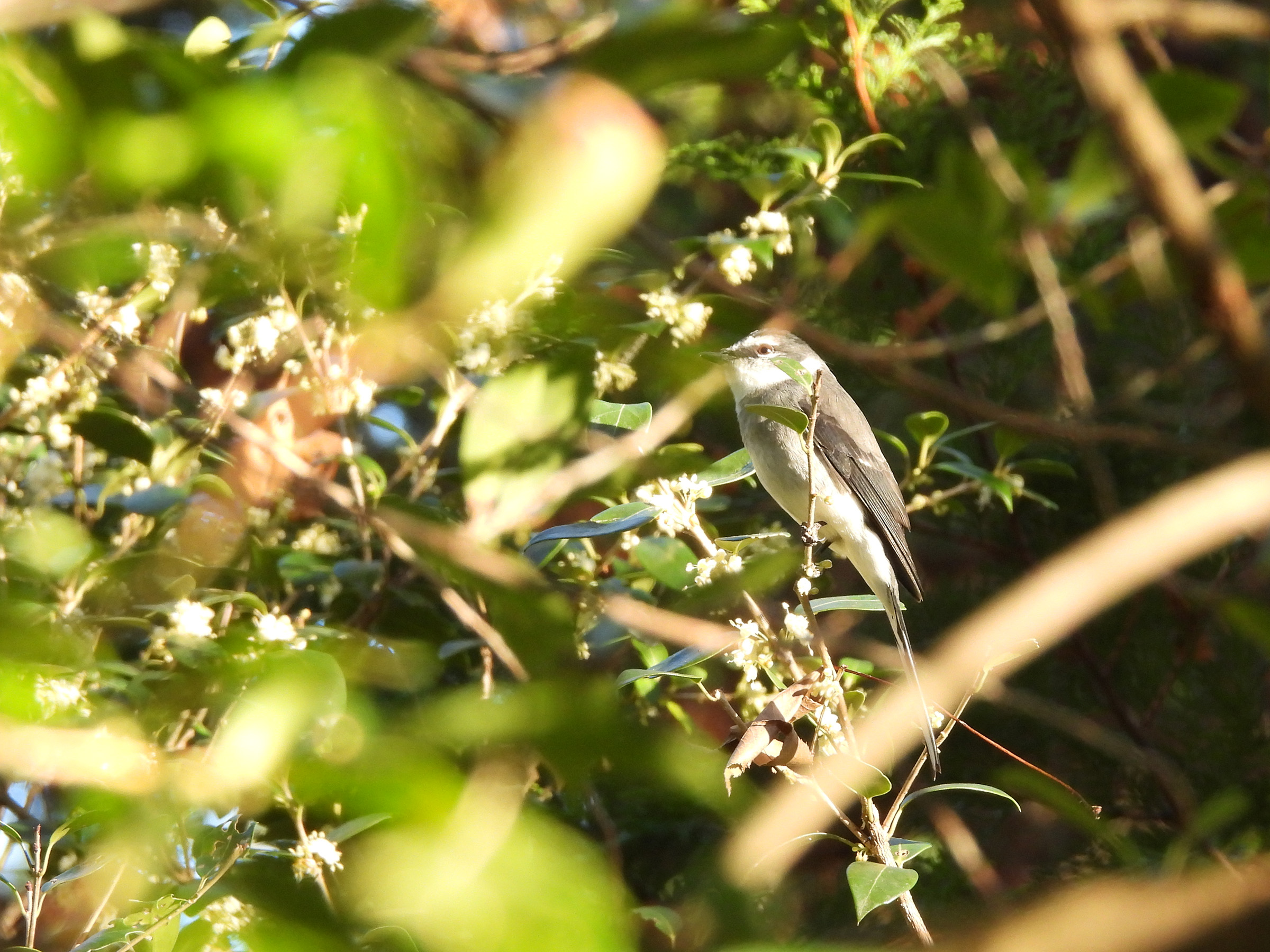 旭を浴びているので、虹彩が茶色に見えます。胸の灰色や頭部のおでこの白帯が狭め、という特徴からリュウキュウサンショウクイと判断です。