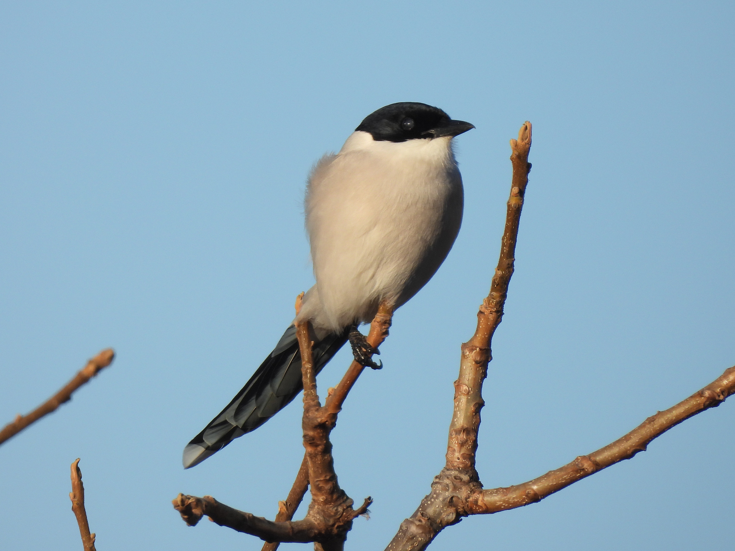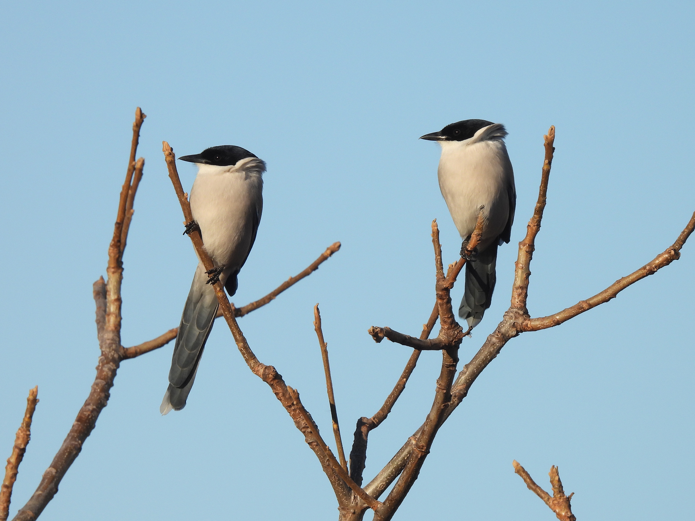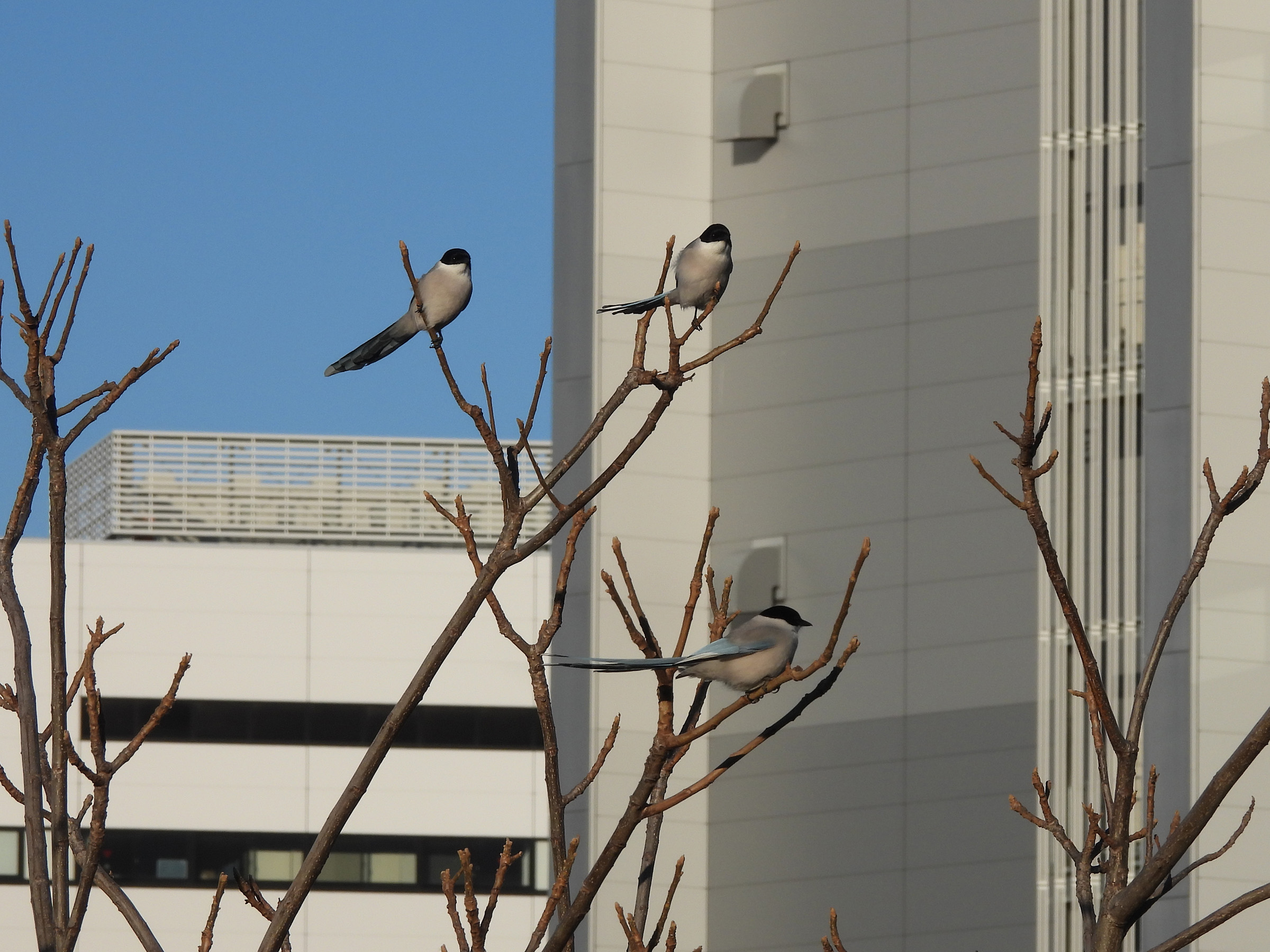 オナガが小群で現れて、枝に留まりました。写真では3羽ですが、少なくとも10羽は居たと思います。