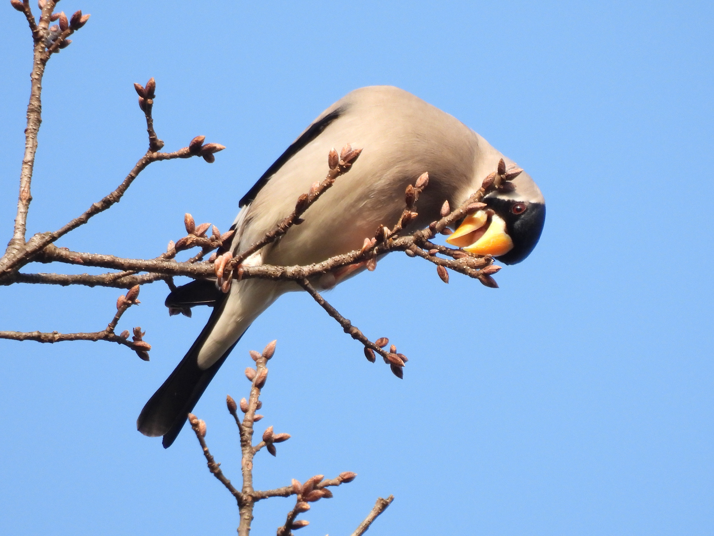 新芽を枝ごと食べちゃってません? さすがこの大きな嘴。小枝もなんのその?この大きな嘴ですが、イカルには「豆回し」の異名があり、器用に芽だけ食べているのかも?