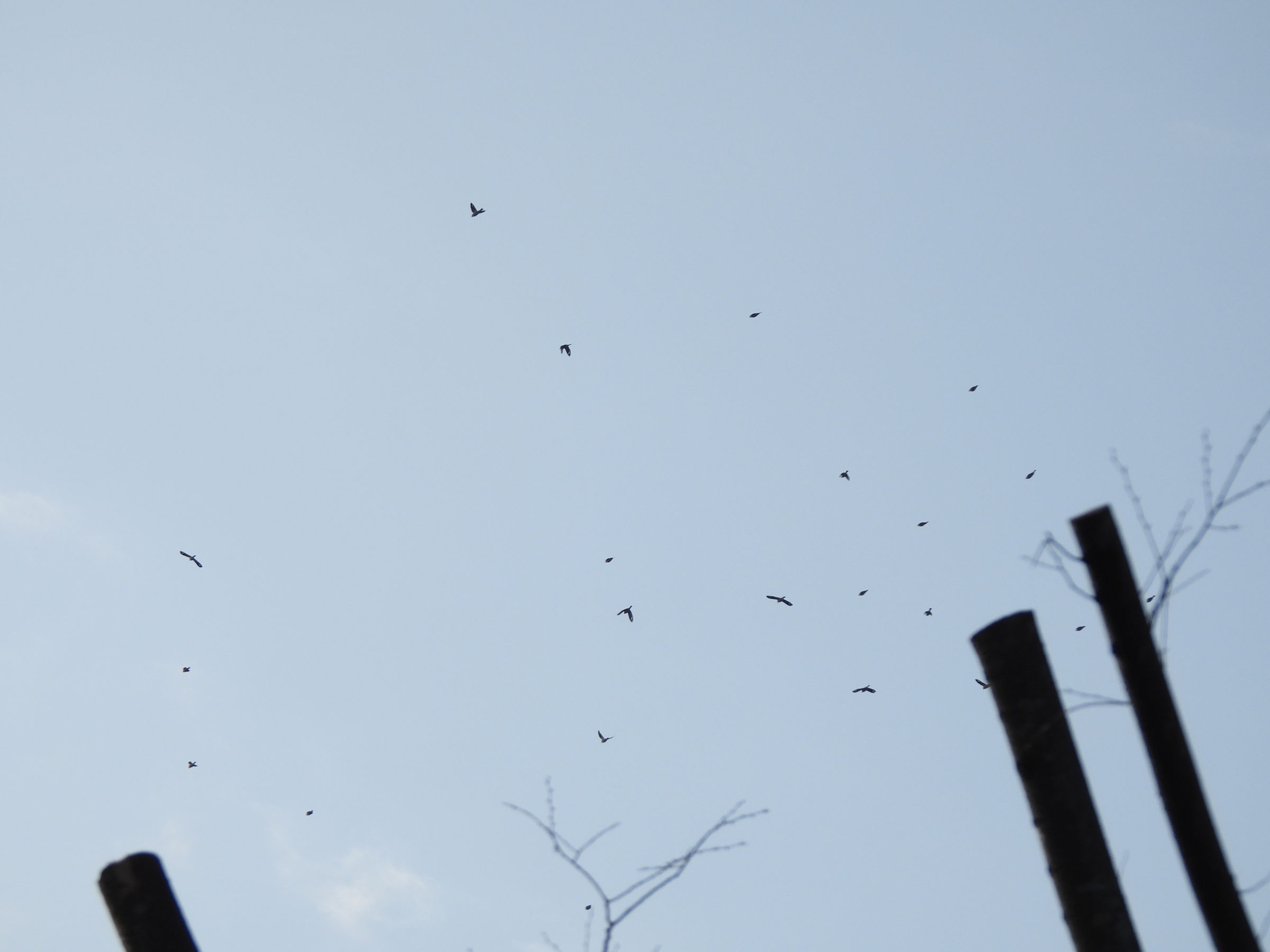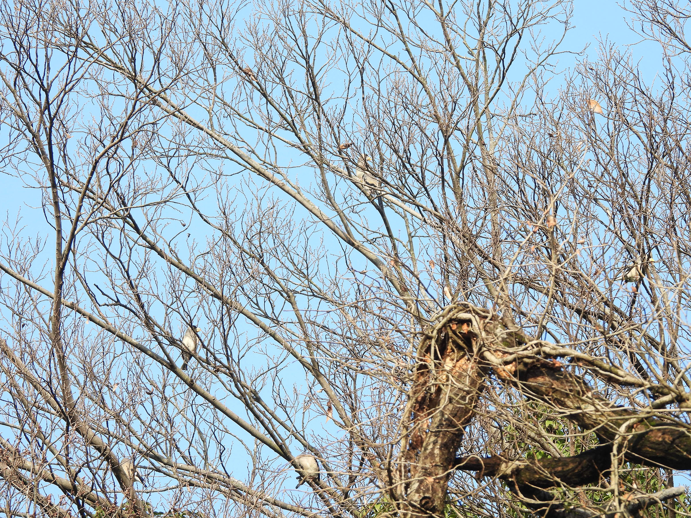 イカルは群れで行動します。この前にも、上の写真と同じくらいの小群が飛び去っていきました。全体としては、50羽以上はいたと思います。