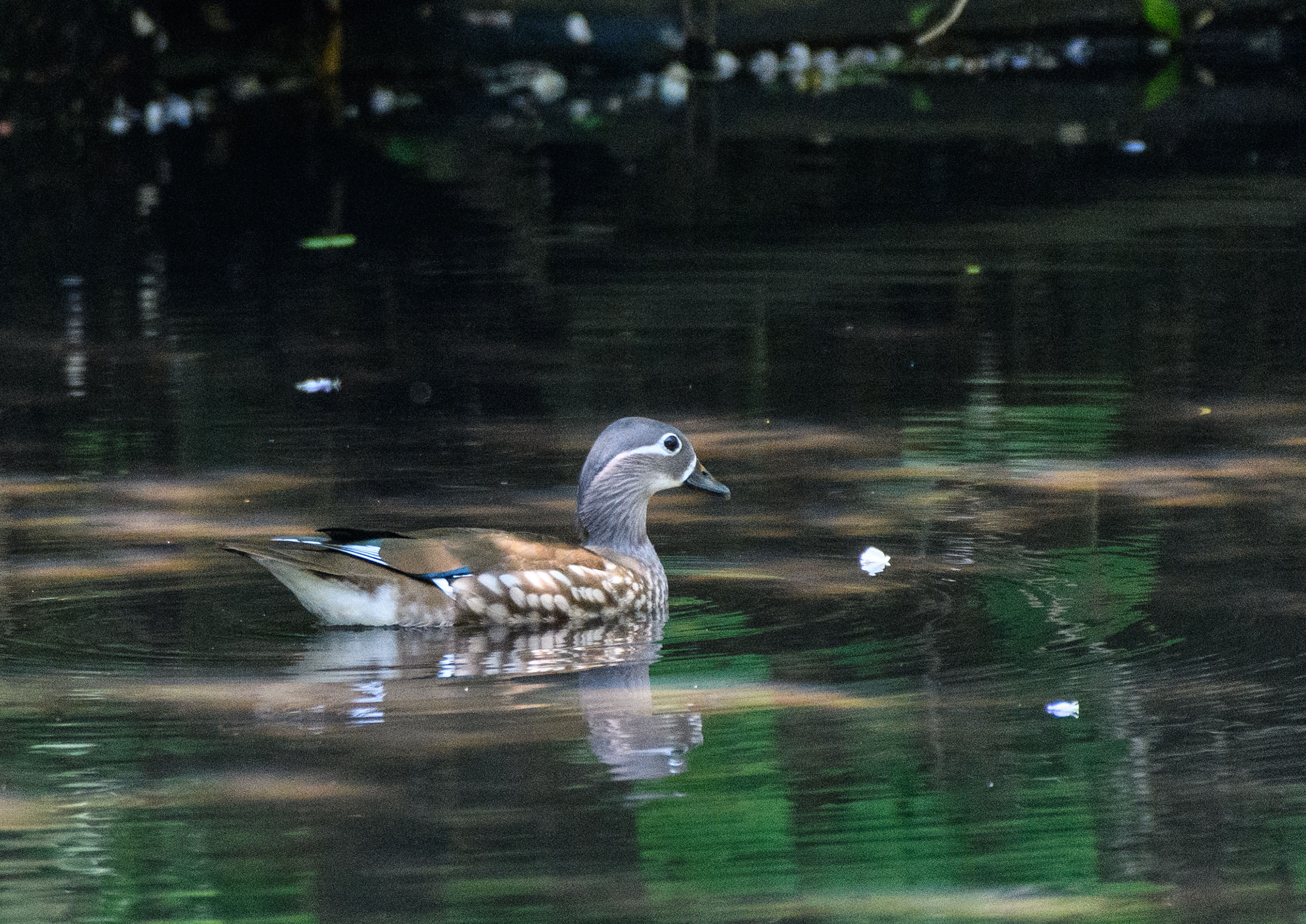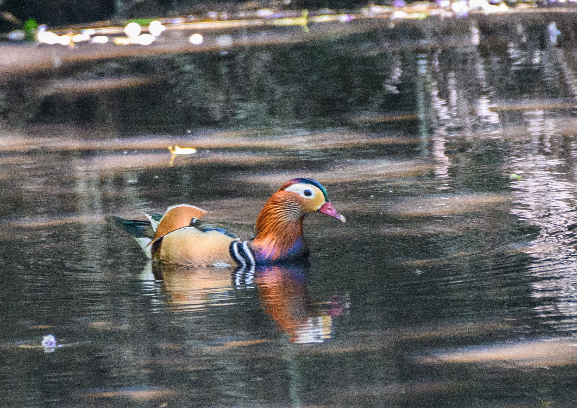 帰路「カワセミの池」を覗き込むとカルガモらしき姿を確認。カメラで確認すると、なんと「オシドリ」のツガイでした。静寂に包まれた池で優雅にのんびりと泳ぎ回る姿を観ていると、何だかとてもいい気分になりました。
