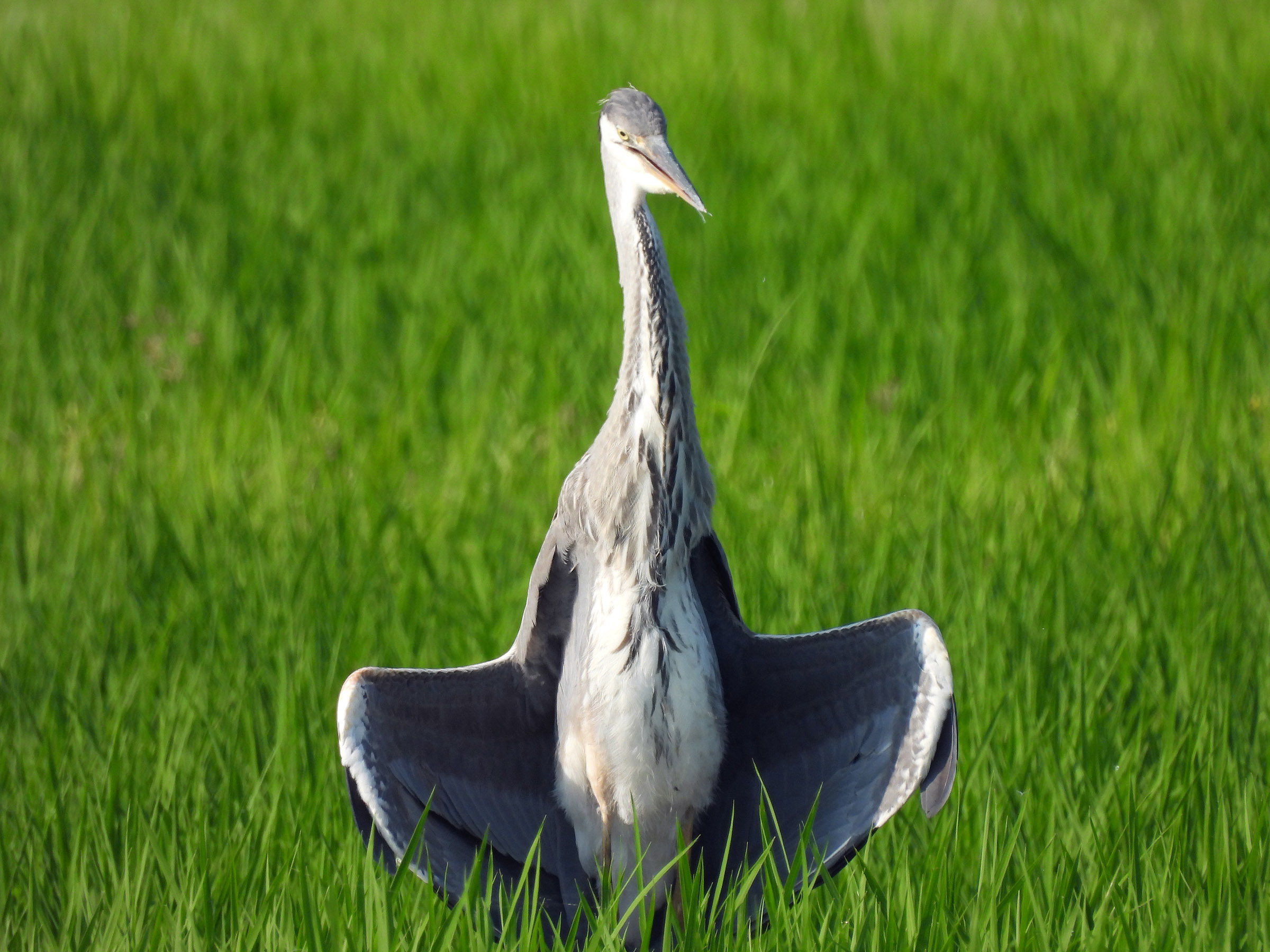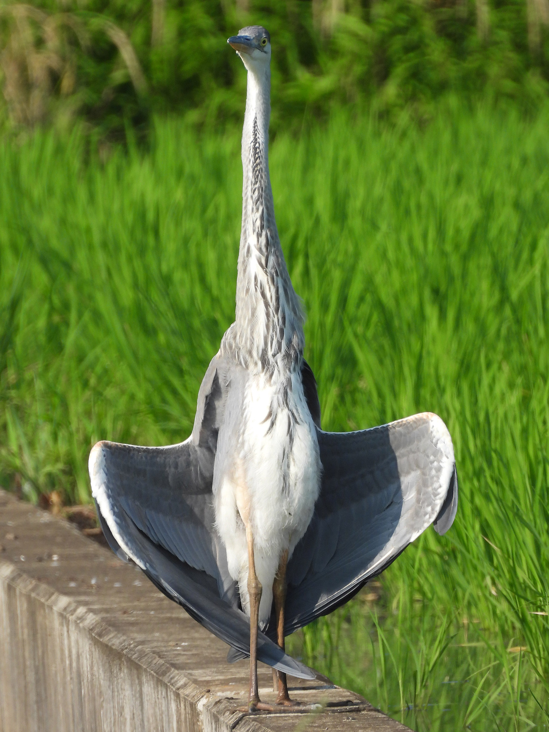 アオサギ若@羽を広げて喉をプルプル【動画あり】