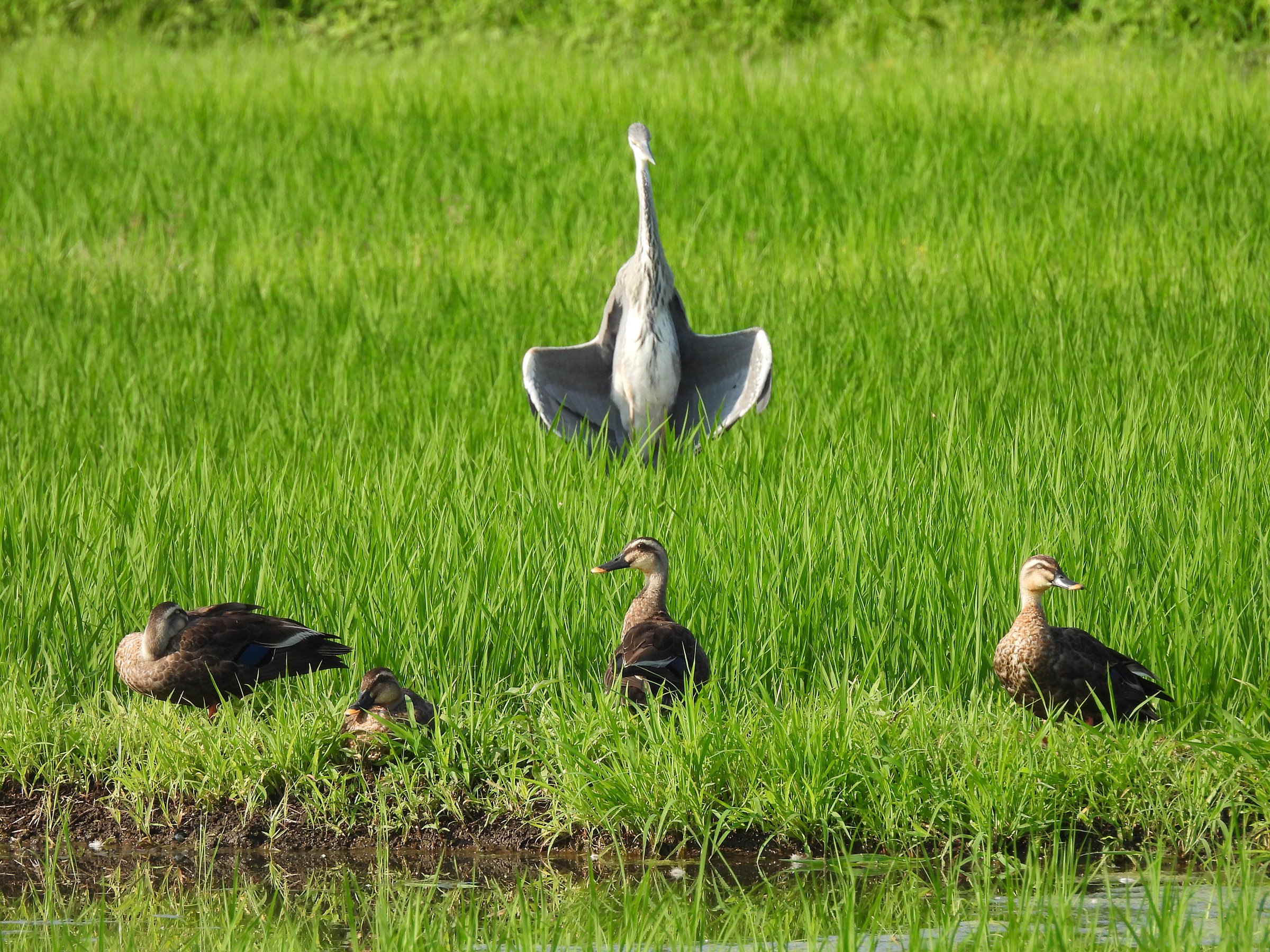 カルガモたちの後ろで守神のごとく羽を下ろすアオサギ若鳥。何となく面白い絵になったので。
