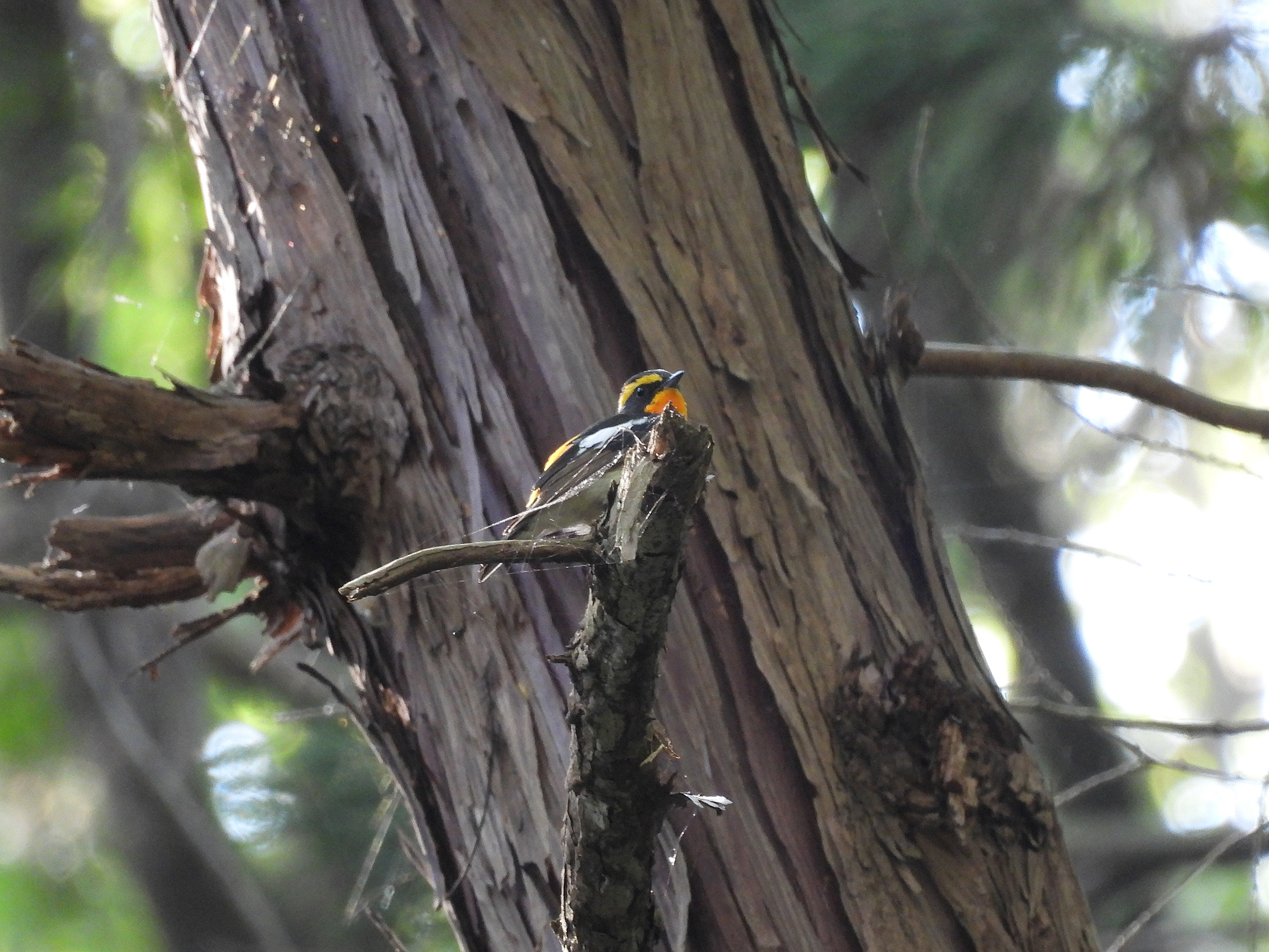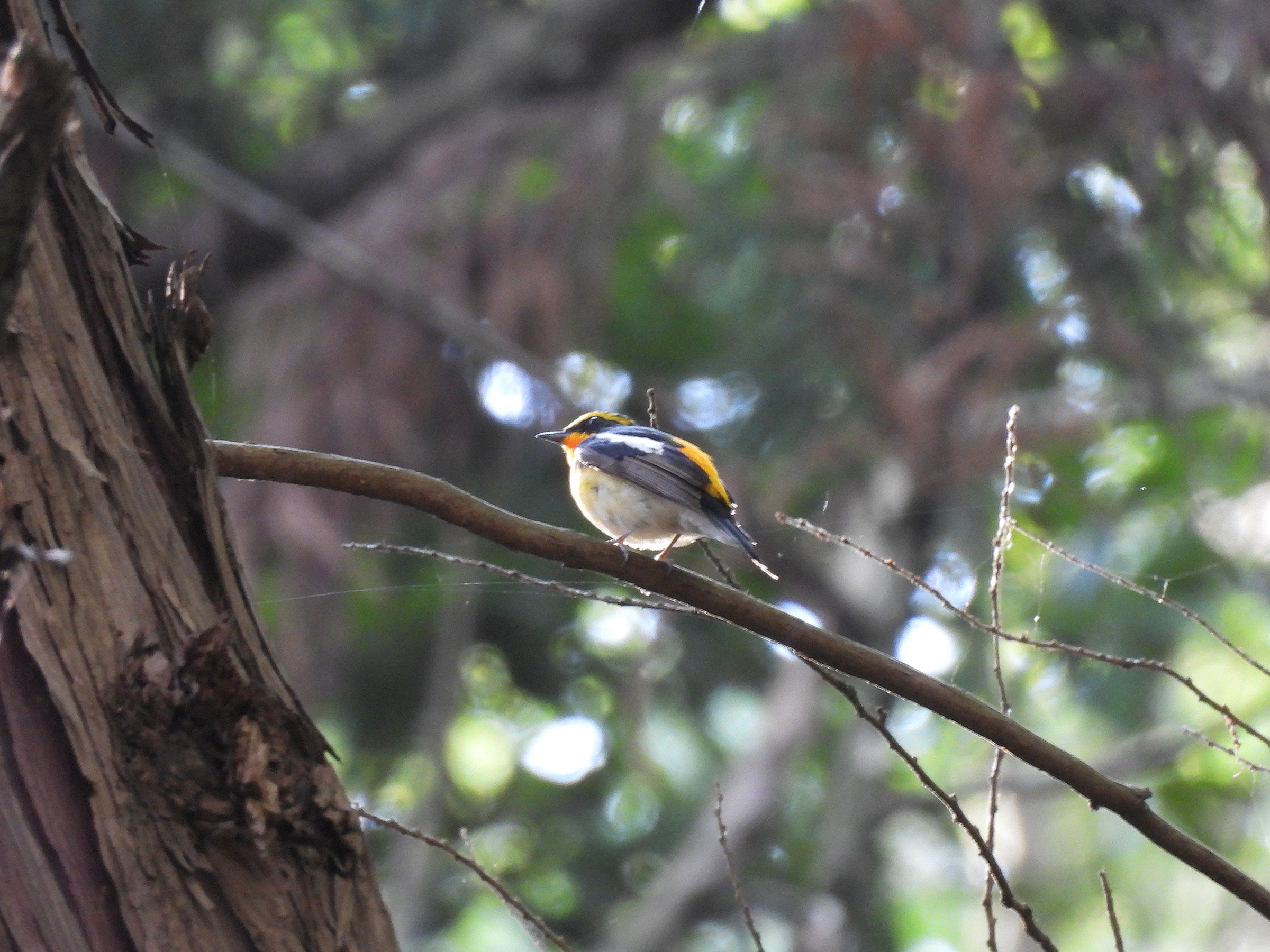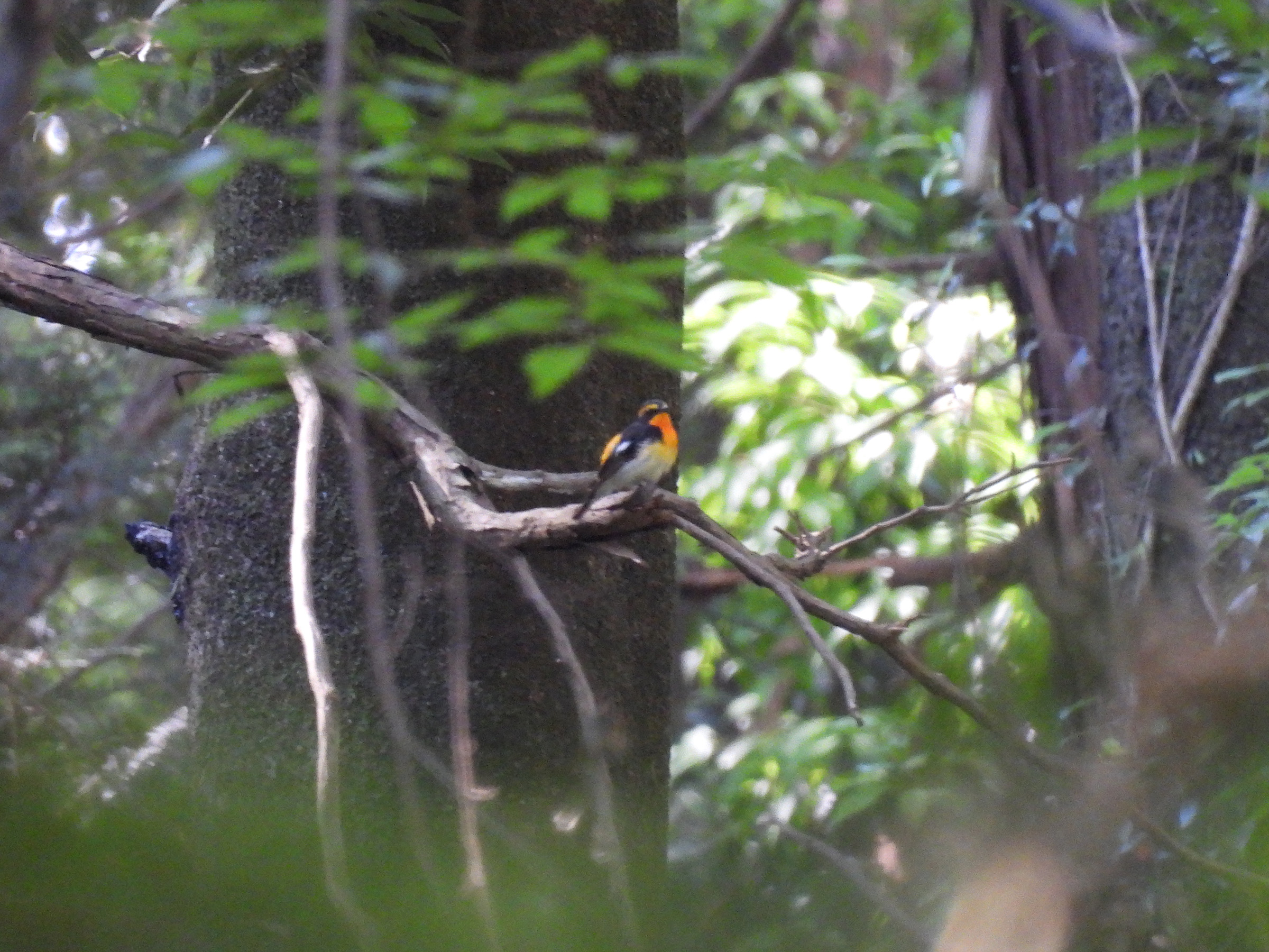 こちらは、上記とは別の少し離れた場所にいたキビタキ雄。遠かったです…。同個体がたまたま移動してきて、私の前に2度現れたのか断定はできませんが、こちらは少しオレンジが濃いような…。