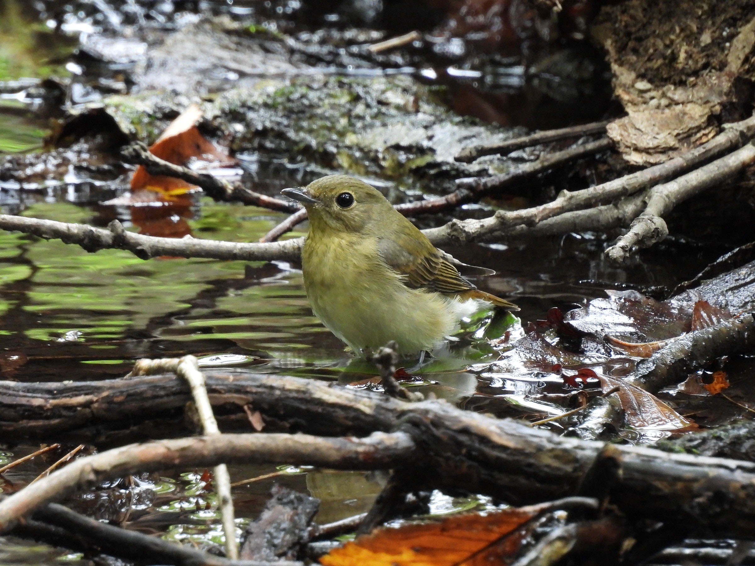 キビタキの雌成鳥でしょうか?黄色被りが強いですが、曇天でちょっと薄暗い森でした。