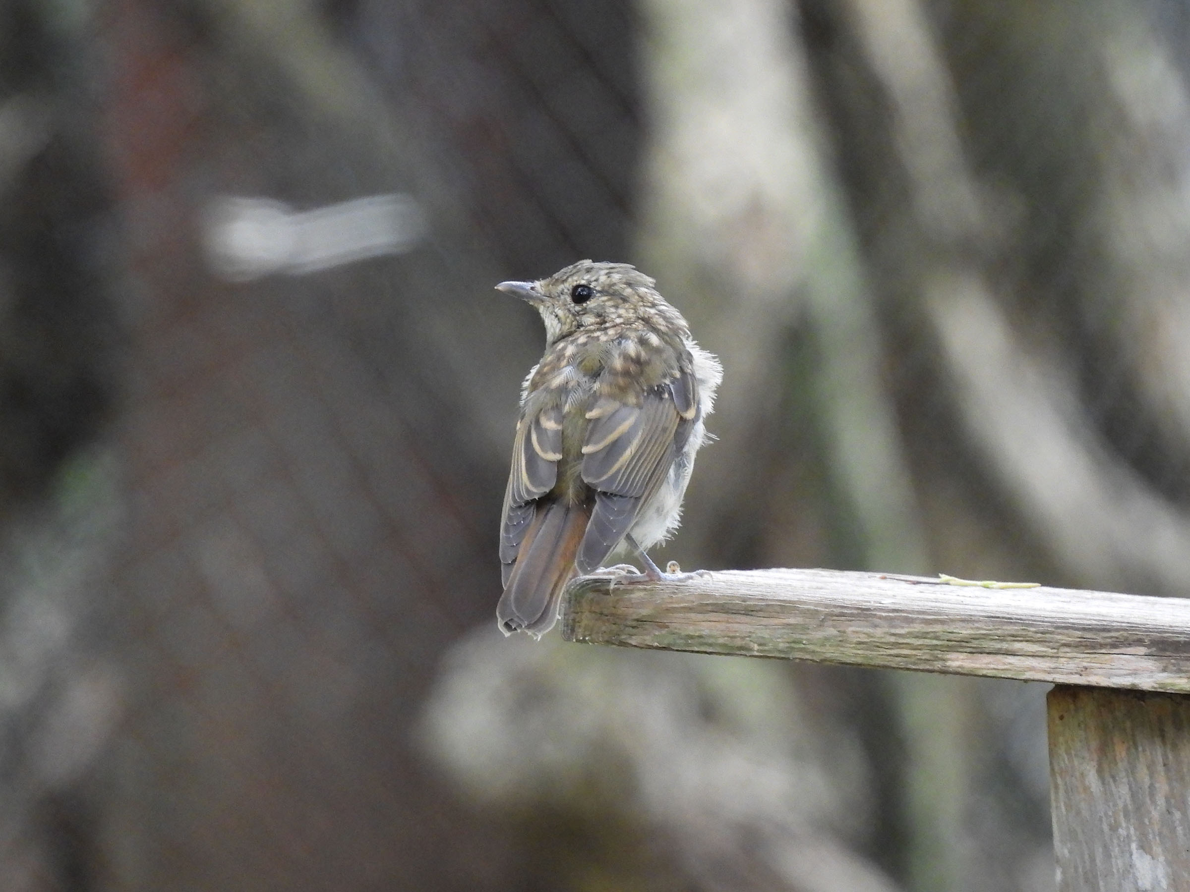 雨覆と3列風切羽の先端にバフ斑(白っぽい部分)があるのは、キビタキ幼鳥の特徴とされます。ちょっとオリーブっぽい色味も感じるので、オオルリ雌の可能性はないかなと。